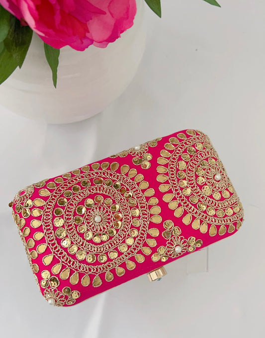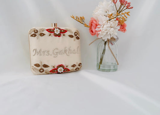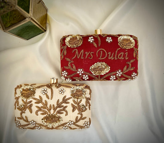 Please allow 4-5 weeks for personalized clutches & boxes depending on the type of work and then shipping. They can be customized in any colour and embroidery. Different clasps are available depending on market availability.