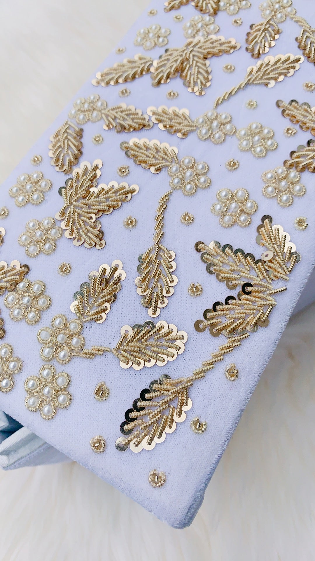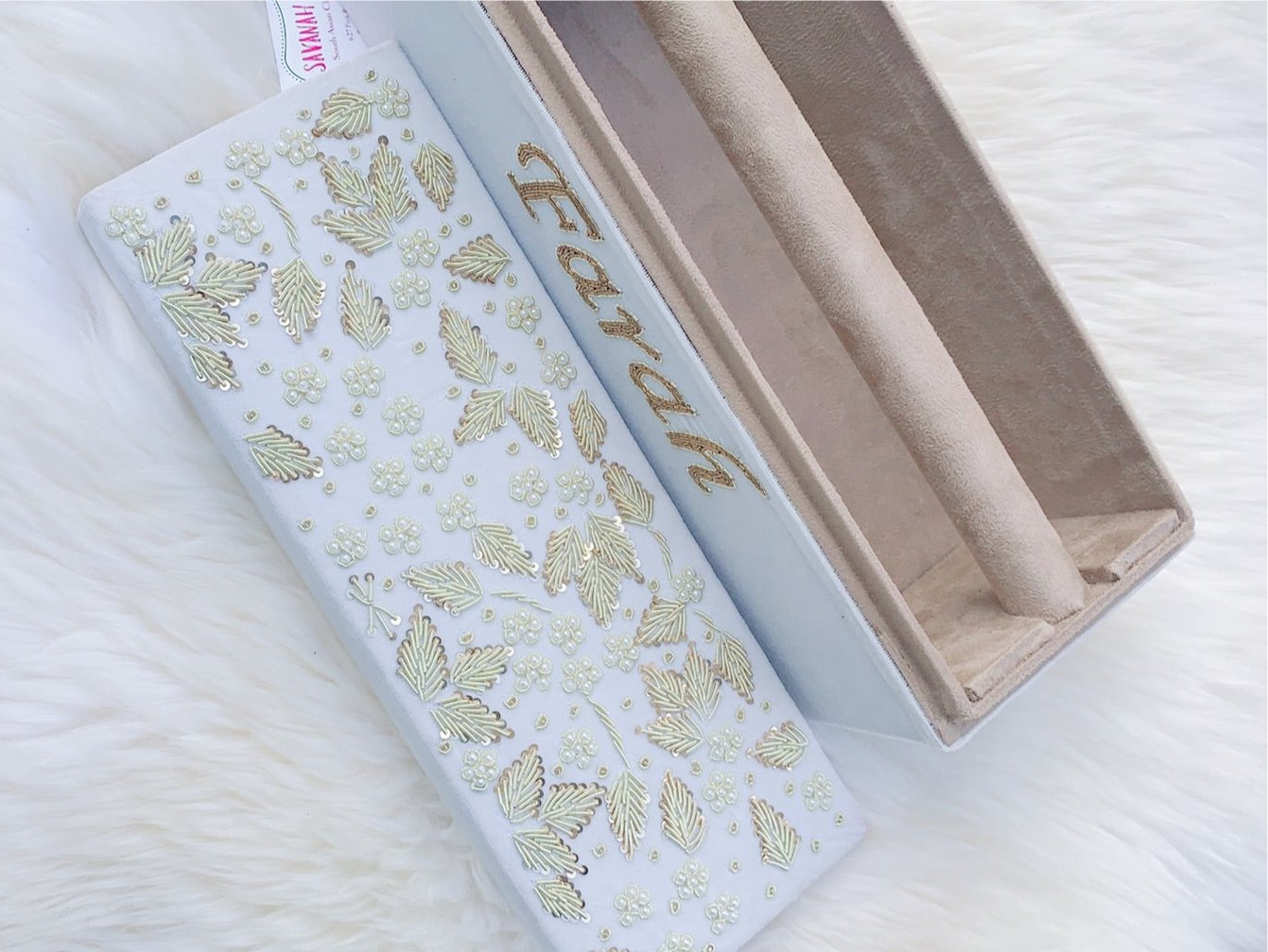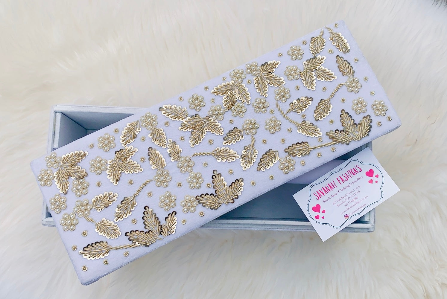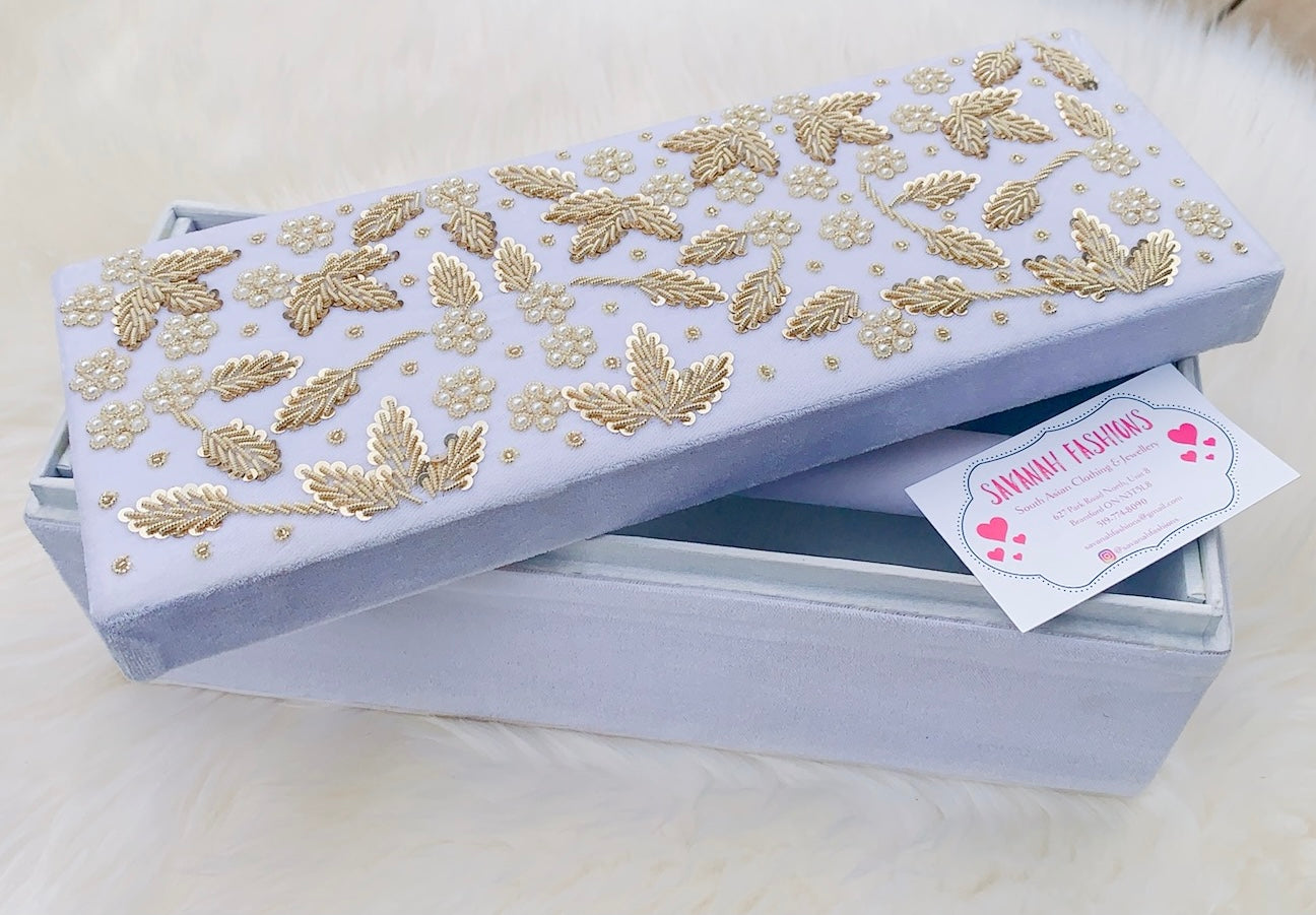 Hand embroidered on velvet with suede interior or silk interior. Lets you easily store your bridal chooda or bangles.