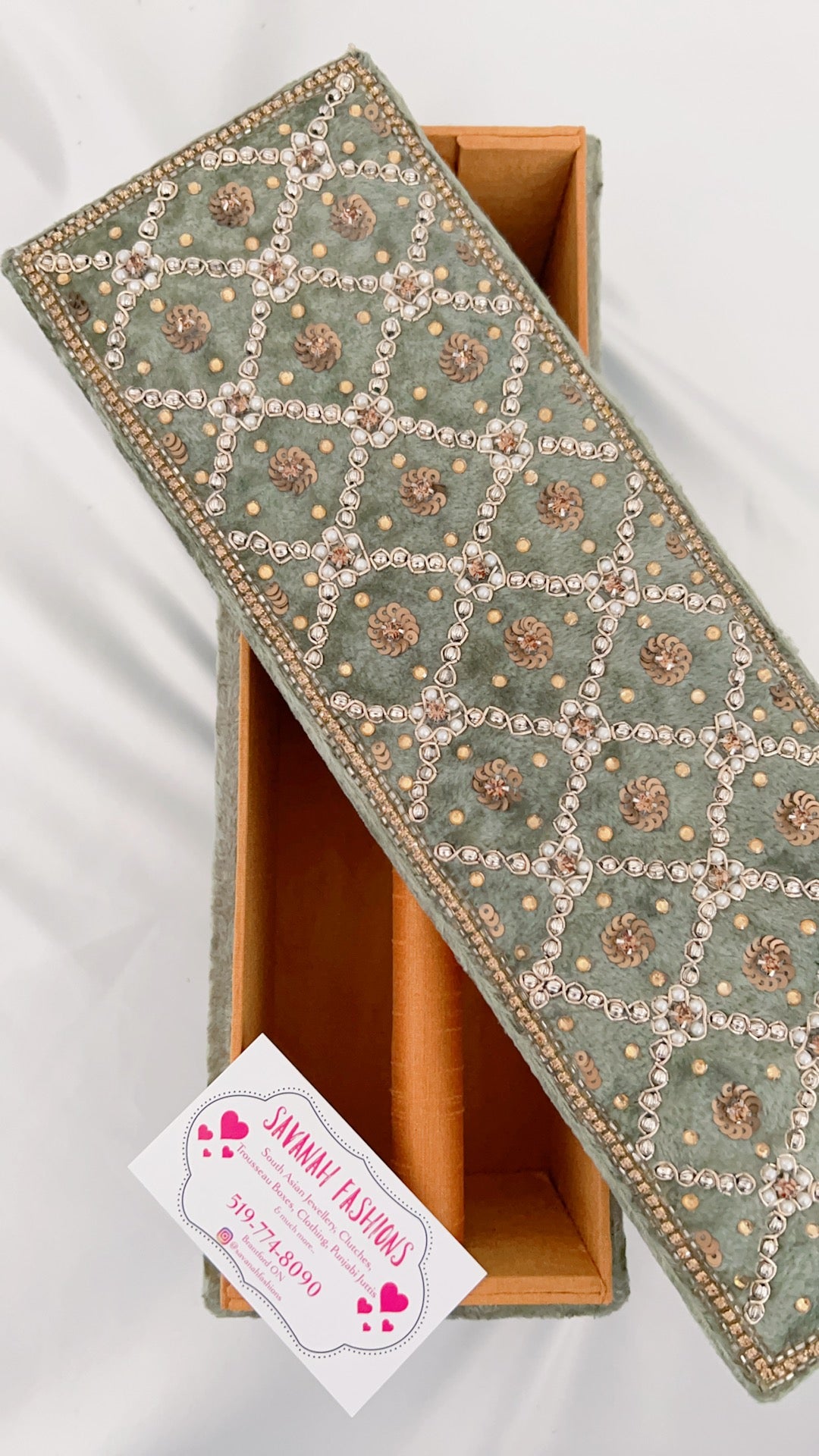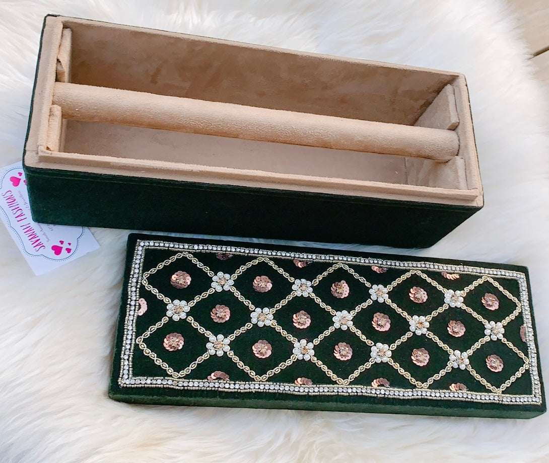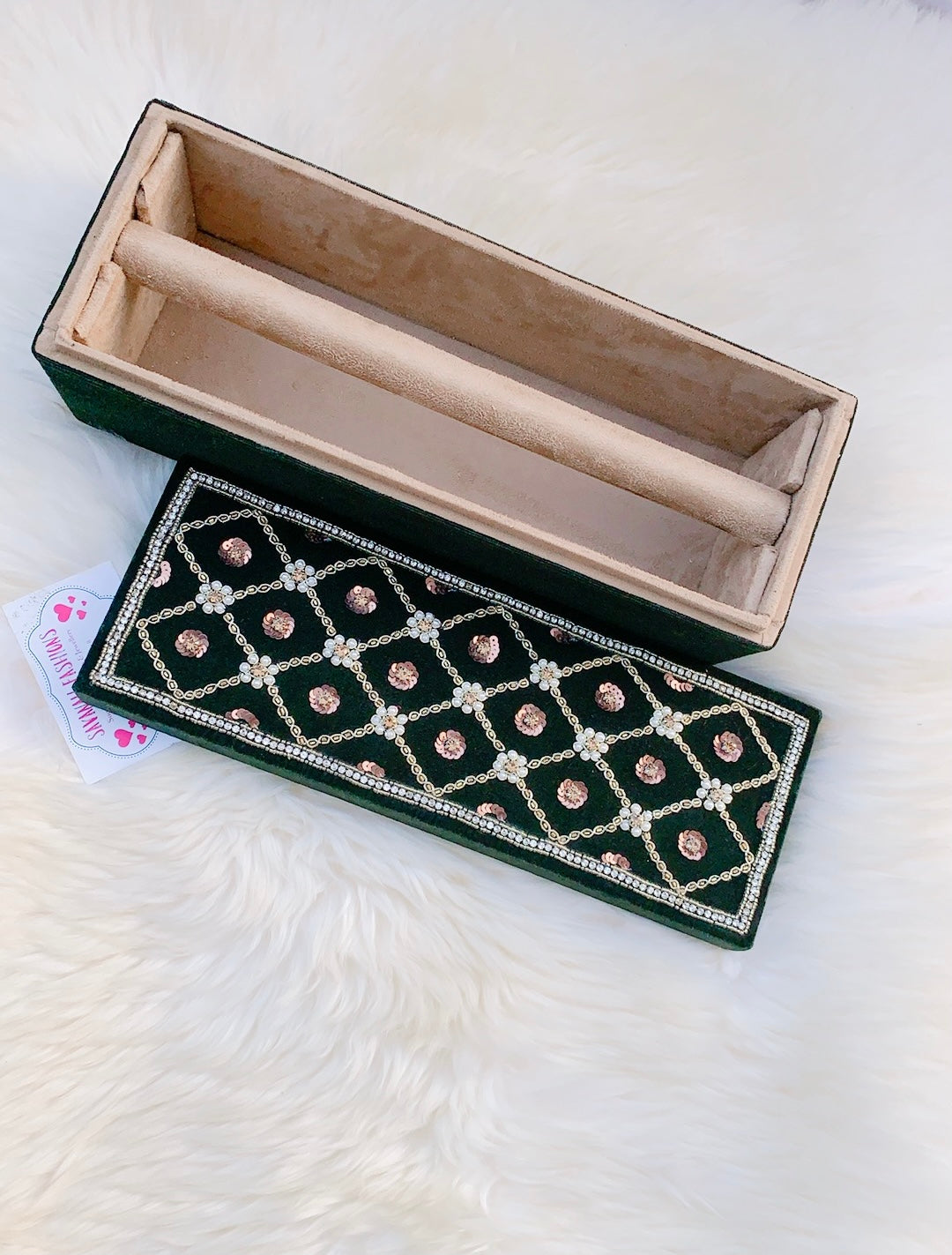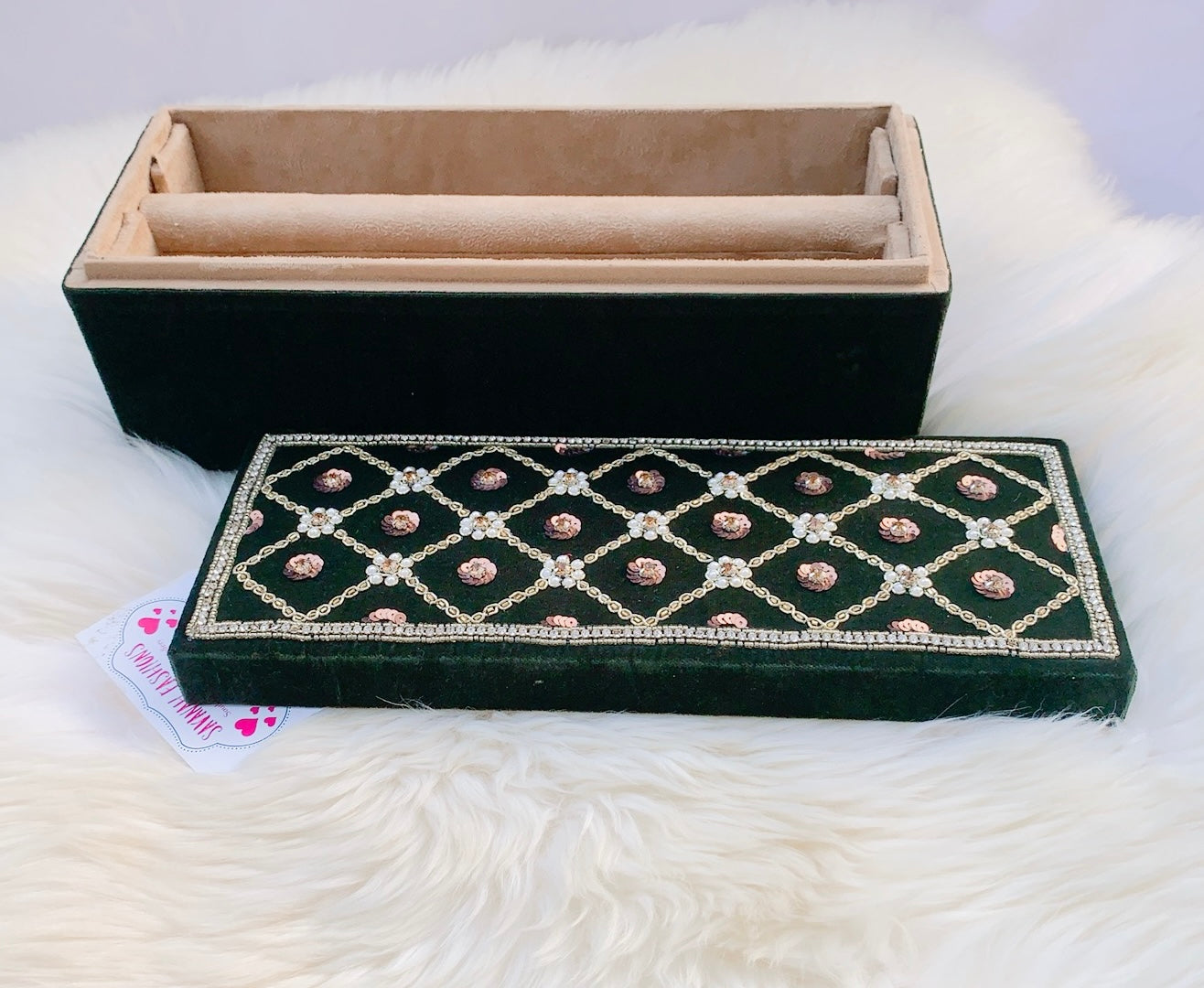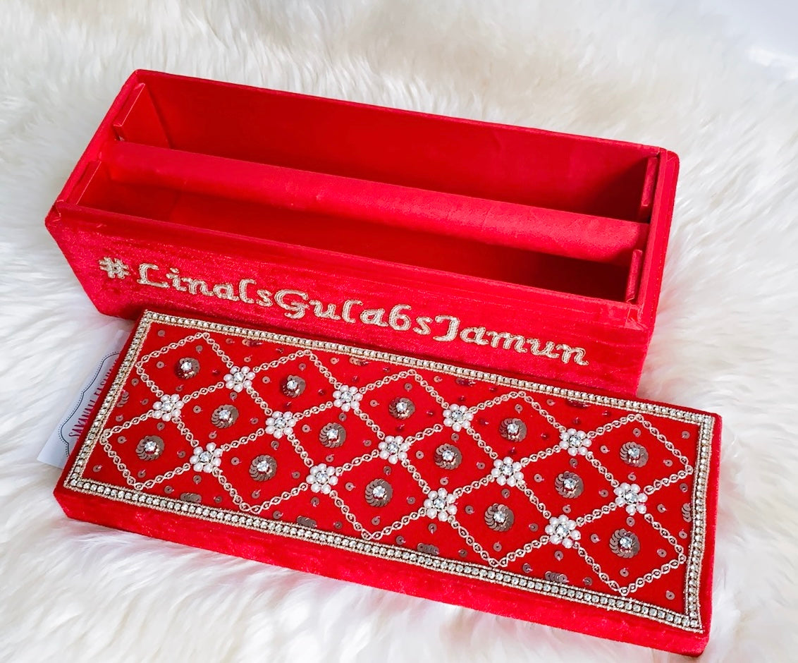 Hand crafted with high quality velvet exterior and suede interior. This hand embroidered chic design makes for a perfect keepsake of your expensive bangles or a great gift for any bride. Our bangle boxes can be made in any colour with your personalized name or hashtag.