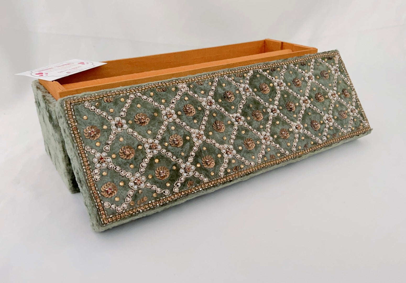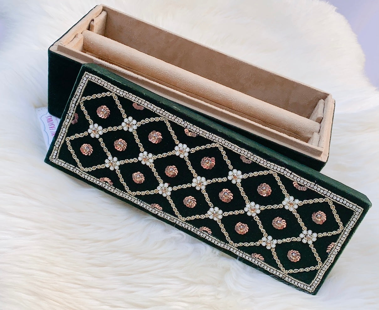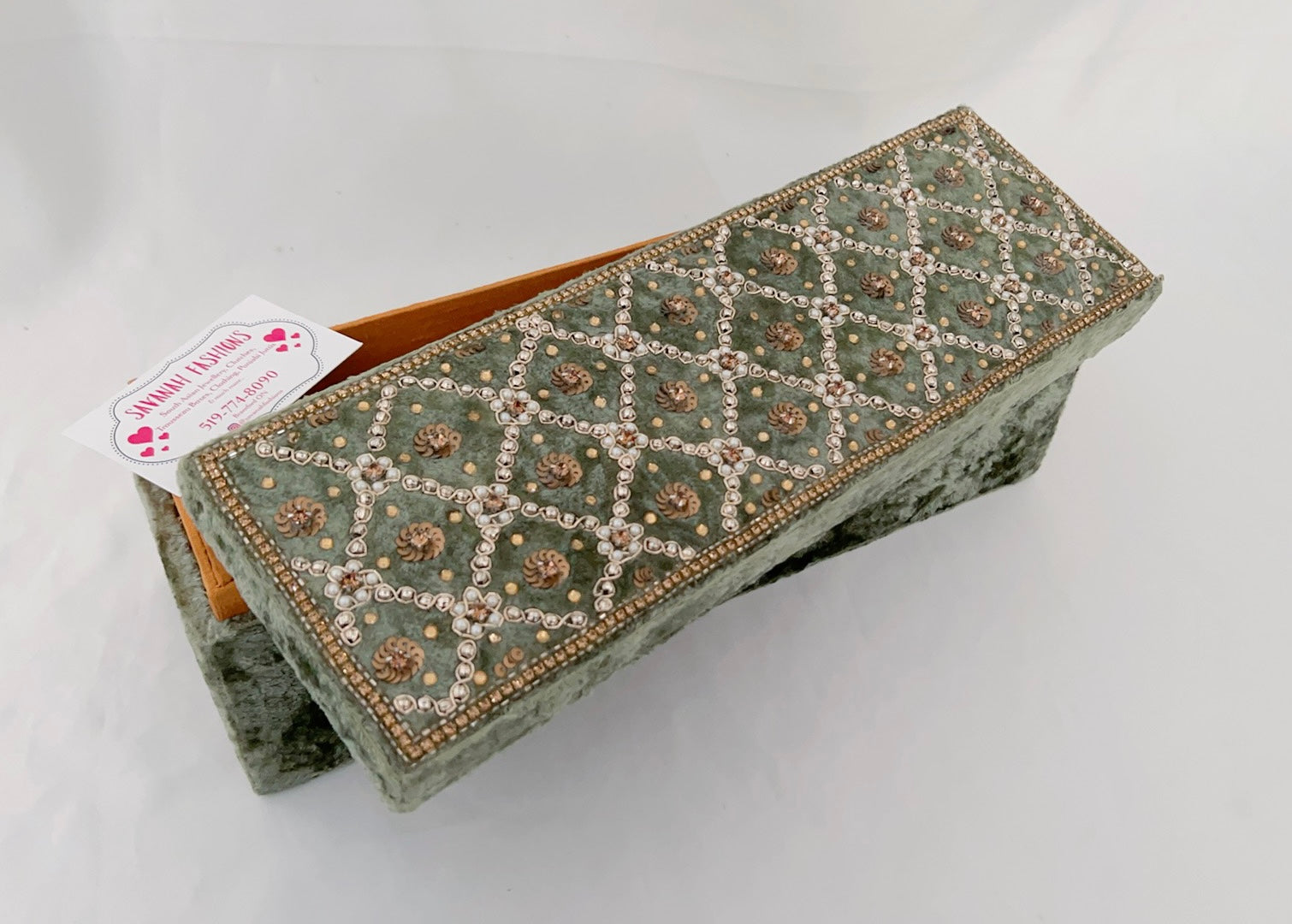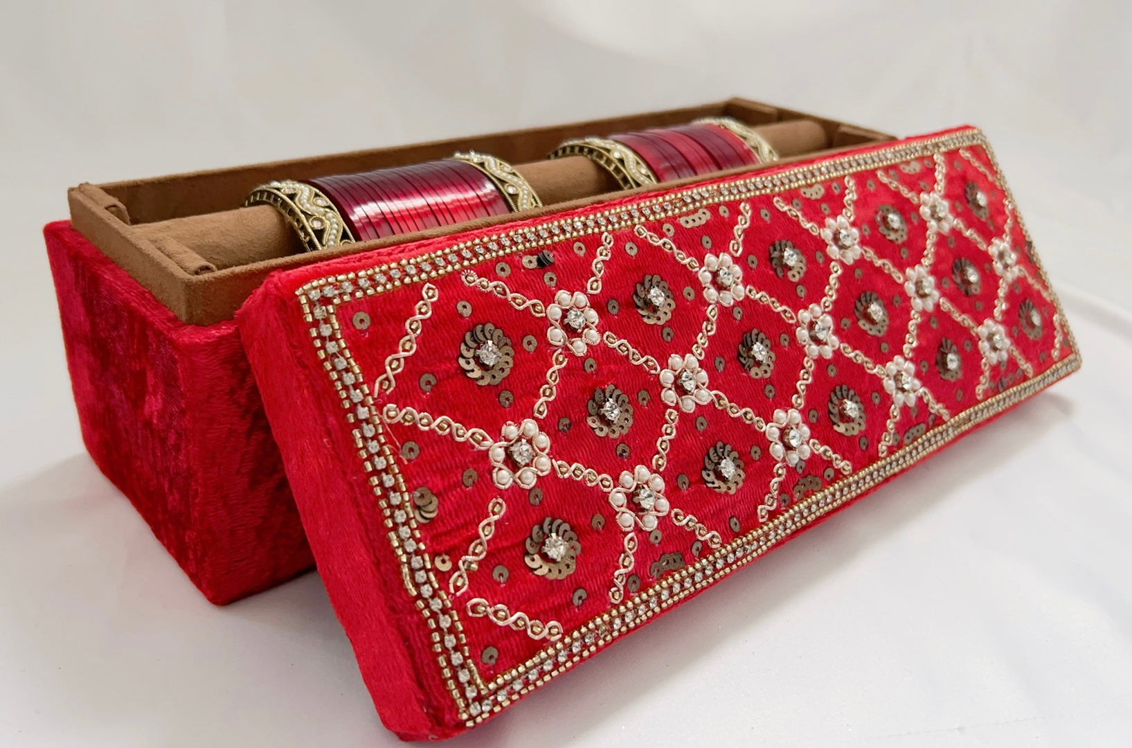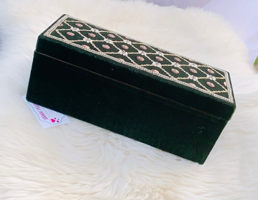 Hand crafted with high quality velvet exterior and suede interior. This hand embroidered chic design makes for a perfect keepsake of your expensive bangles or a great gift for any bride. Our bangle boxes can be made in any colour with your personalized name or hashtag.