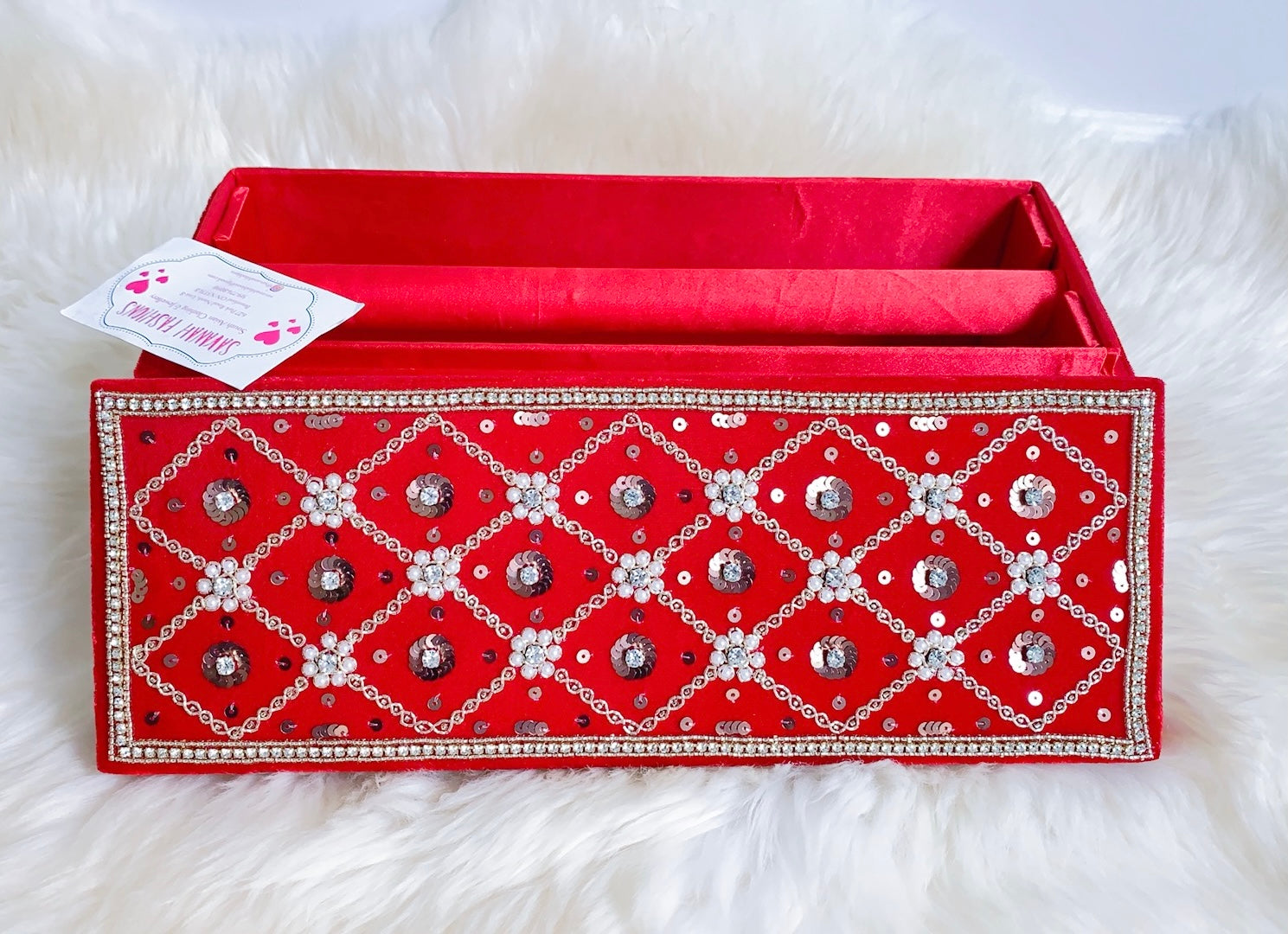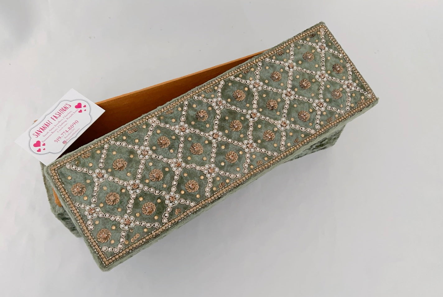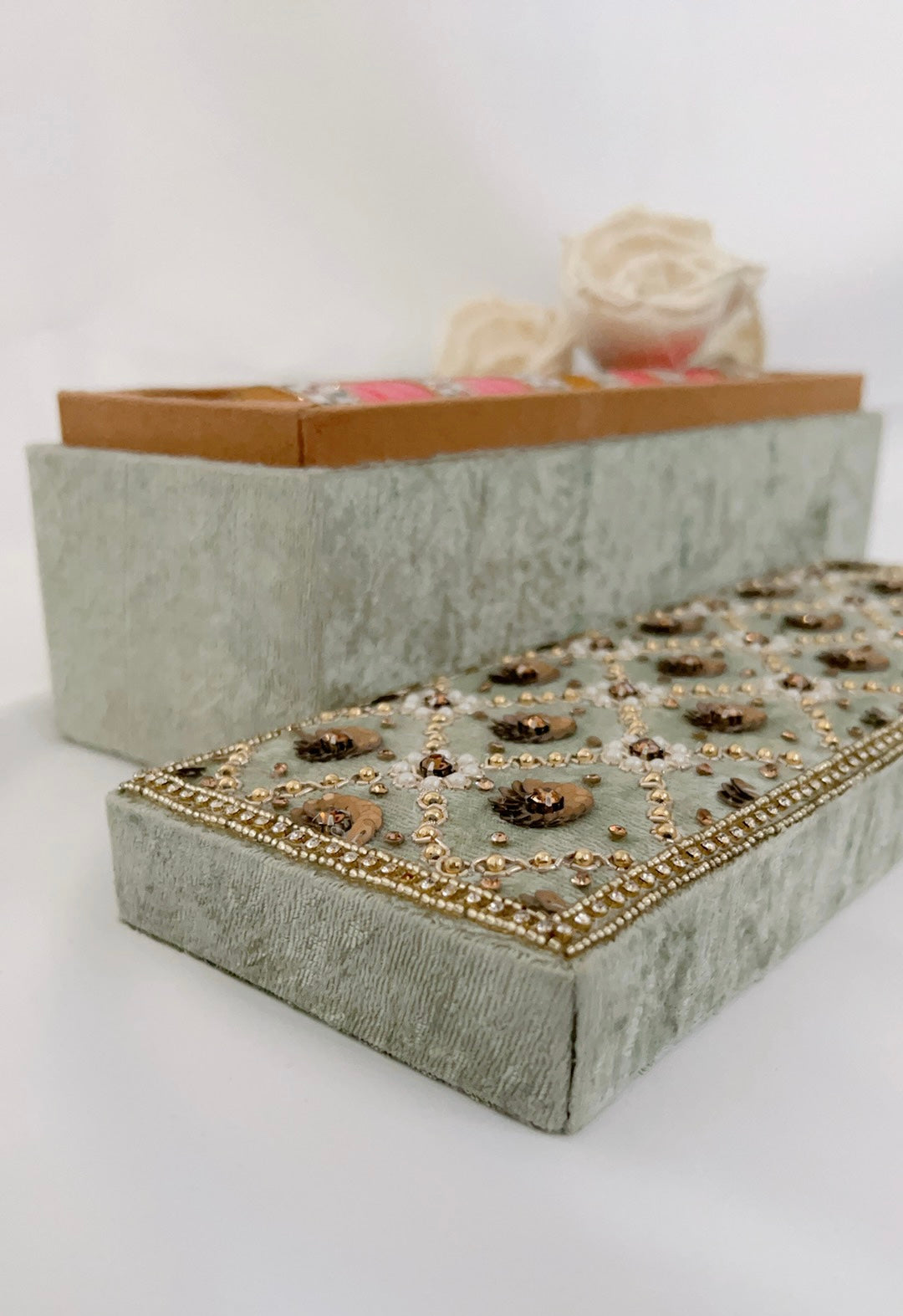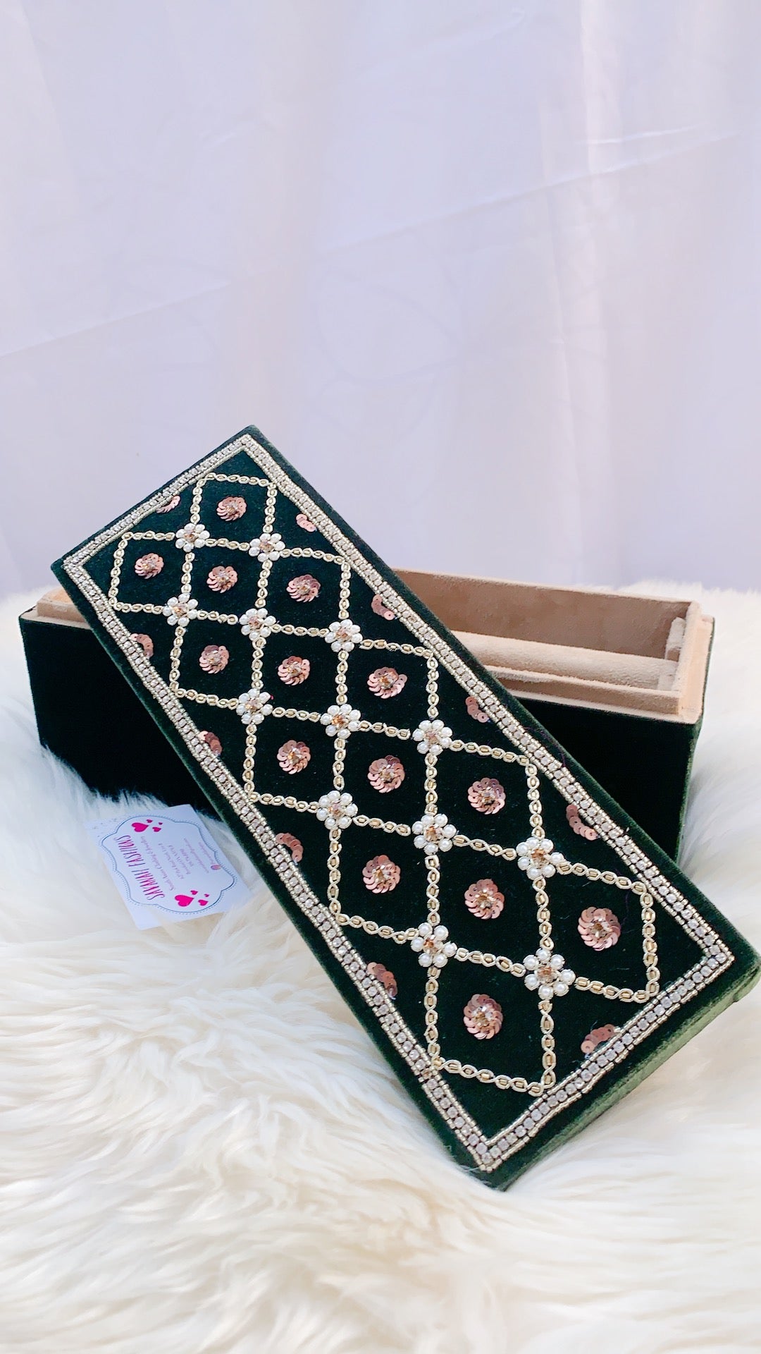 Hand crafted with high quality velvet exterior and suede interior. This hand embroidered chic design makes for a perfect keepsake of your expensive bangles or a great gift for any bride. Our bangle boxes can be made in any colour with your personalized name or hashtag.