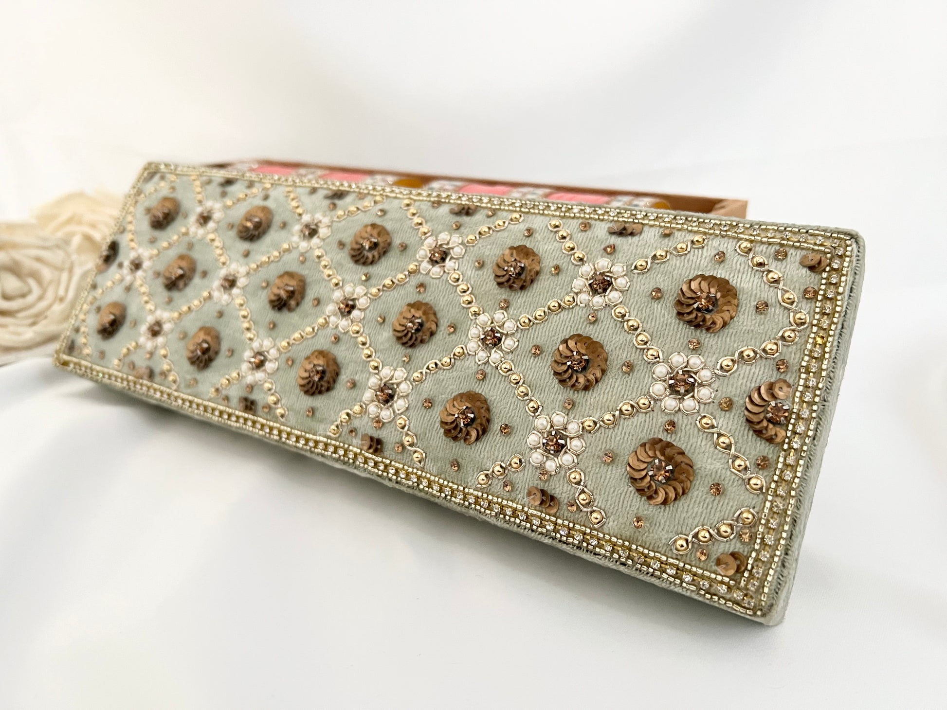 This design is close to my heart for many reasons, the main one being: it is one of my first designs that I created to be embroidered. I wanted to incorporate pearls and stones together in a unique yet classy combination which would look great with any eastern or western attire. Originally while working with my karigaars to make this, I called it the 'chic' design. It made me feel fashionable just thinking about it. If you know me personally you know how much I use the word 'different' and with this design I felt I was bringing something 'different' to the clutch designs. I hope this piece beings you joy as it does to me..