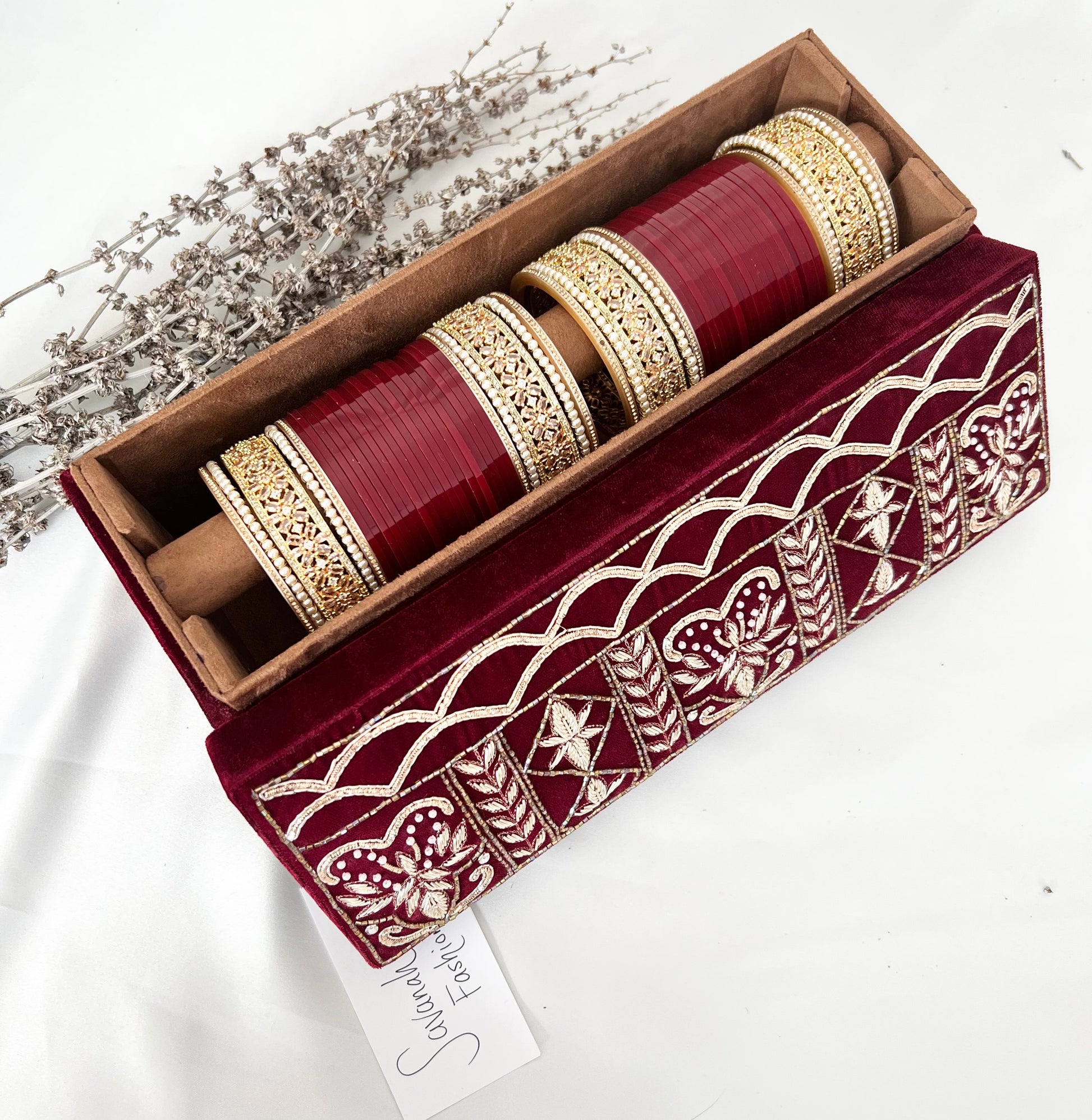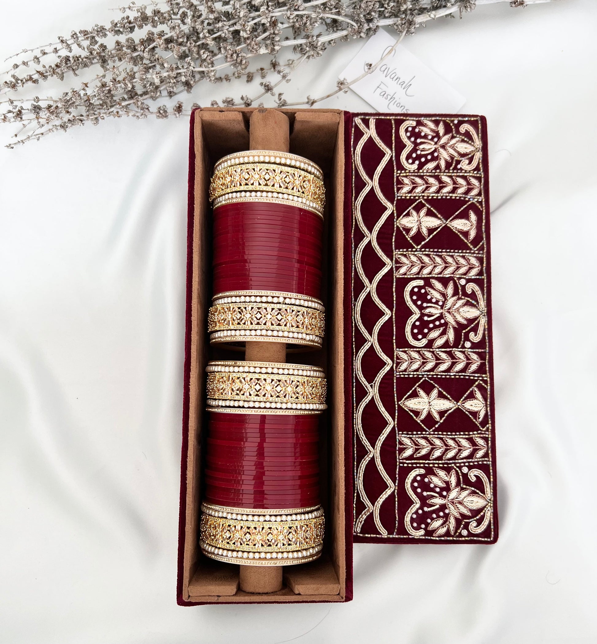 Gold stone and pearl bangles chooda set. Chooda bangles are available in many colours and sizes - to match your wedding dress.