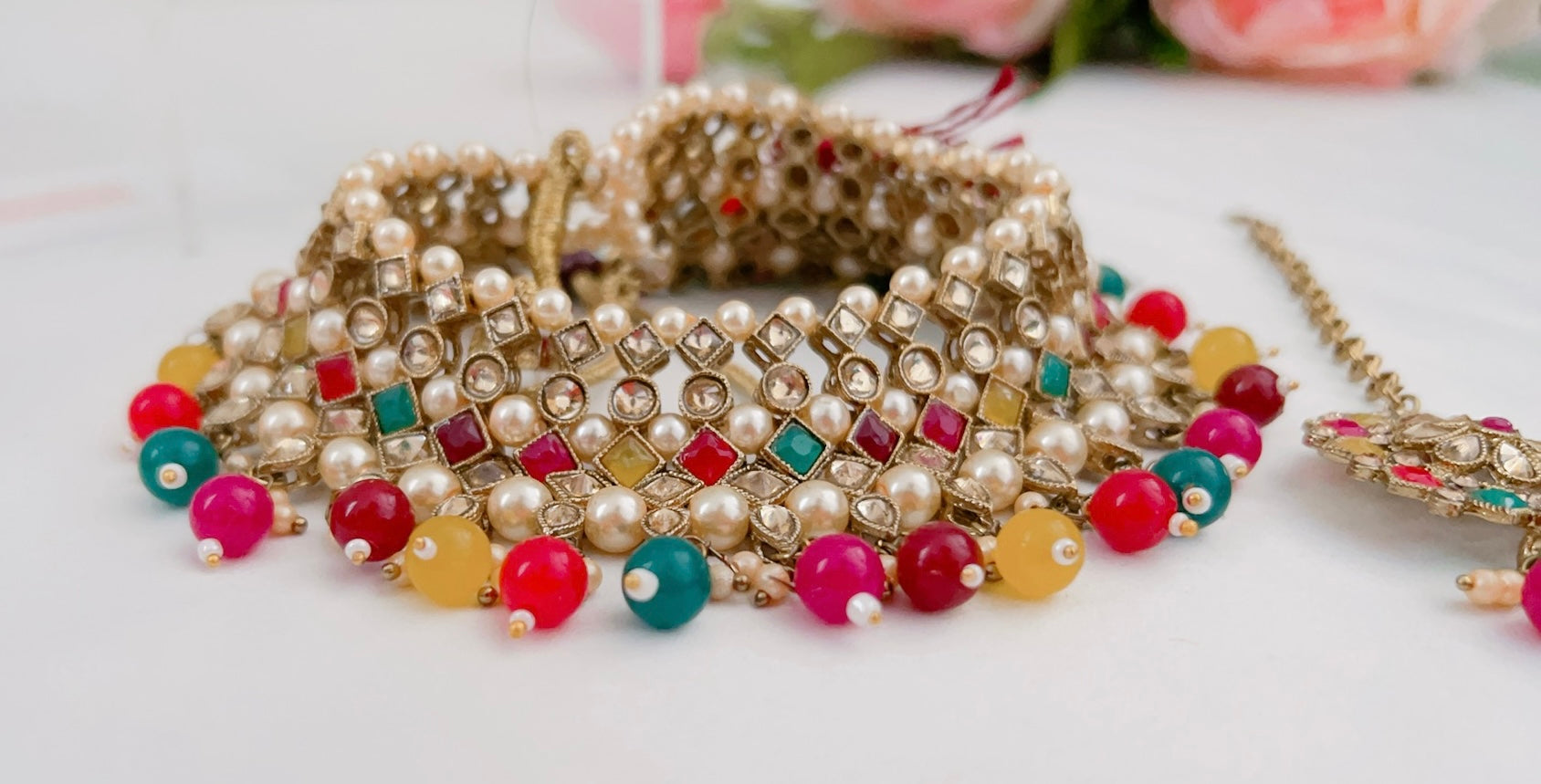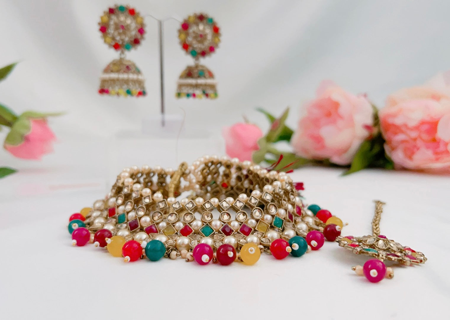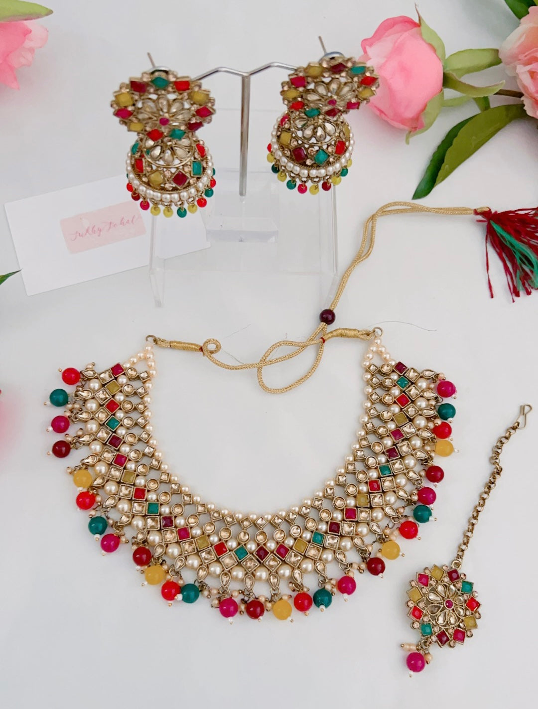 Bright and cheerful necklace set, a choker style that comes with jhumkas (earrings) and tikka. Handmade polki design with thread work, extremely flexible.