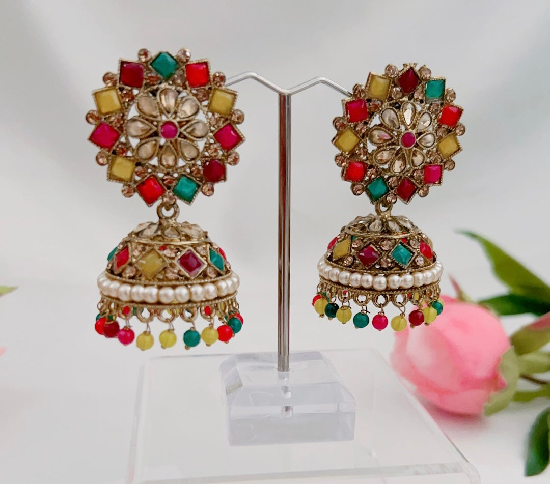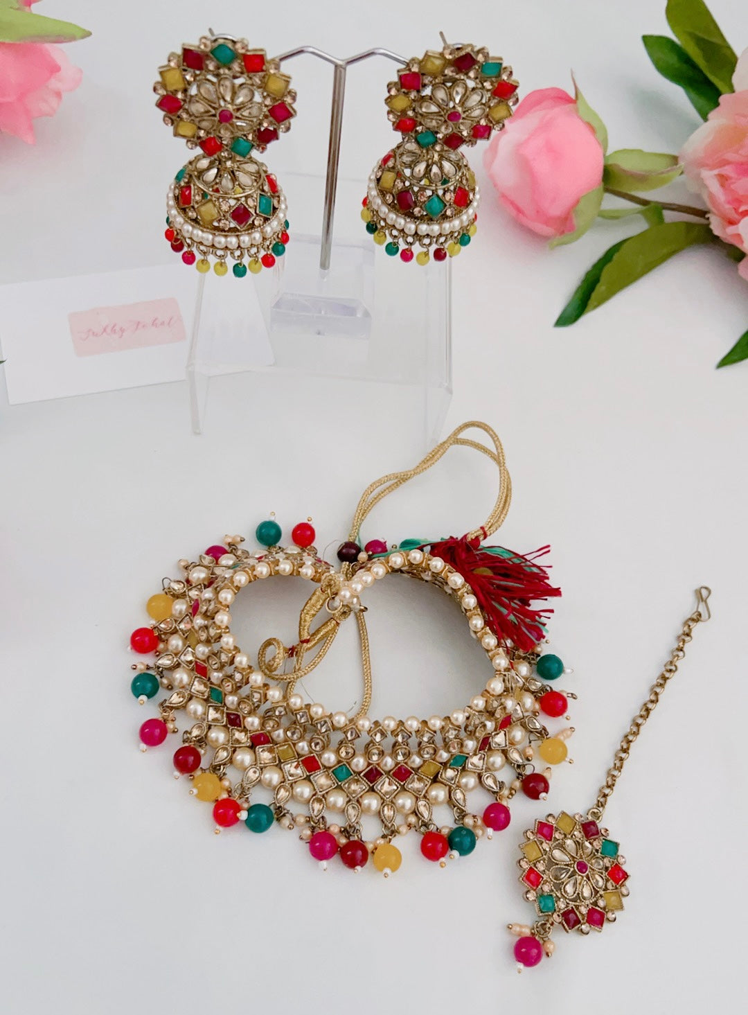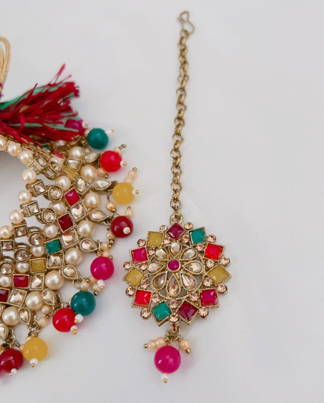 Bright and cheerful necklace set, a choker style that comes with jhumkas (earrings) and tikka. Handmade polki design with thread work, extremely flexible.