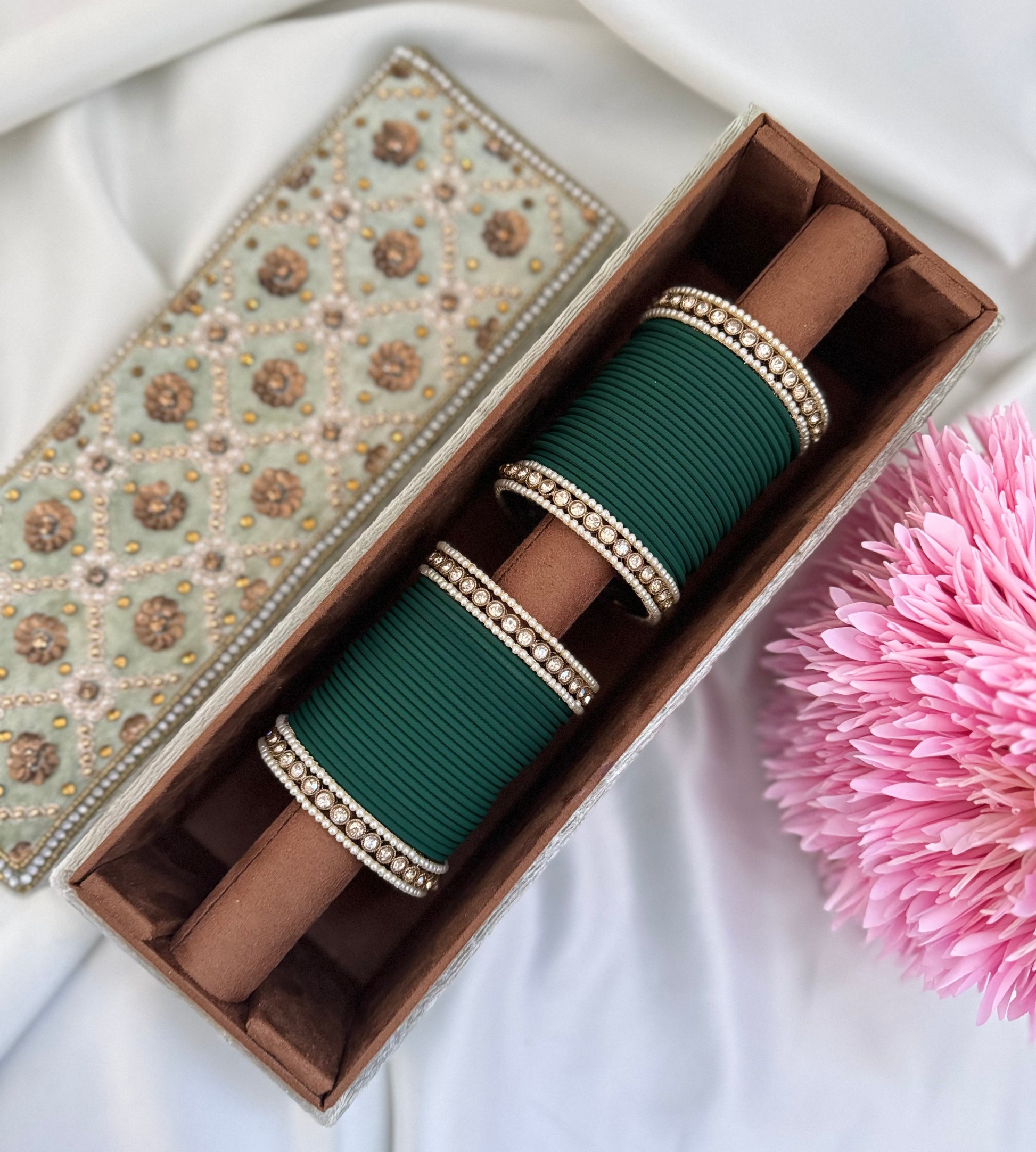 The most attractive part of this bangle design is the simplicity. Plain matte bangles featured with round-cut polki bangles on the sides and petite pearls.