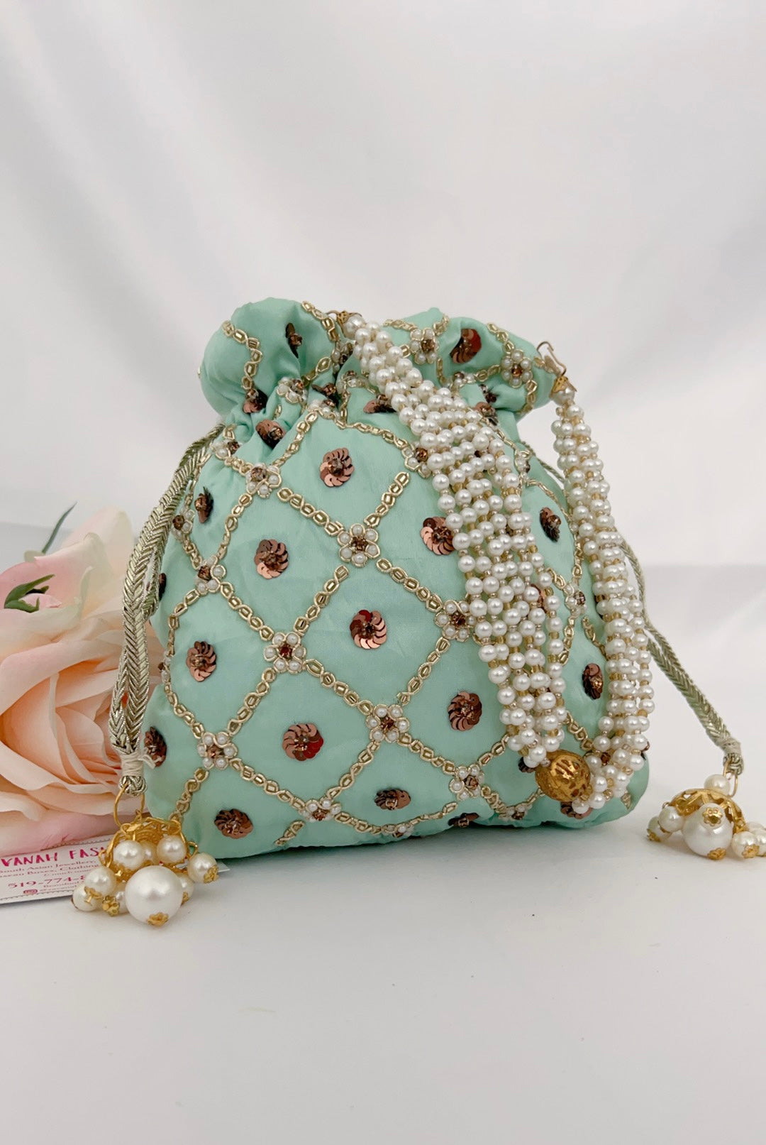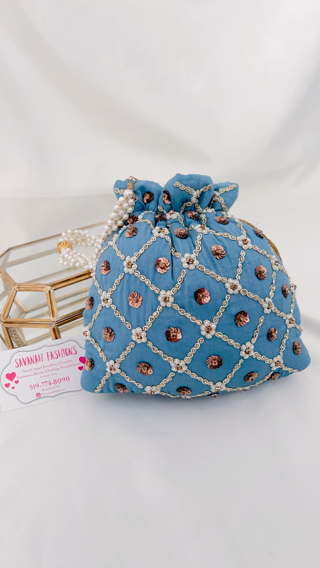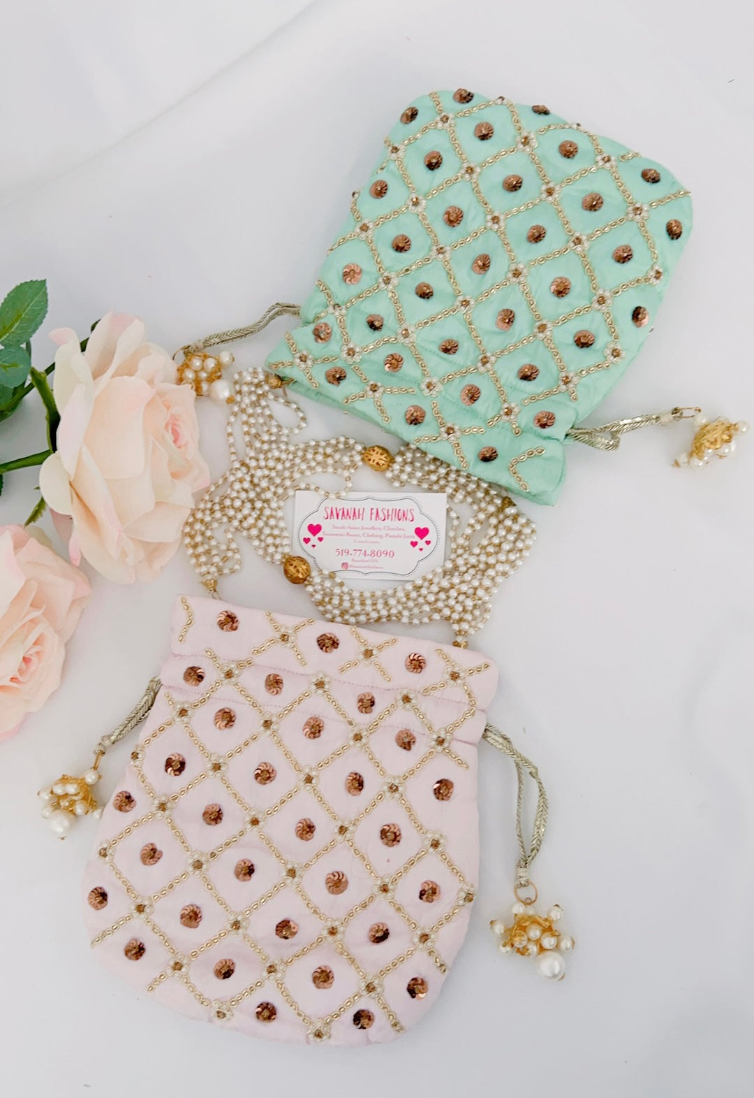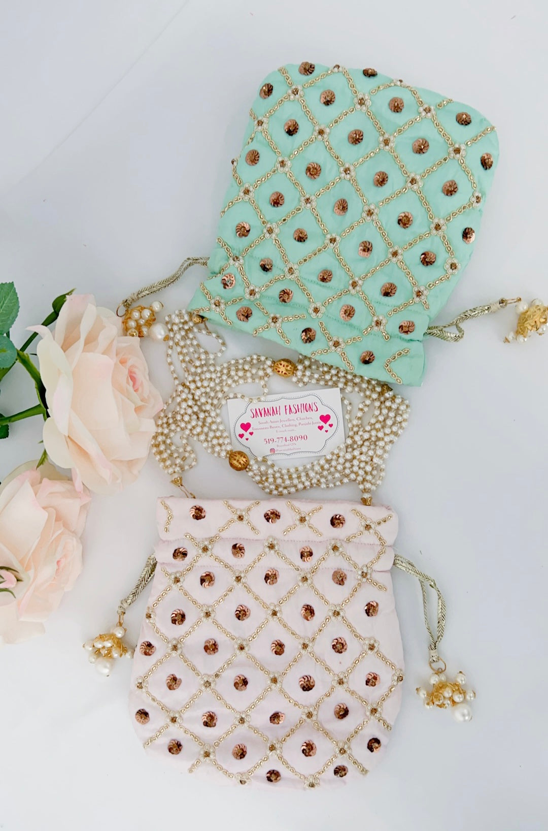 Our Aniya Potli features exquisite embroidery on silk fabric and all pearl handle. Hand crafted using high quality material. This chic style can be perfectly matched with eastern or western attires. Potli fits iPhone, small wallet, make up, etc..
