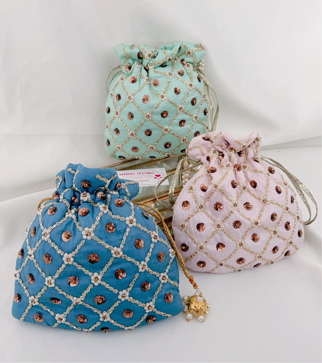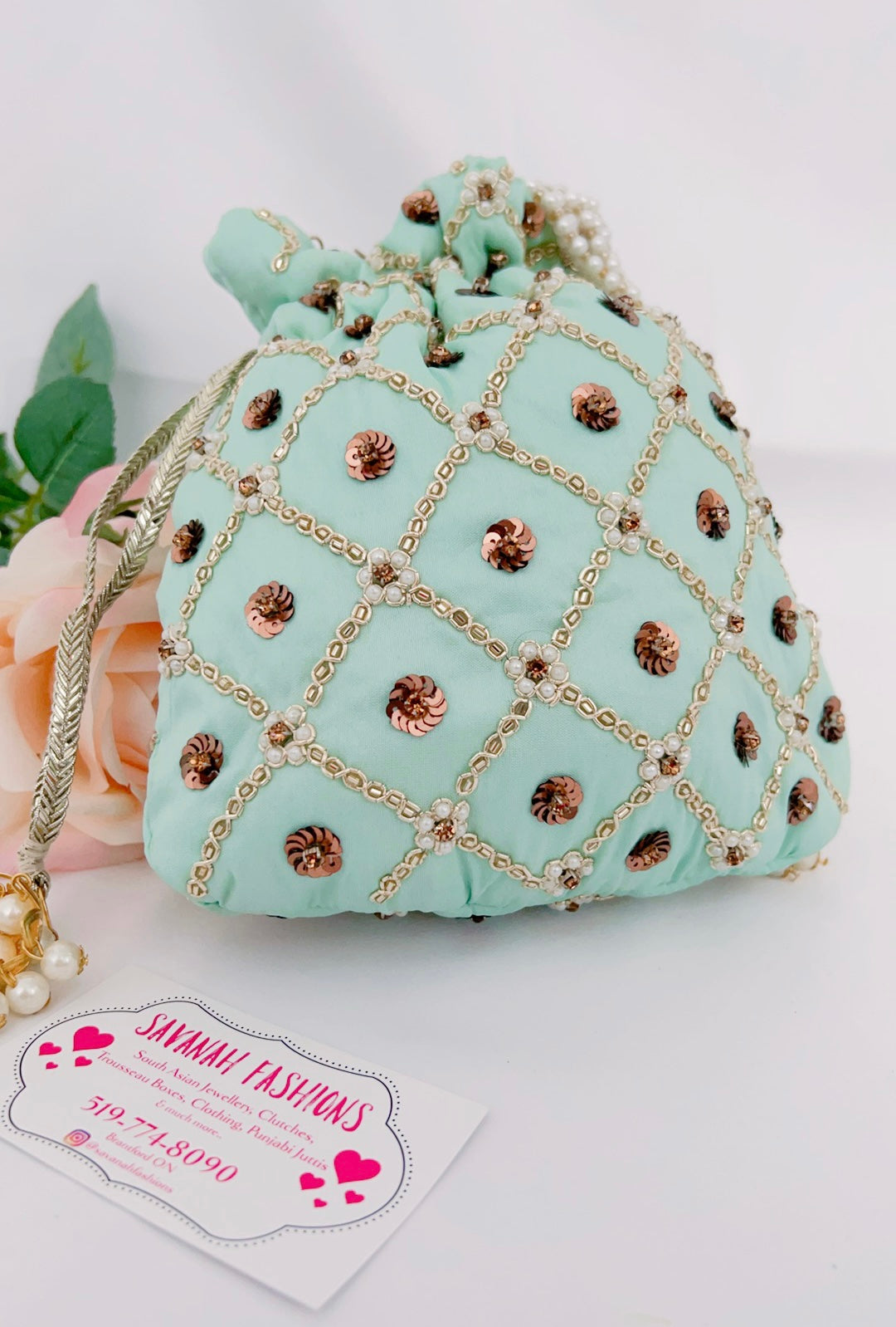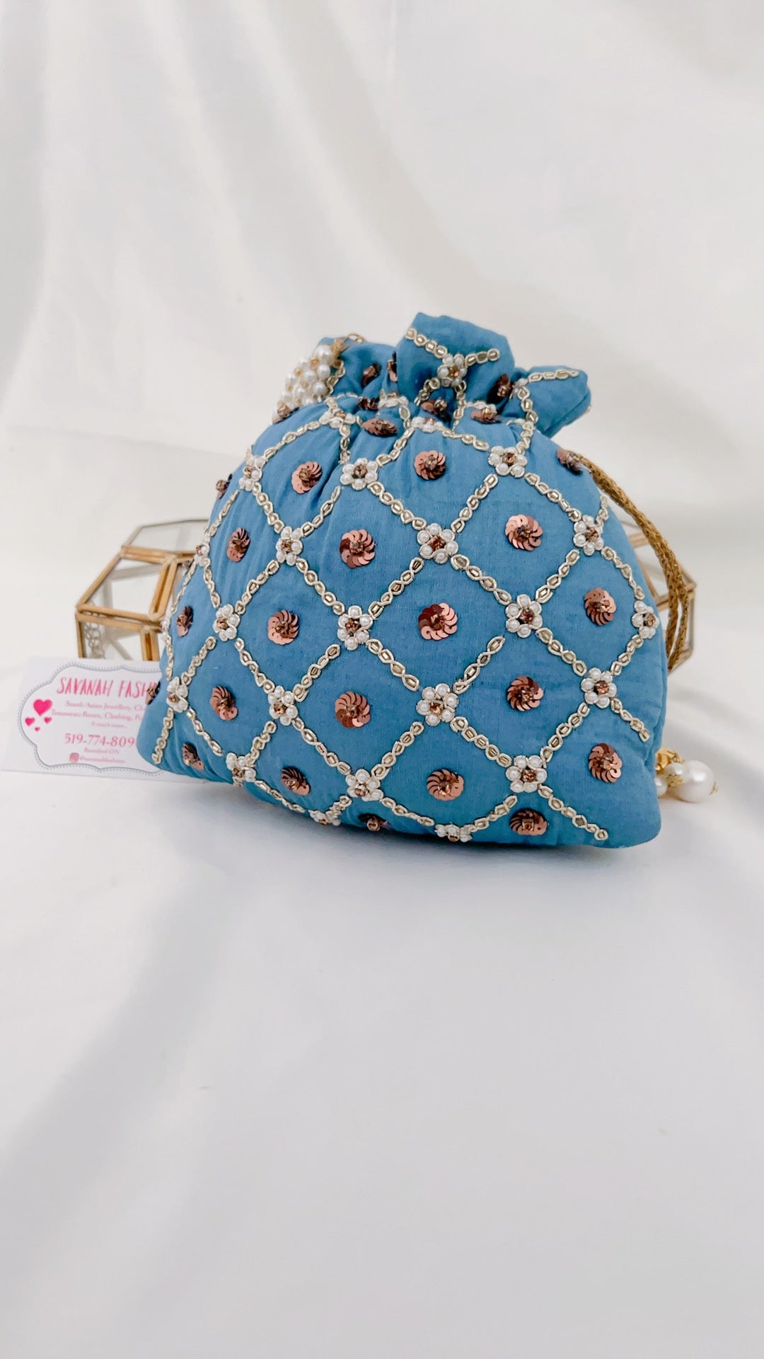 Our Aniya Potli features exquisite embroidery on silk fabric and all pearl handle. Hand crafted using high quality material. This chic style can be perfectly matched with eastern or western attires. Potli fits iPhone, small wallet, make up, etc..