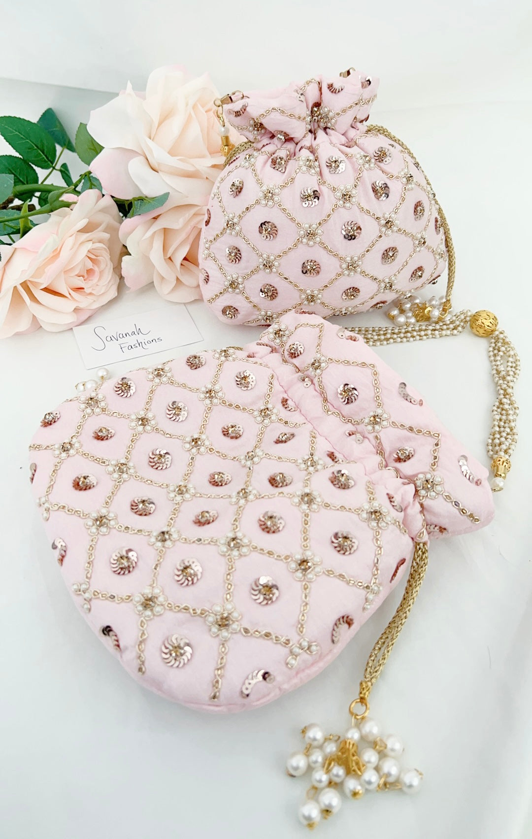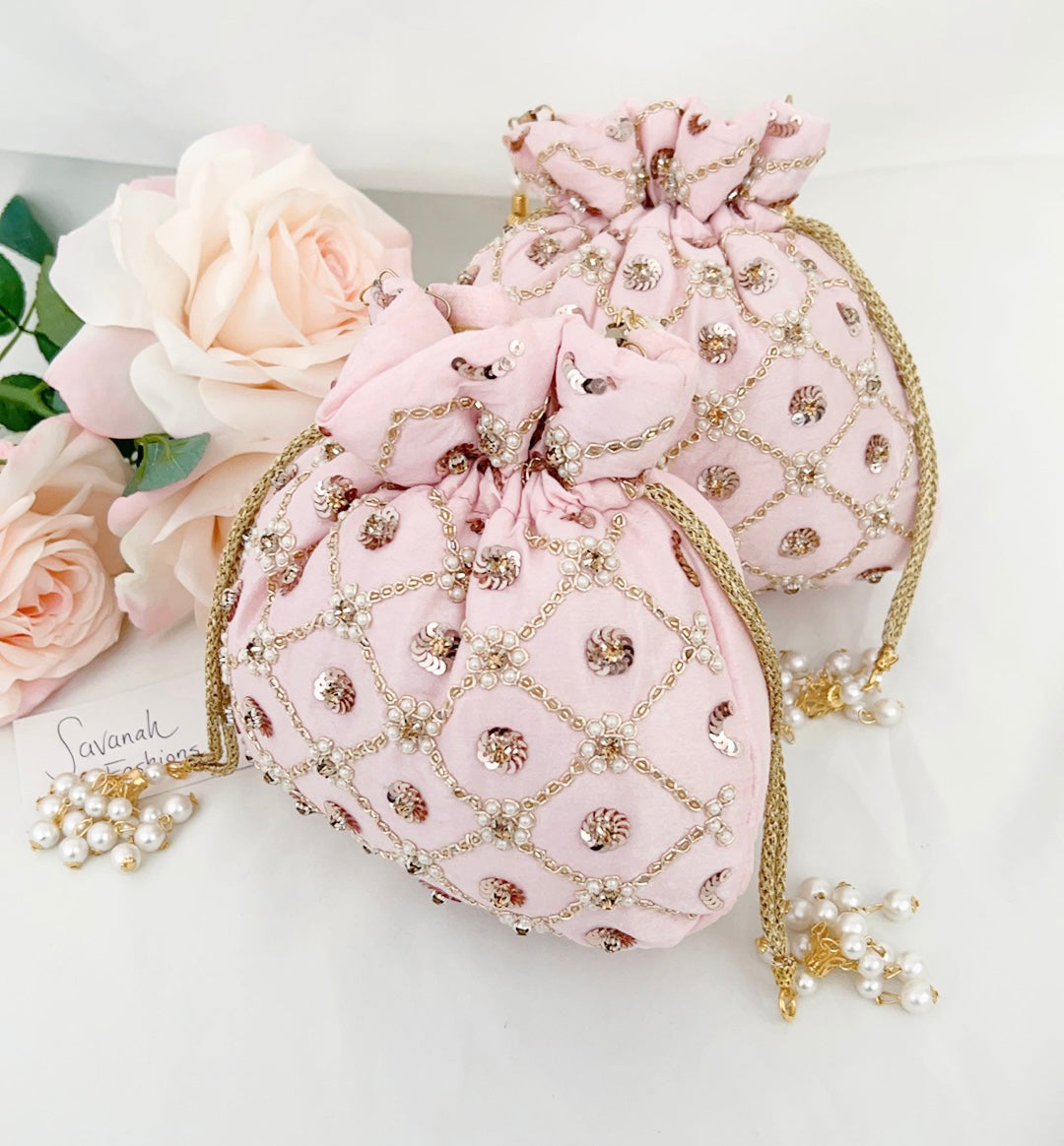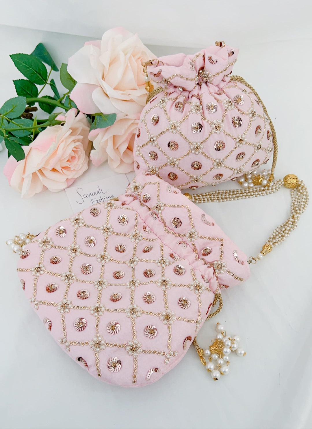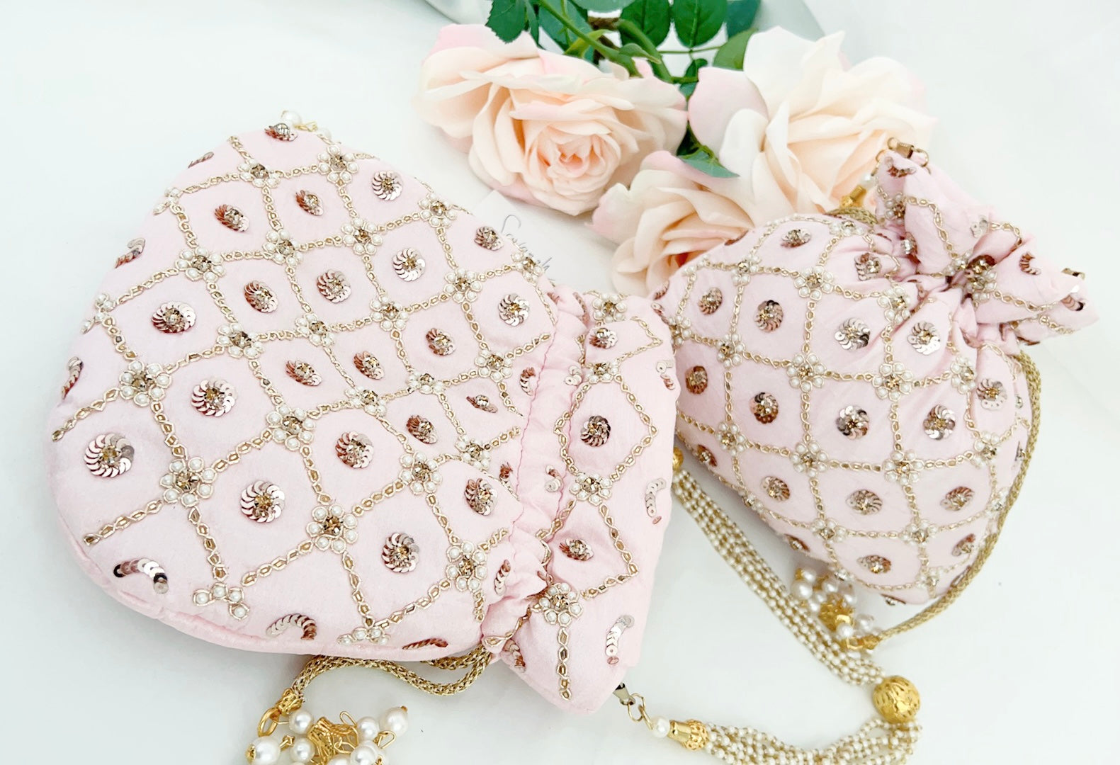 Our Aniya Potli features exquisite embroidery on silk fabric and all pearl handle. Hand crafted using high quality material. This chic style can be perfectly matched with eastern or western attires. Potli fits iPhone, small wallet, make up, etc..