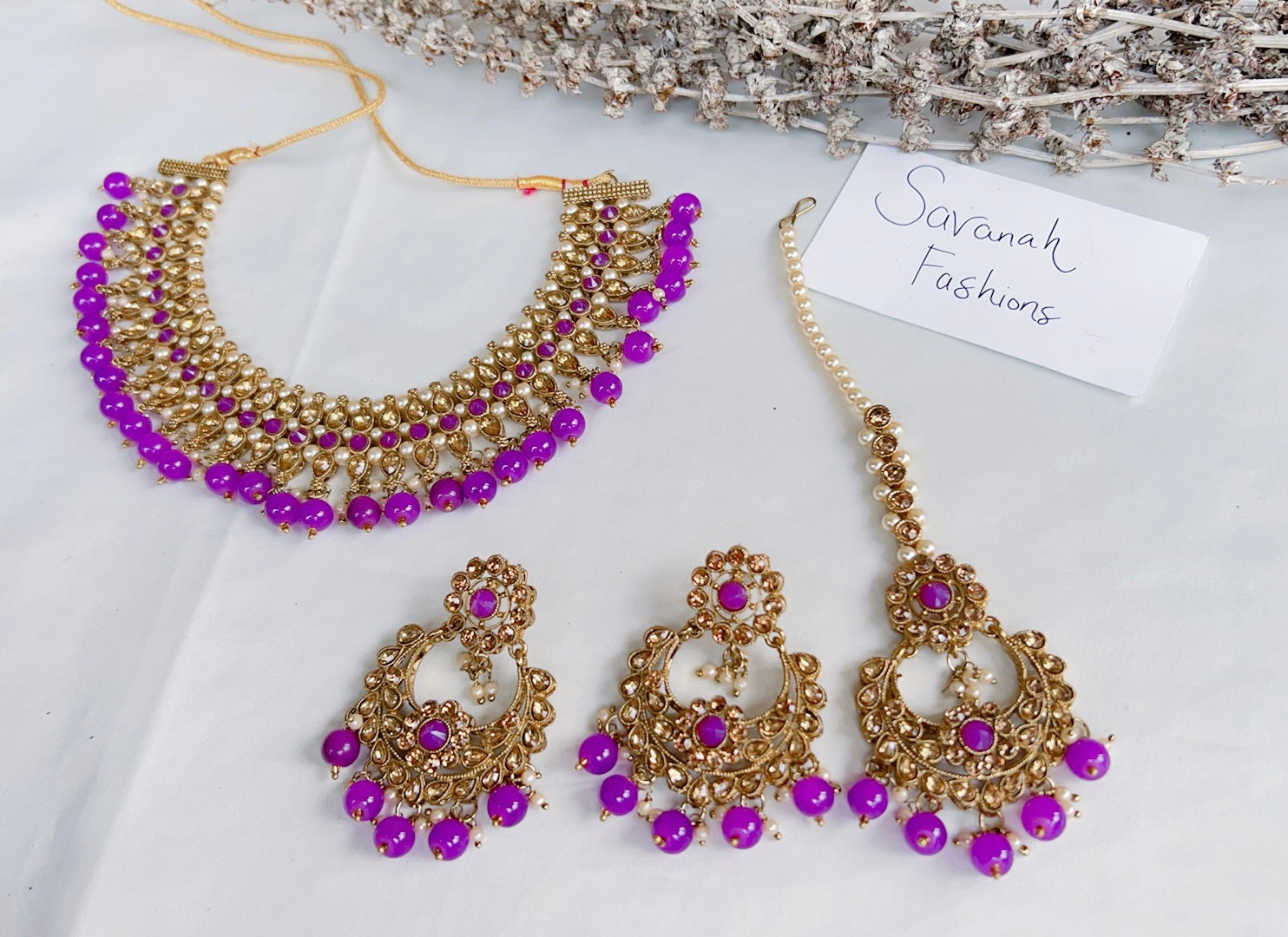 A pop of purple on gold! Full set includes: necklace, earrings, and tikka.