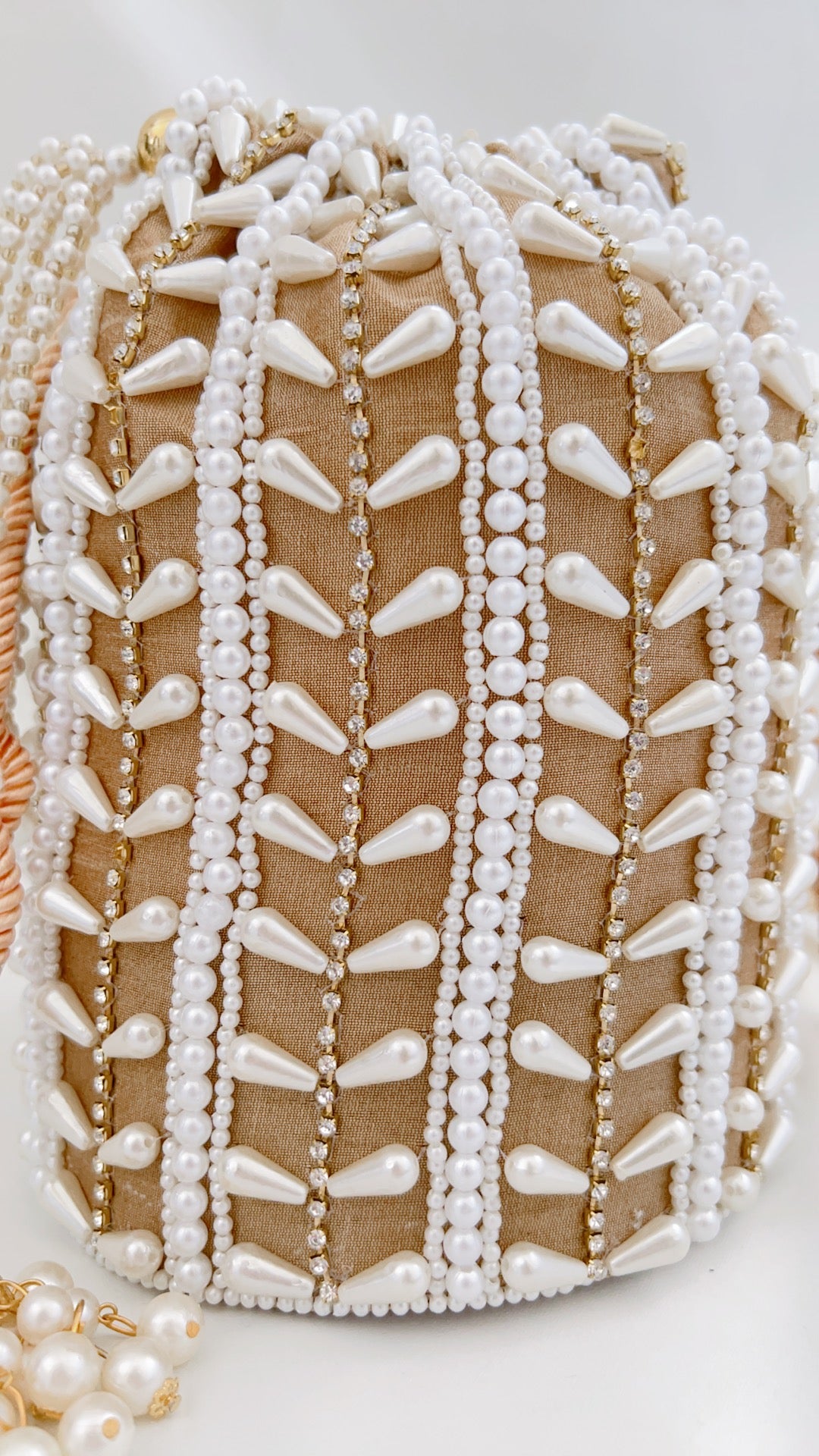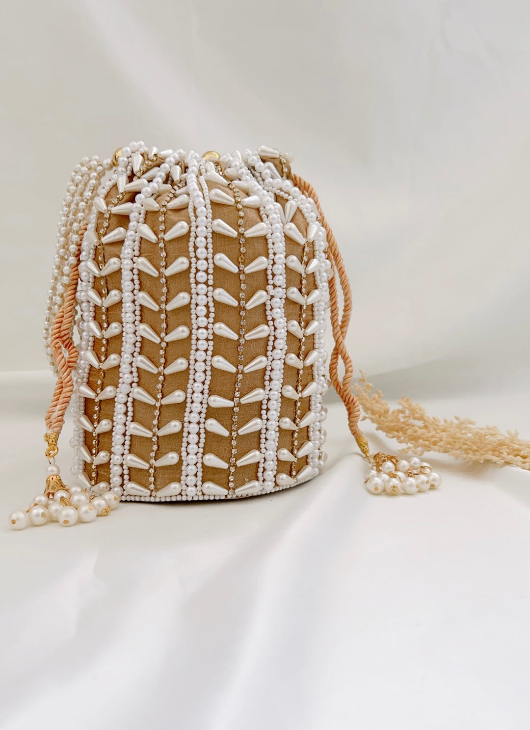 A version of our Aria Potli in gold. This beautiful potli bag is made with raw silk fabric in a cylindrical shape and embellished with intricate hand embroidery pearl details all around. It has been finished with gorgeous latkans and pearl handle.