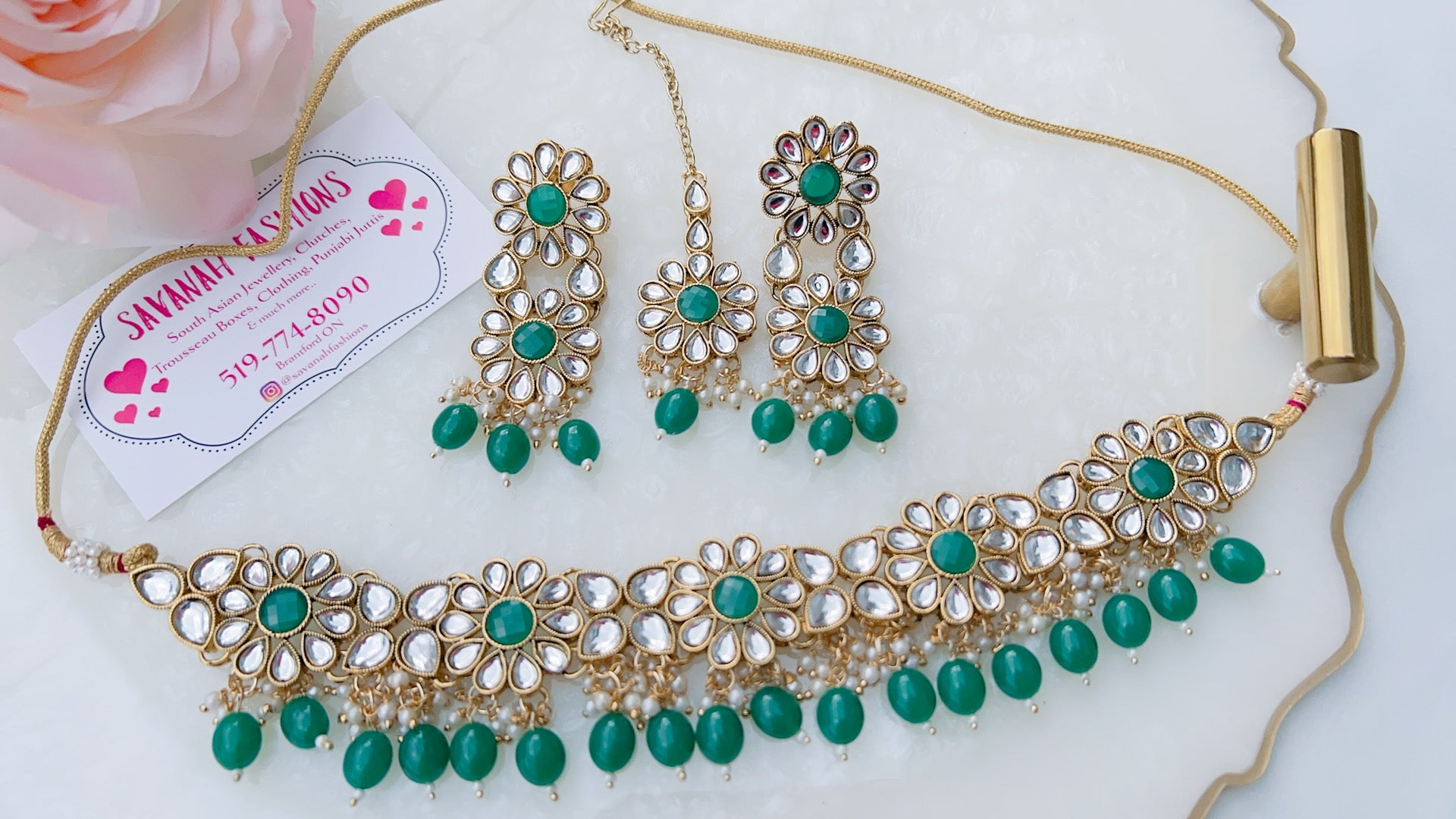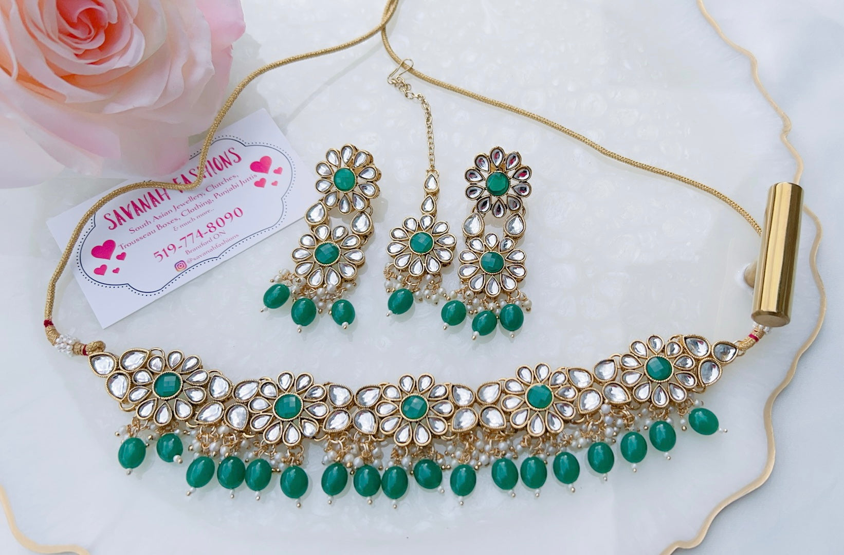 Green neckalce set (flexible to be worn as a choker). Full set contains: necklace, earrings, tikka..