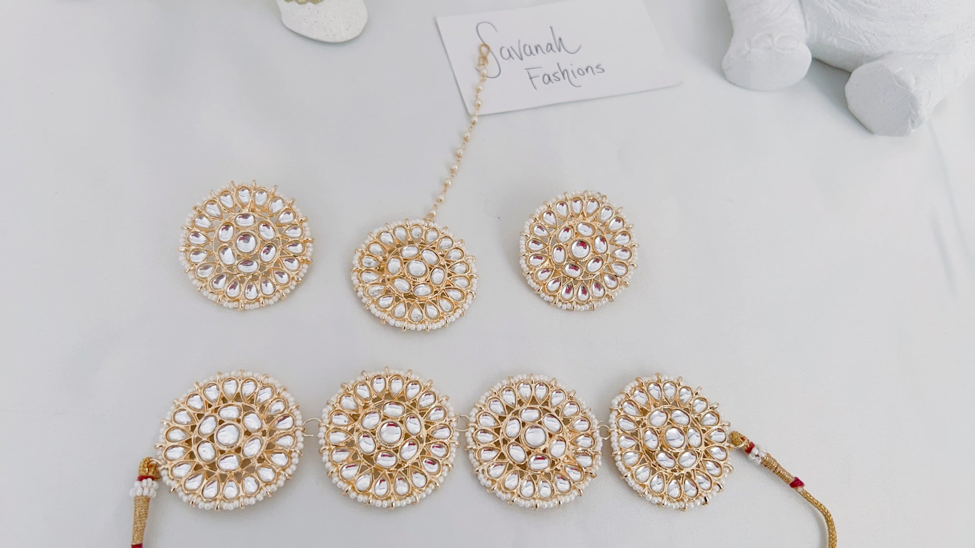 A luxurious necklace set that fits beautifully around the neck as a choker. Our Arya set comes with a round tikka and studs to complete the look. Extremely light weight design, comfortable to wear.