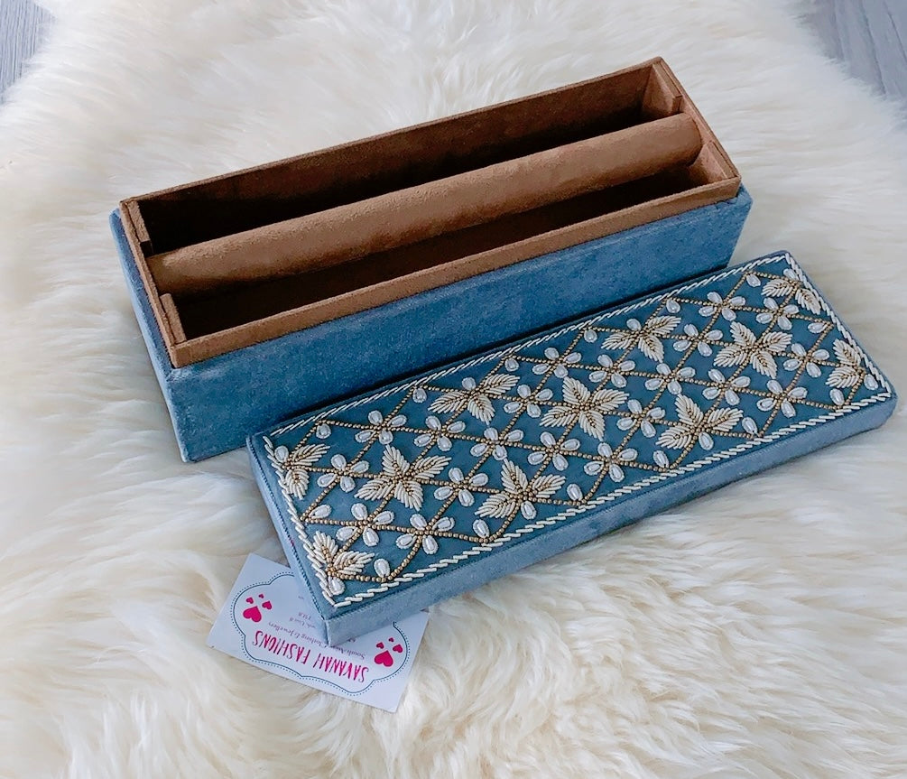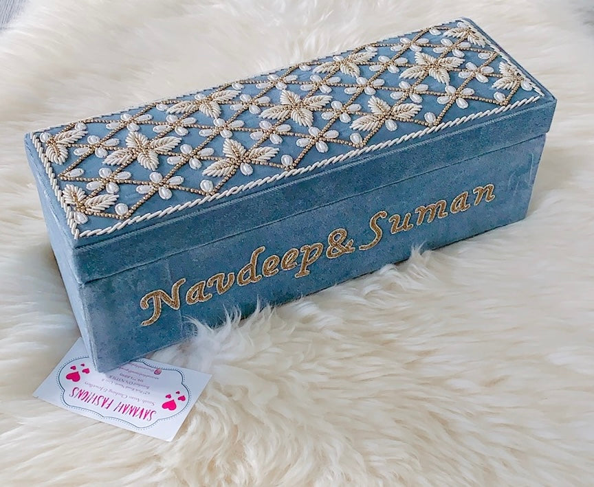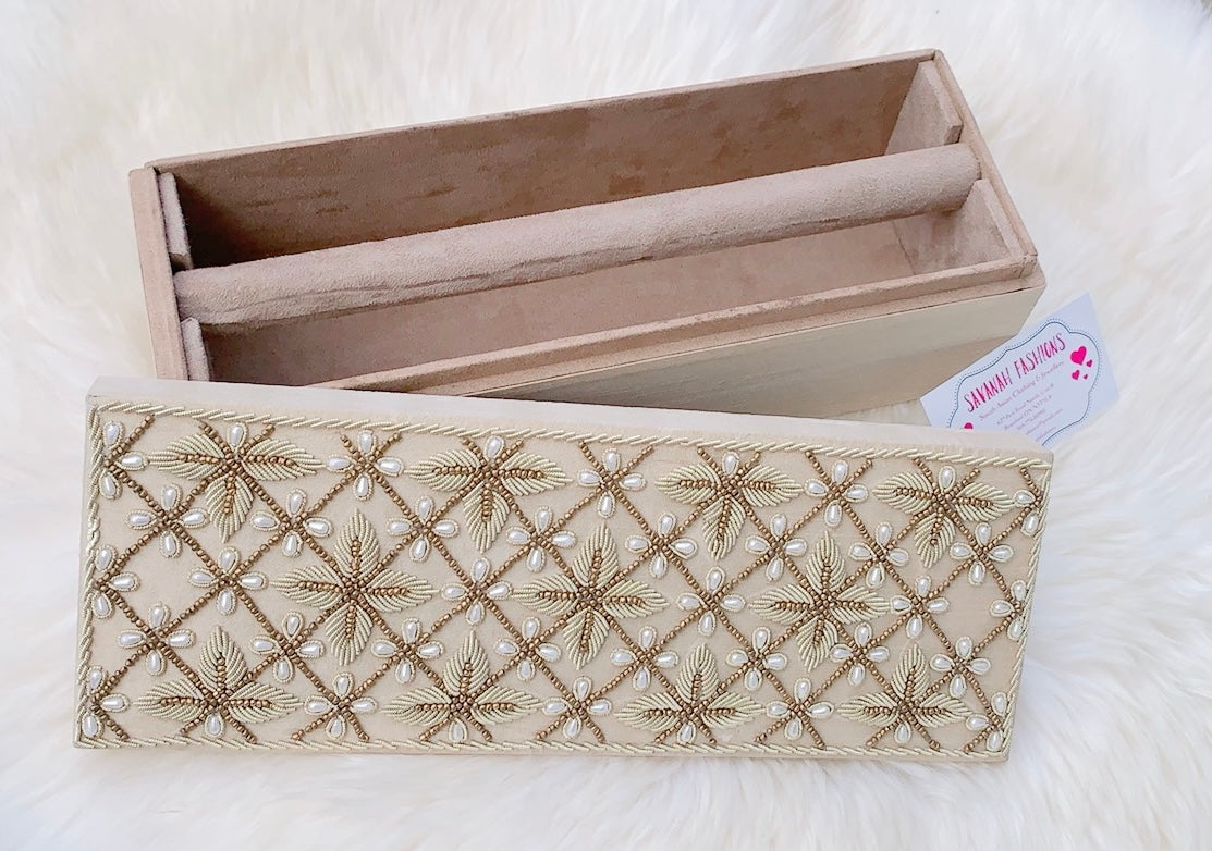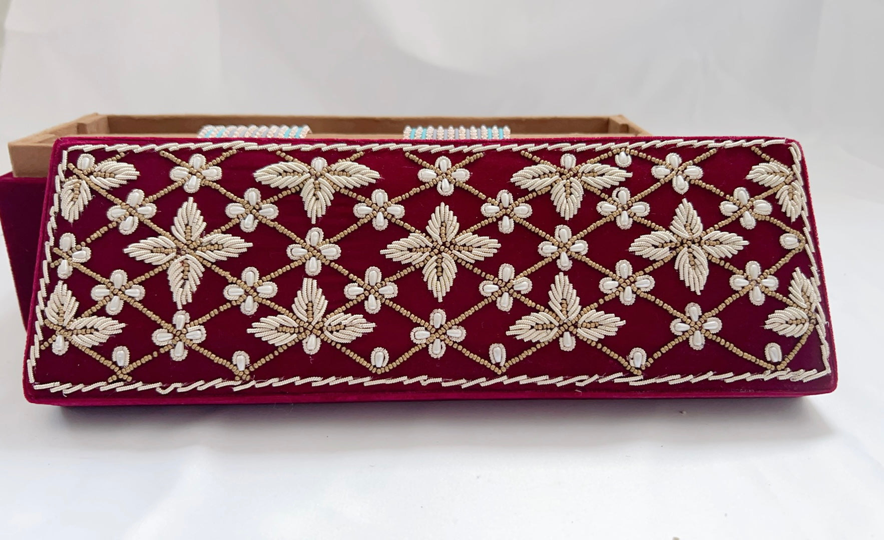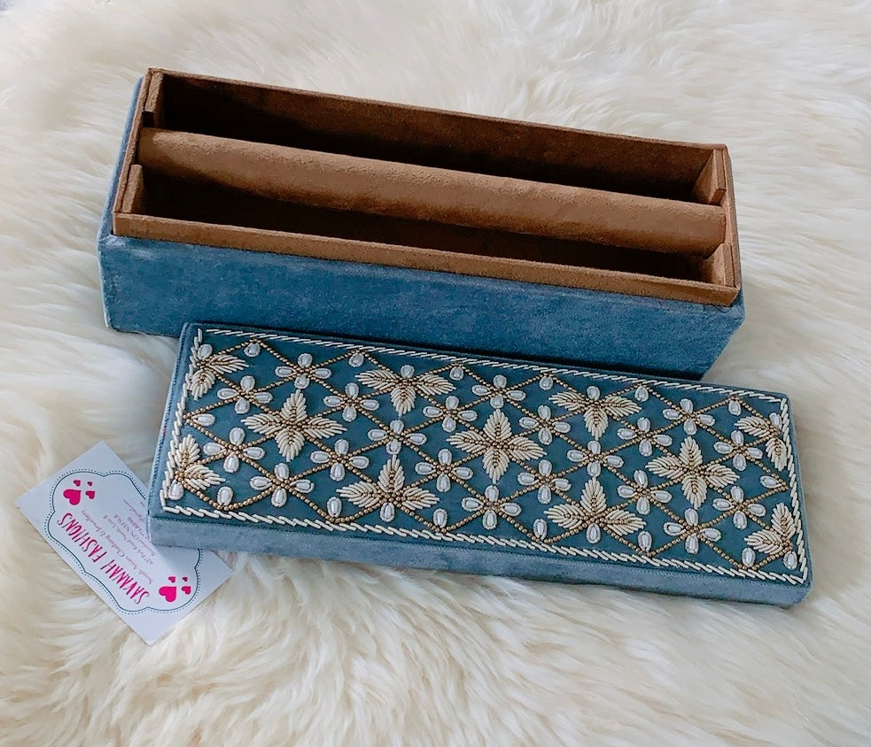 Pearls-meet-Dabka hand embroidery for this velvet bangle box.