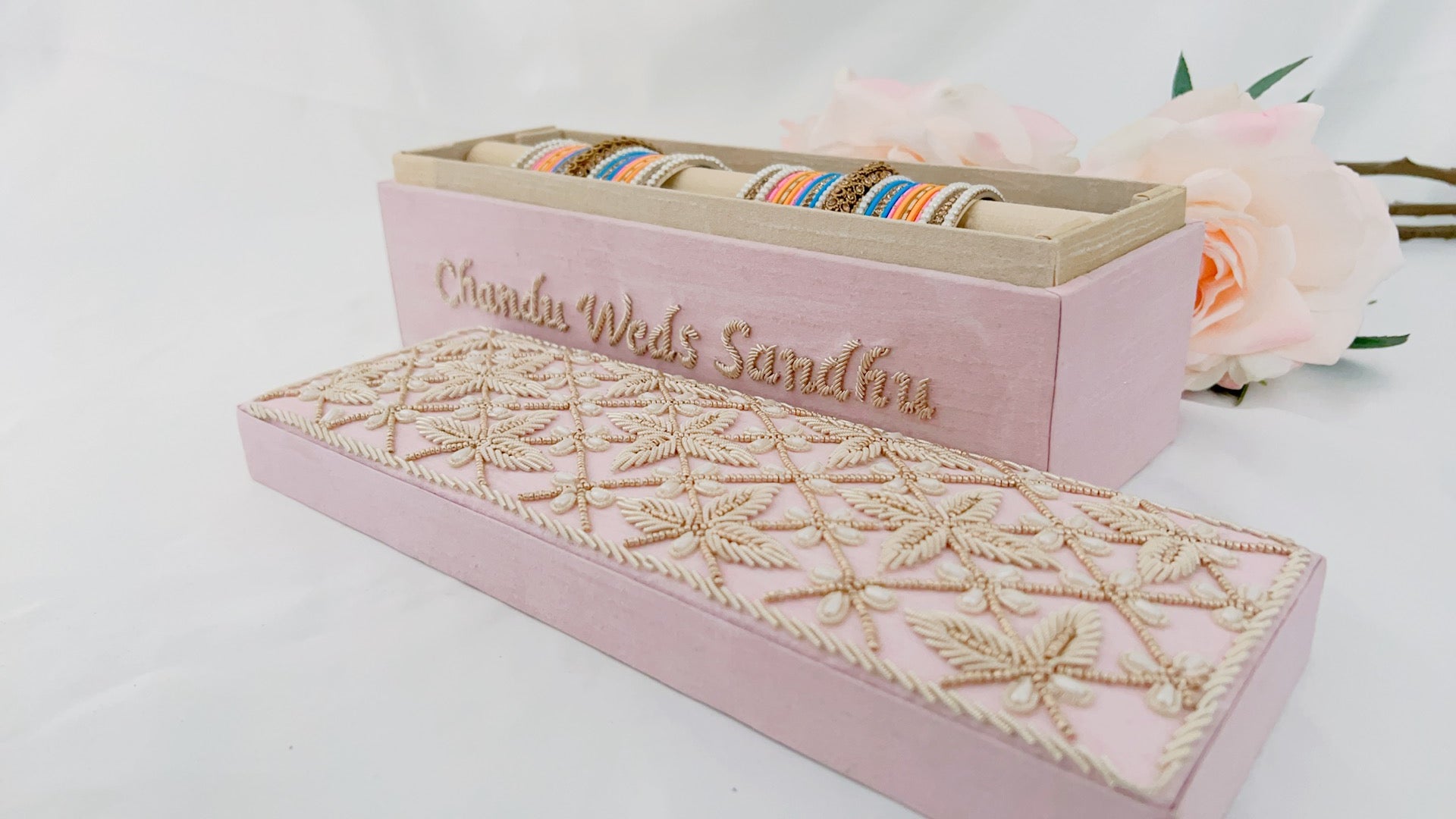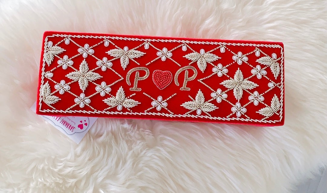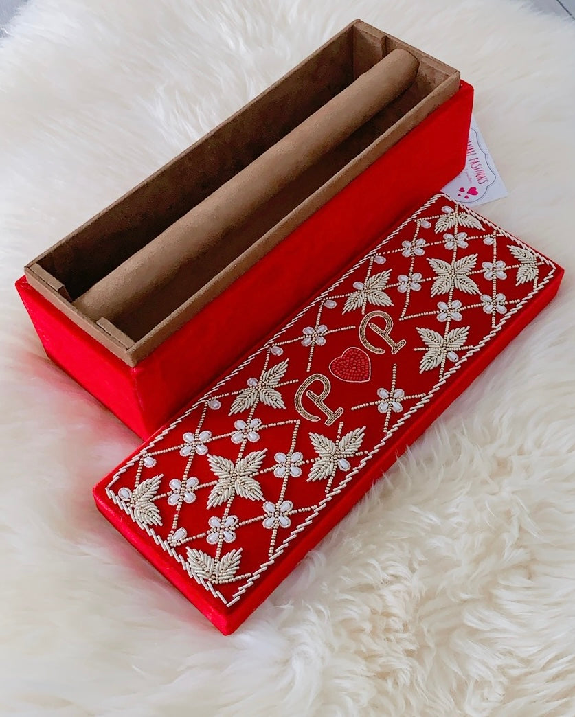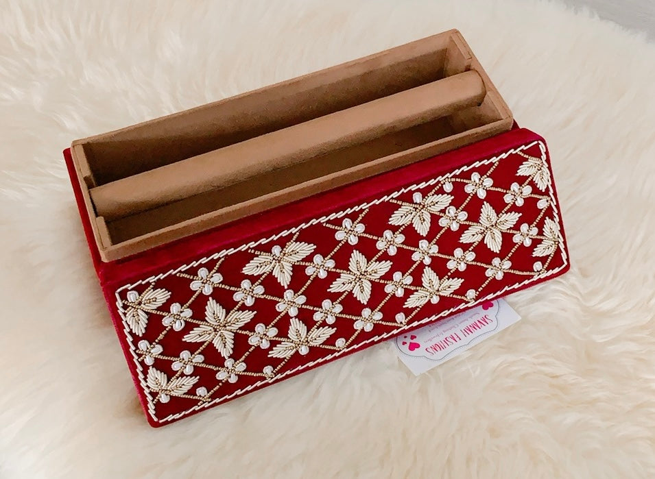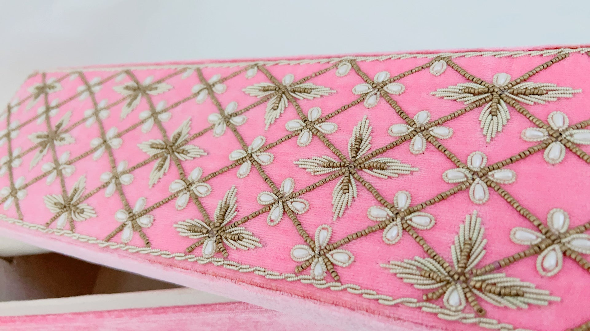 Pearls-meet-Dabka hand embroidery for this velvet bangle box.