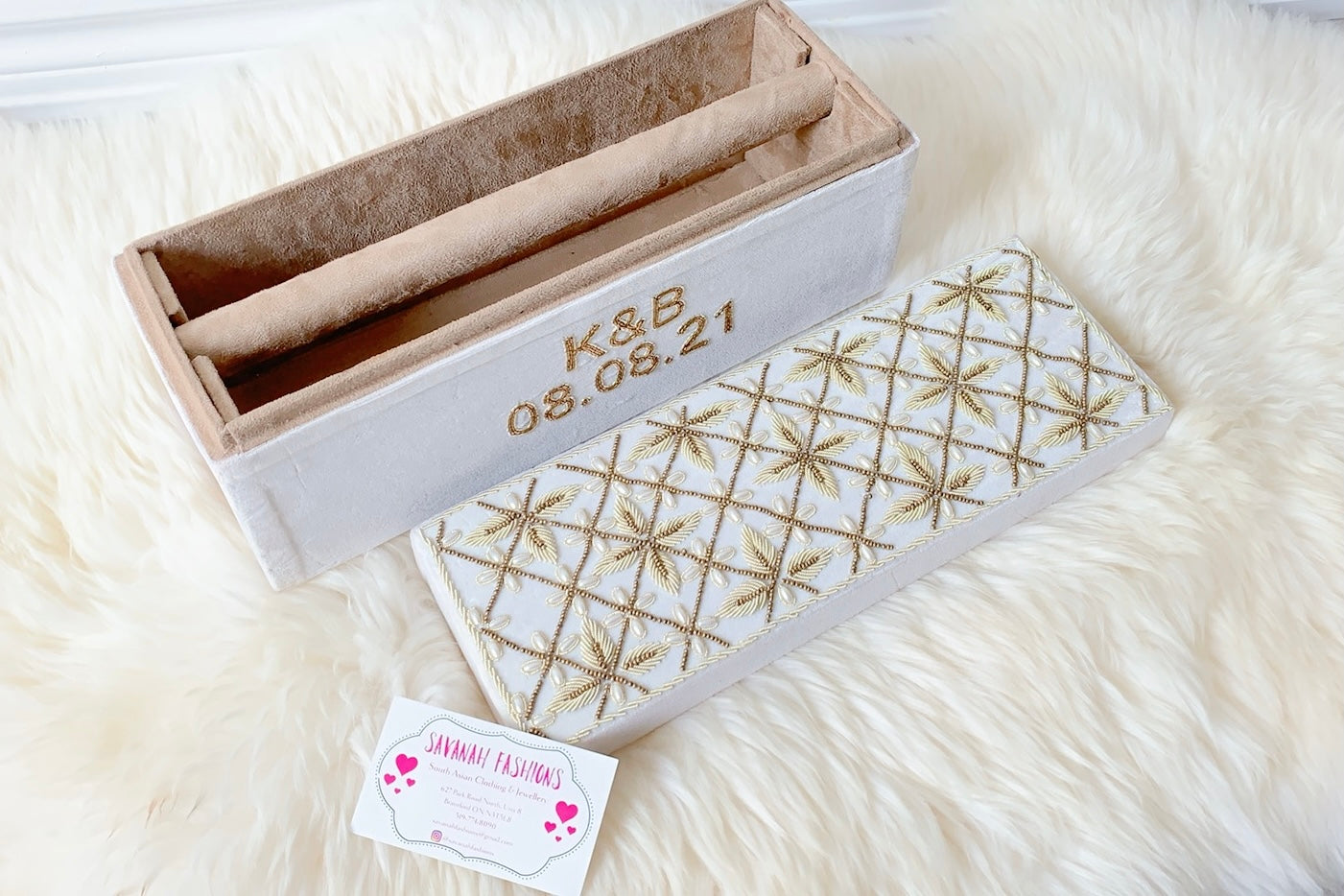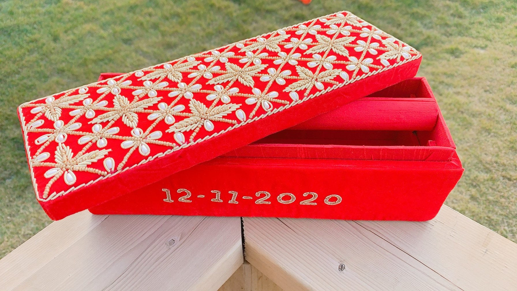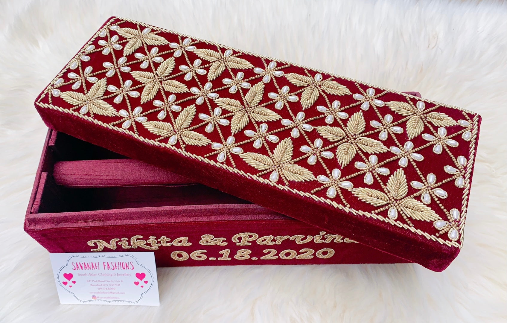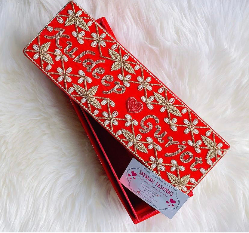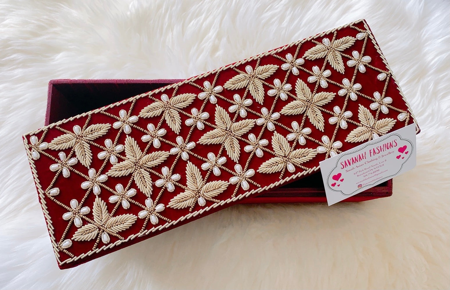 Pearls-meet-Dabka hand embroidery for this velvet bangle box.