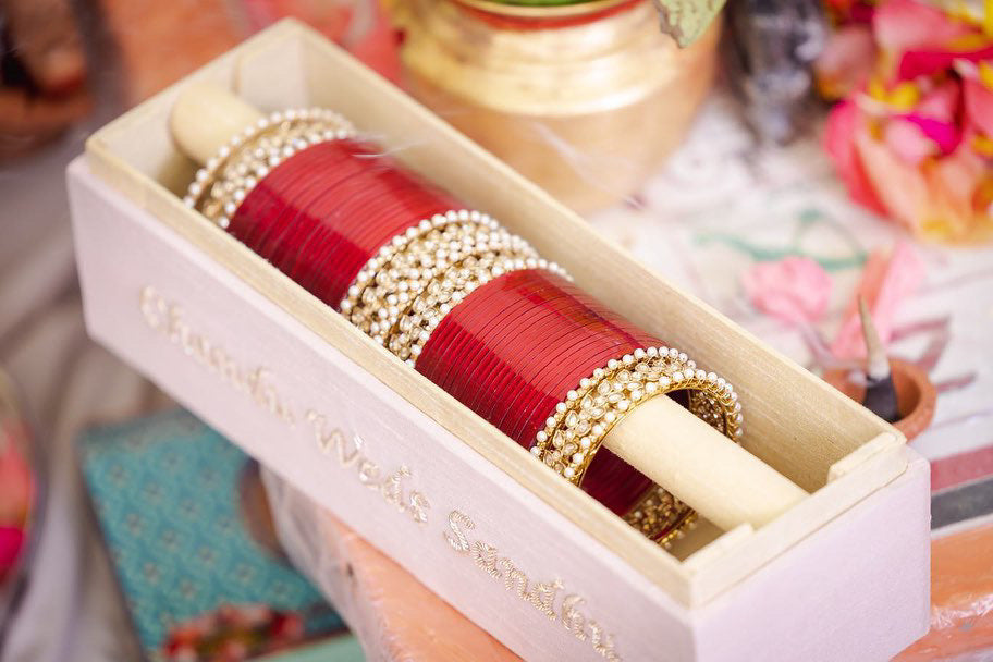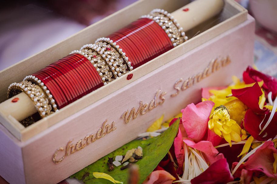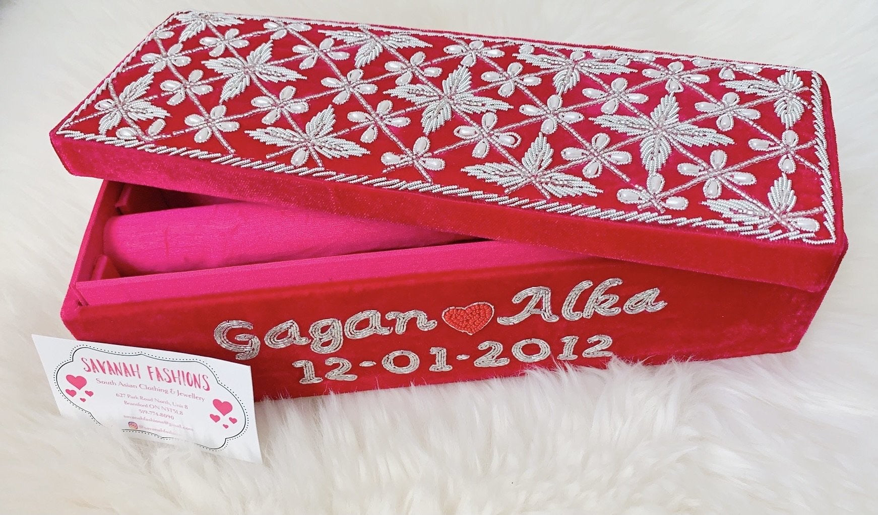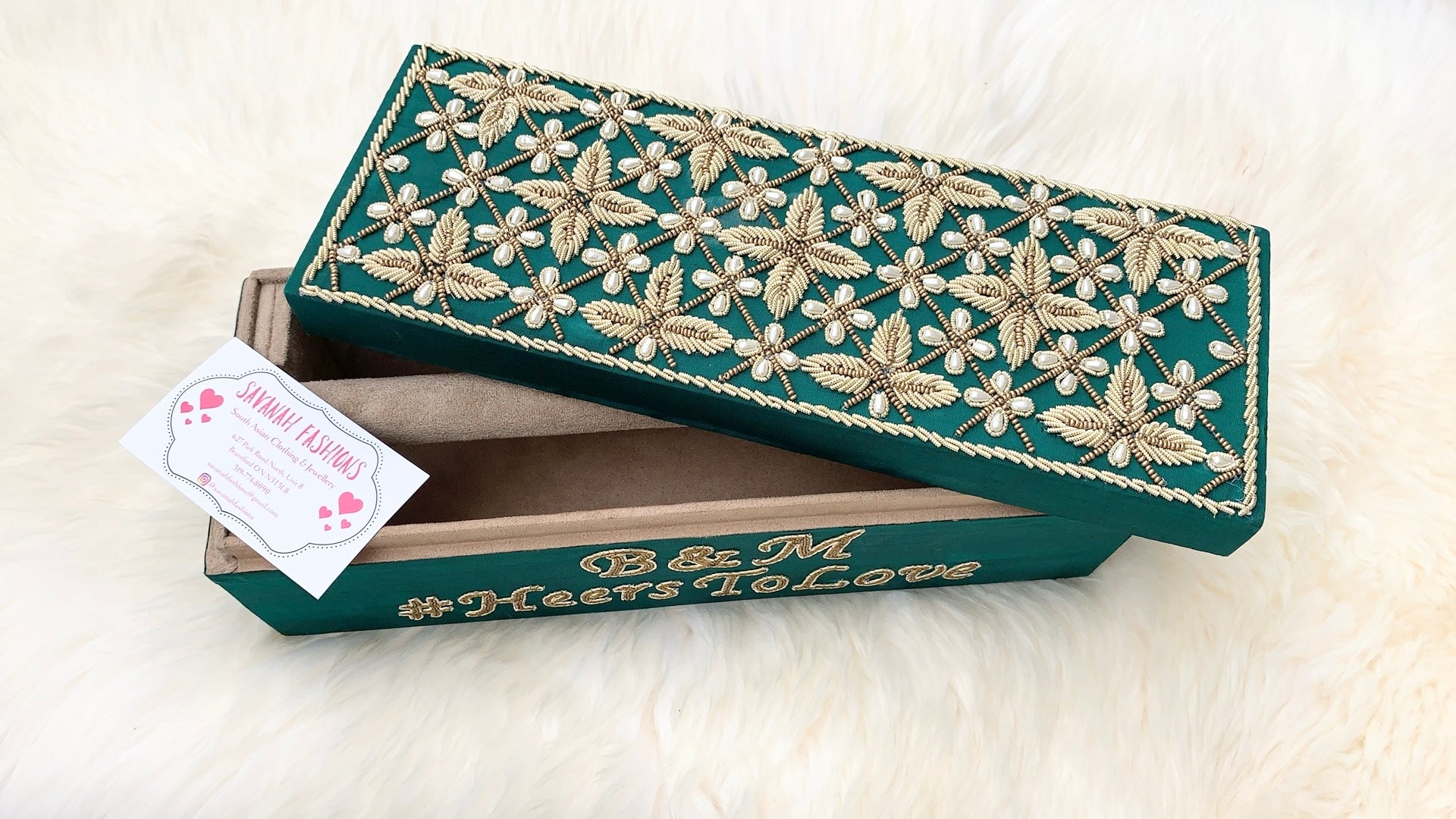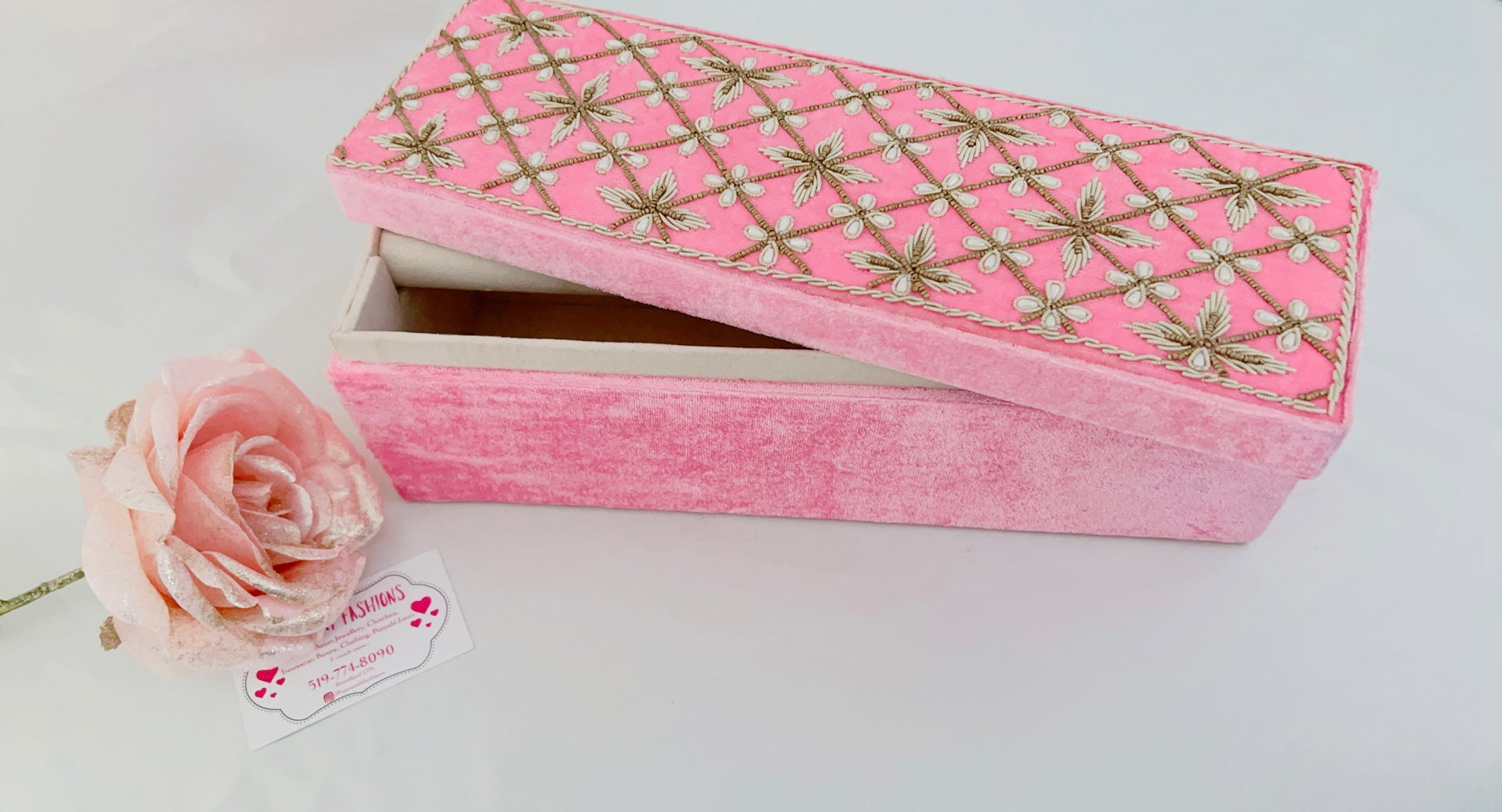 Pearls-meet-Dabka hand embroidery for this velvet bangle box.