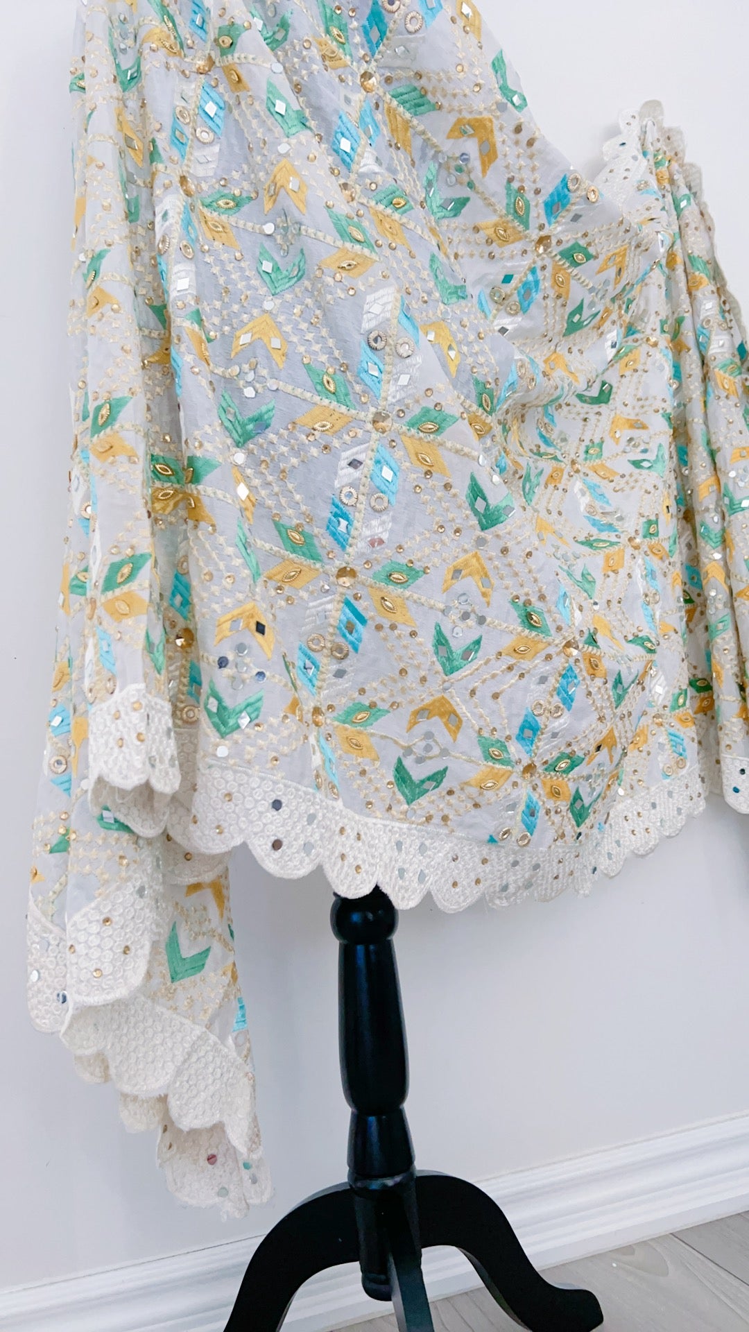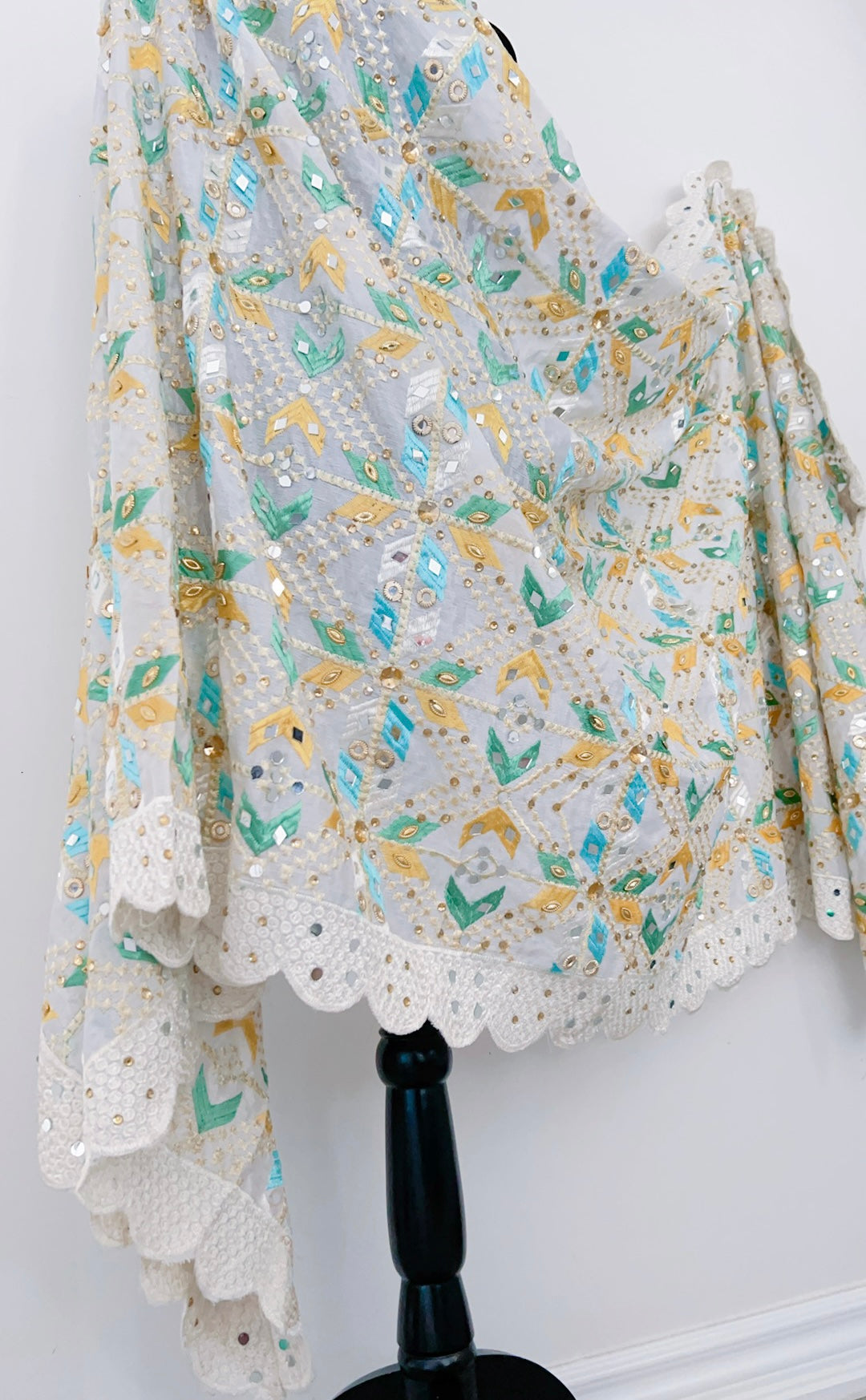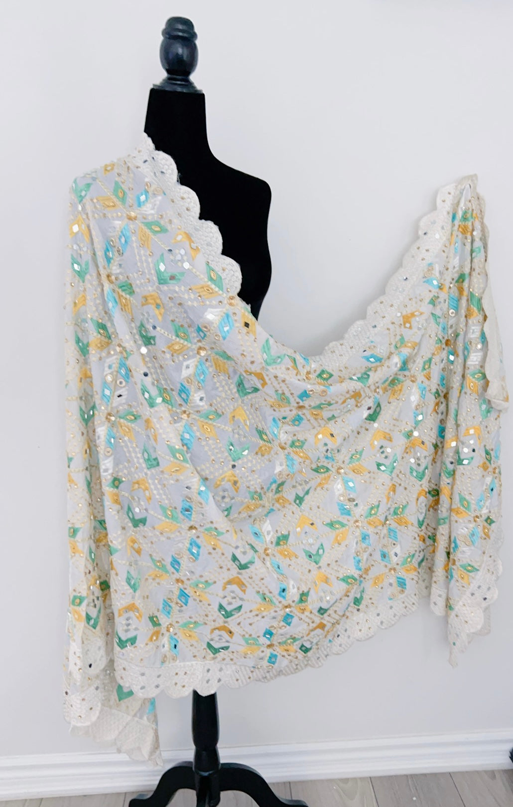 Heavily embroidered phulkari dupatta. This versatile dupatta can be matched with a plain suit for the ultra glam style; ideal for a party or bridal photoshoot; as a Maiyan chunni decor for the bride or groom.