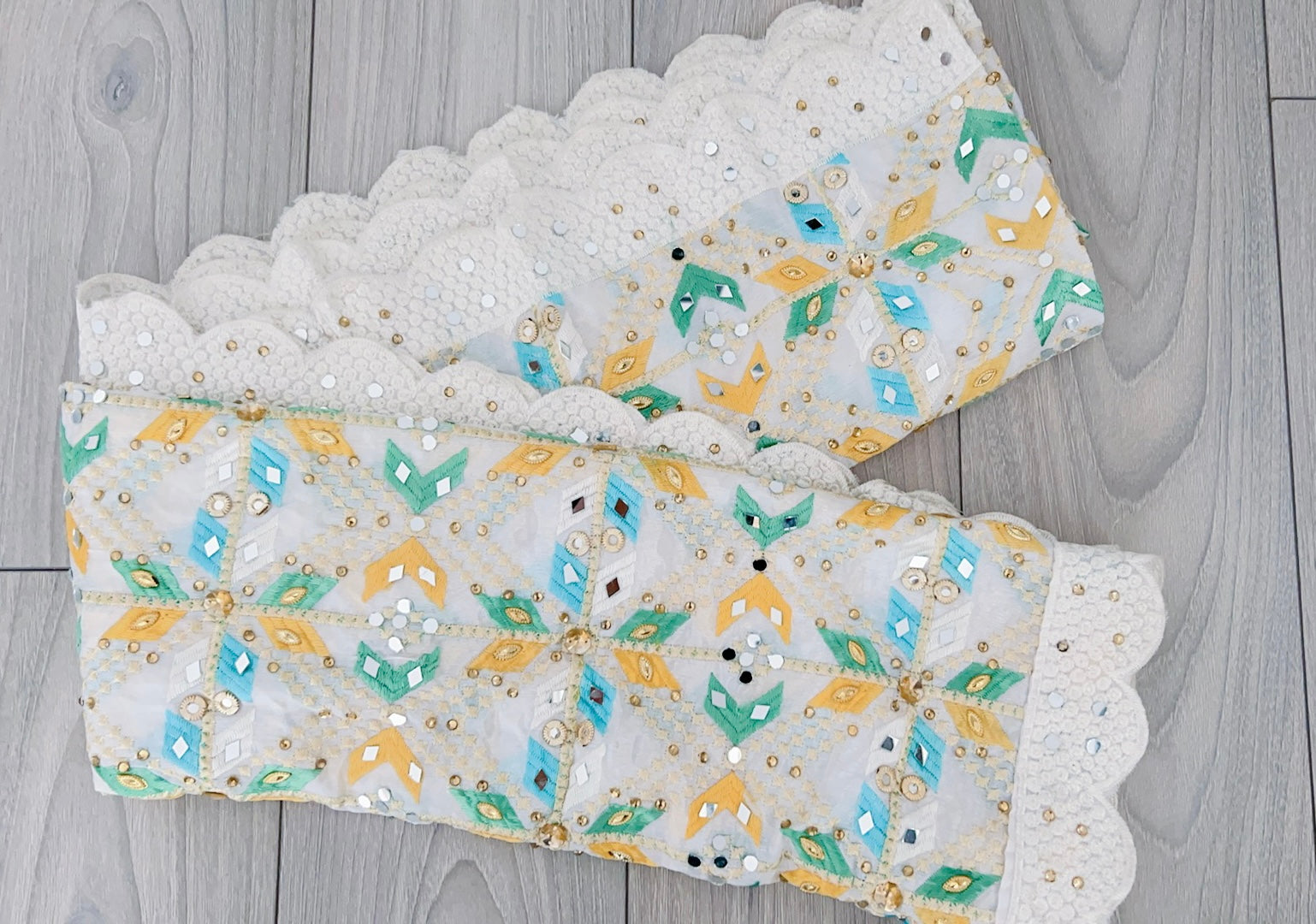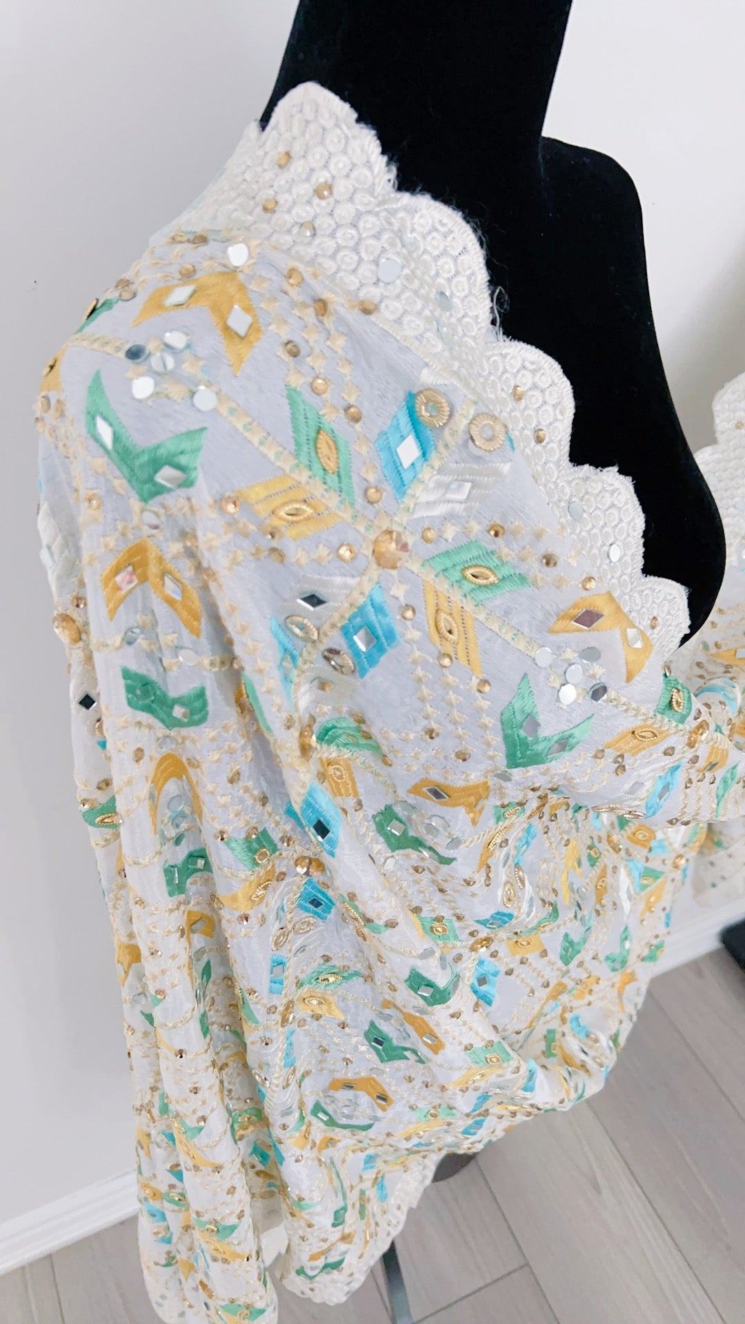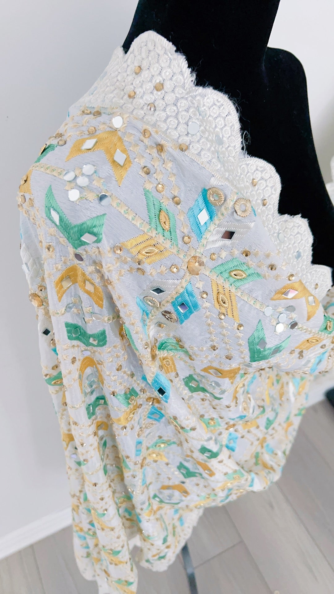 Heavily embroidered phulkari dupatta. This versatile dupatta can be matched with a plain suit for the ultra glam style; ideal for a party or bridal photoshoot; as a Maiyan chunni decor for the bride or groom.