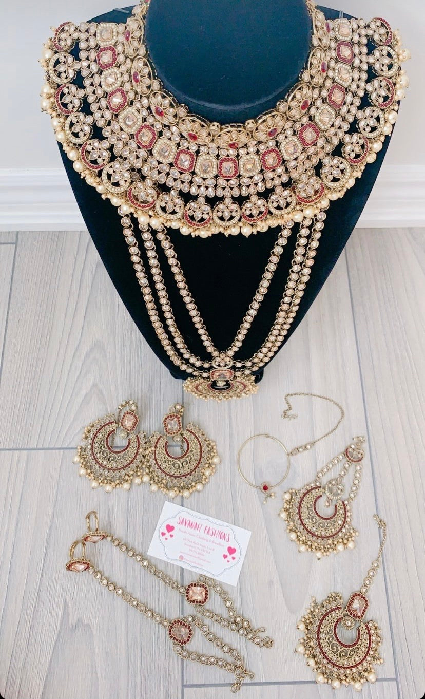 Full bridal set in stock! Set includes: Choker, Long Necklace, Earrings, Nose Ring, Hand Pieces, Tikka & Side Jhoomar. Maroon in colour.