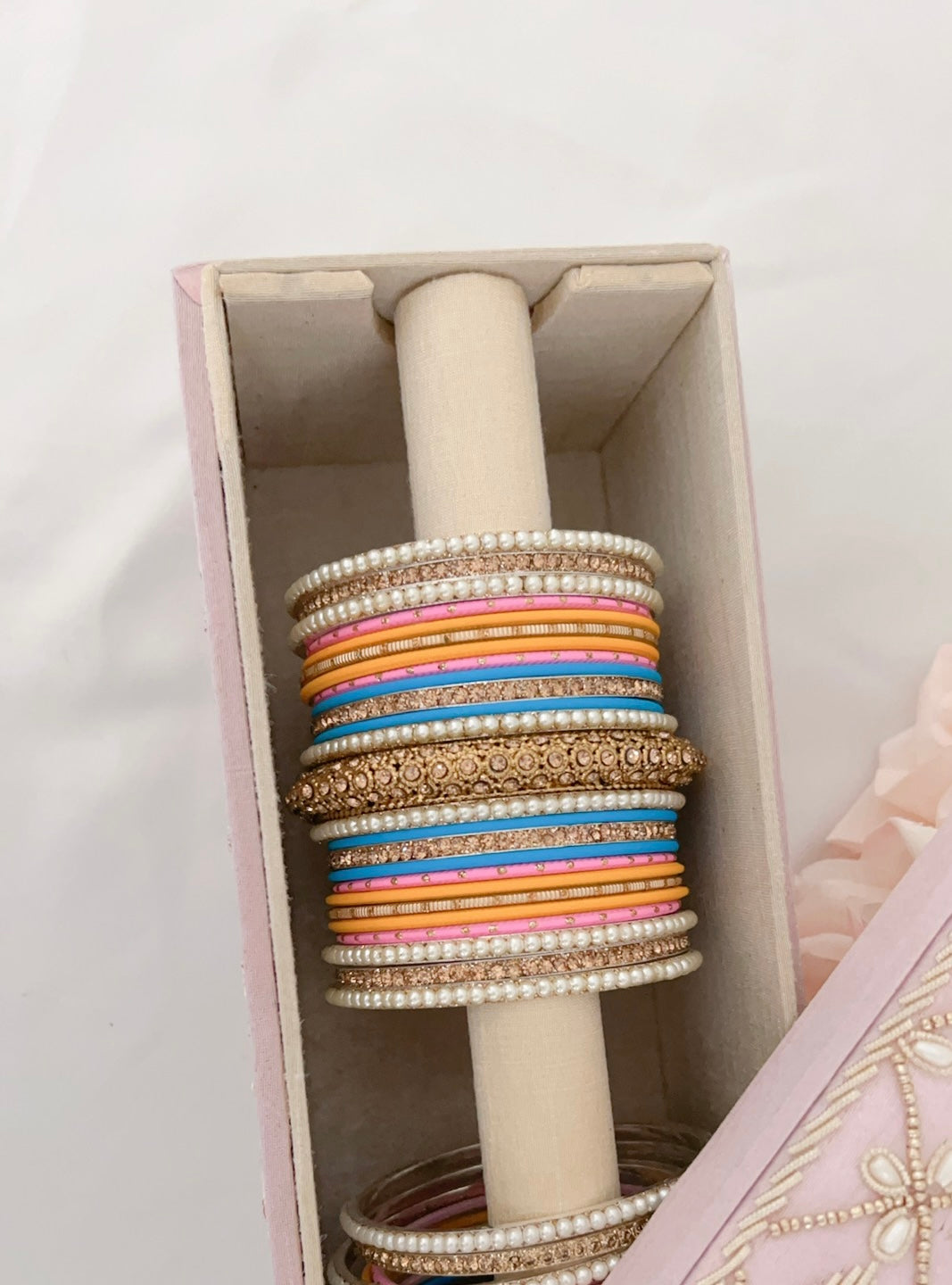 This set consists of simple stone and pearl bangles with coloured velvet or matte bangles. Made to your size. Bangles are available in many colours subject to size. Price is reflected for 2 sets (both hands).