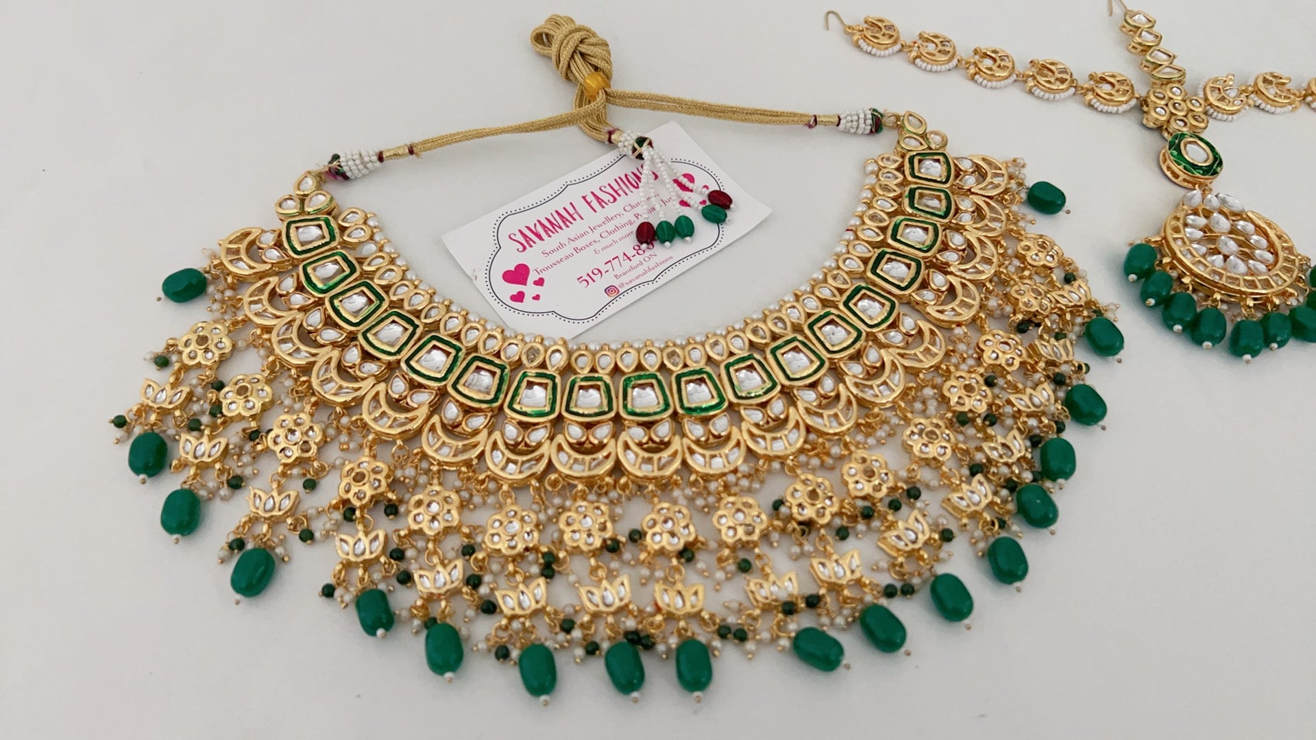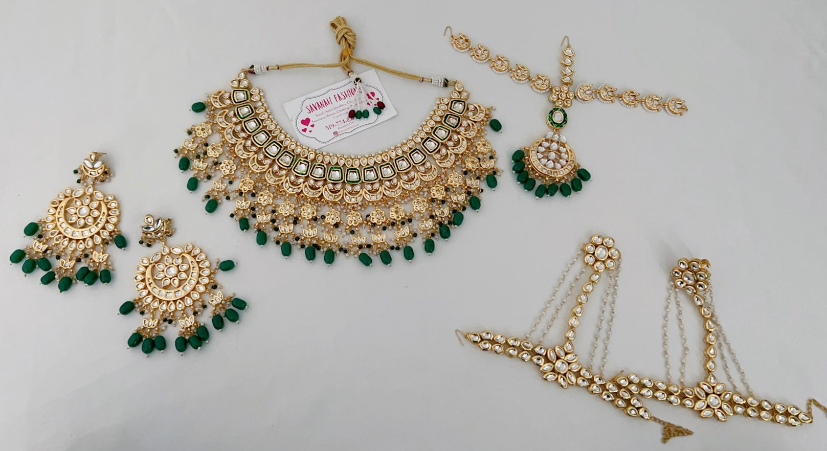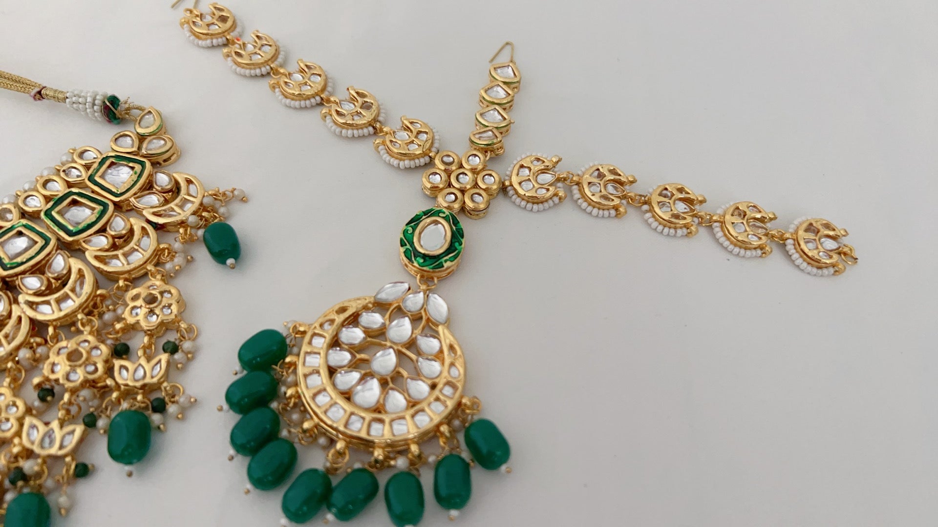 Kundan base bridal set that hugs your neck. Full set includes: Choker, earrings, Matha patti (head piece), and hand accessories (both hands).