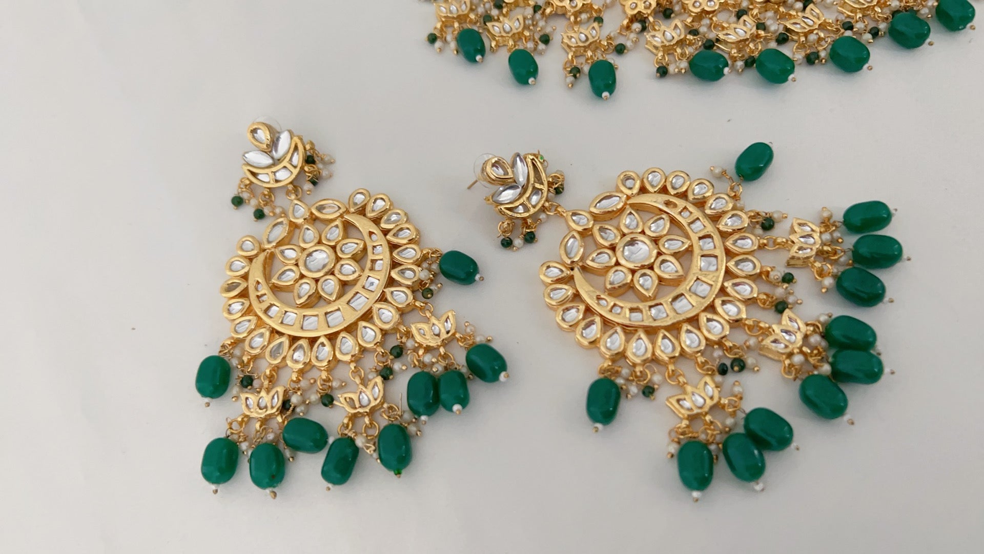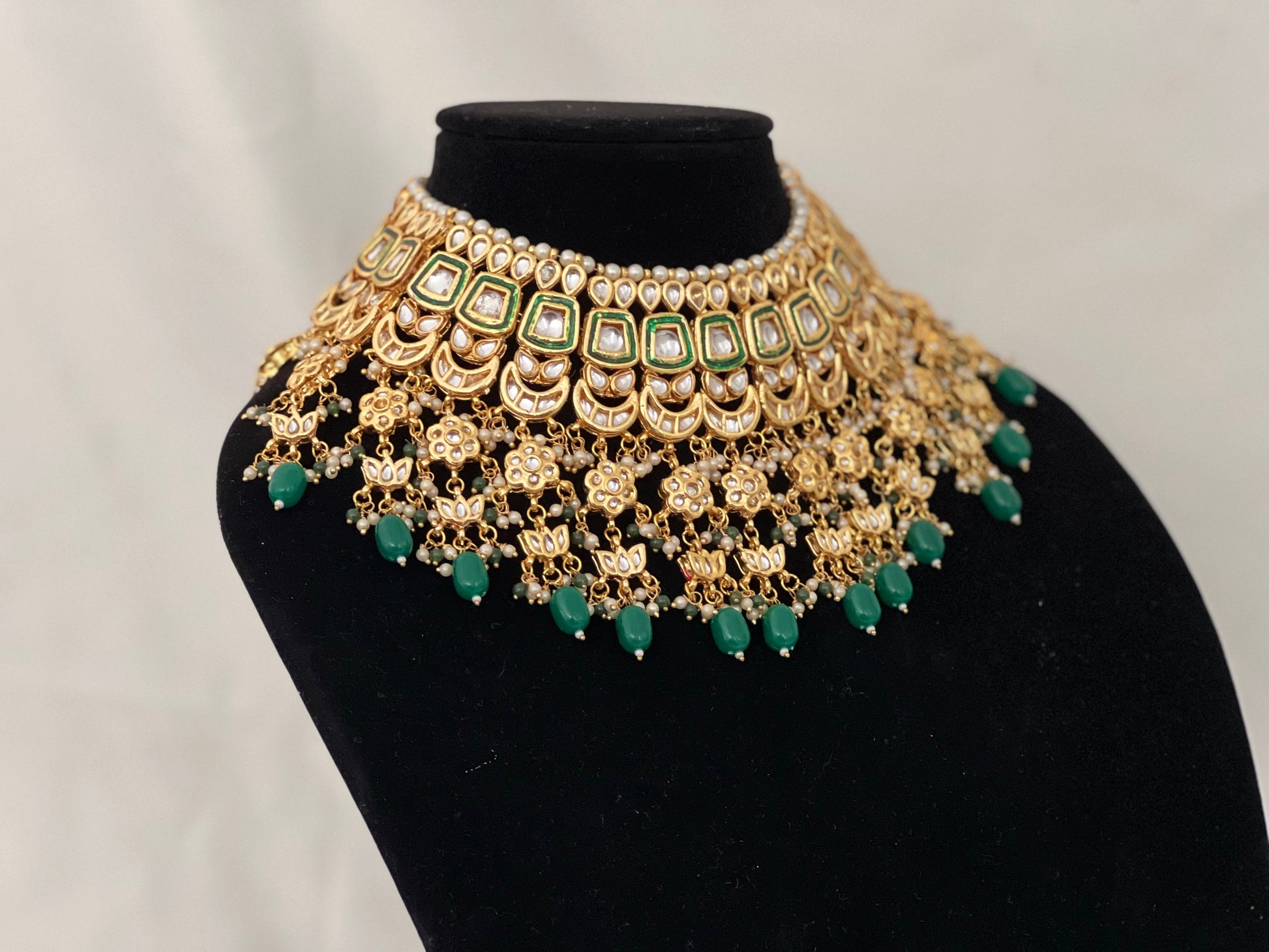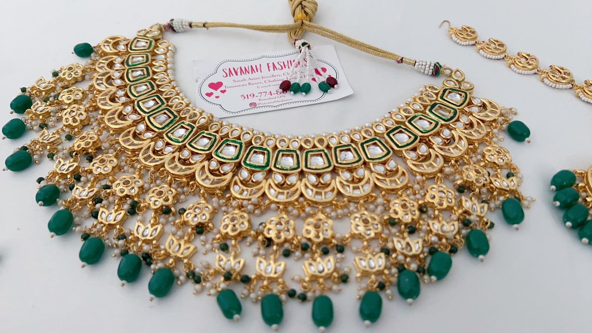 Kundan base bridal set that hugs your neck. Full set includes: Choker, earrings, Matha patti (head piece), and hand accessories (both hands).
