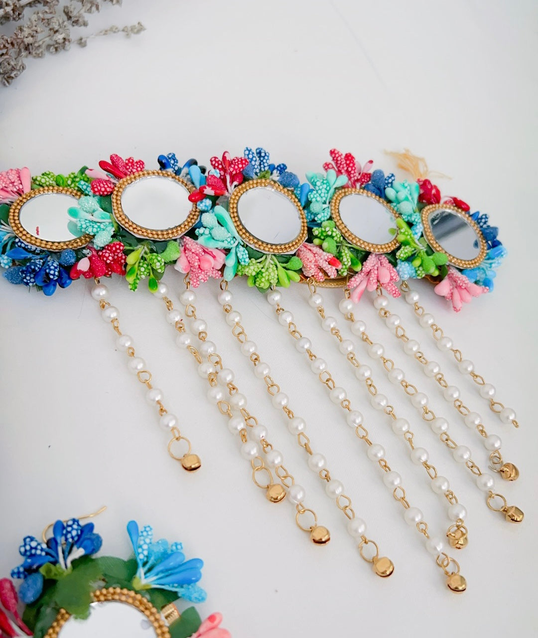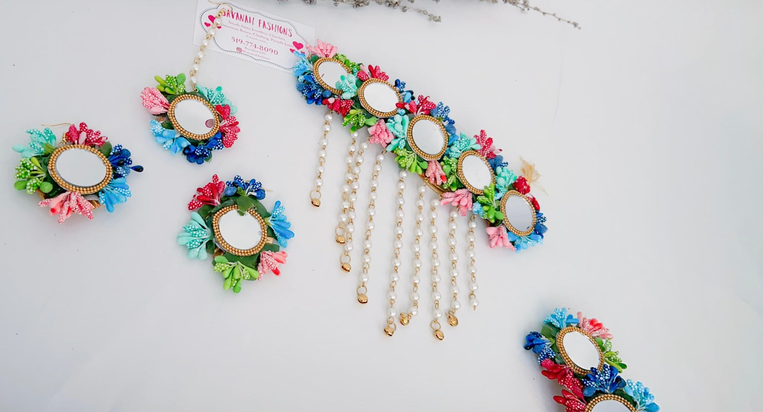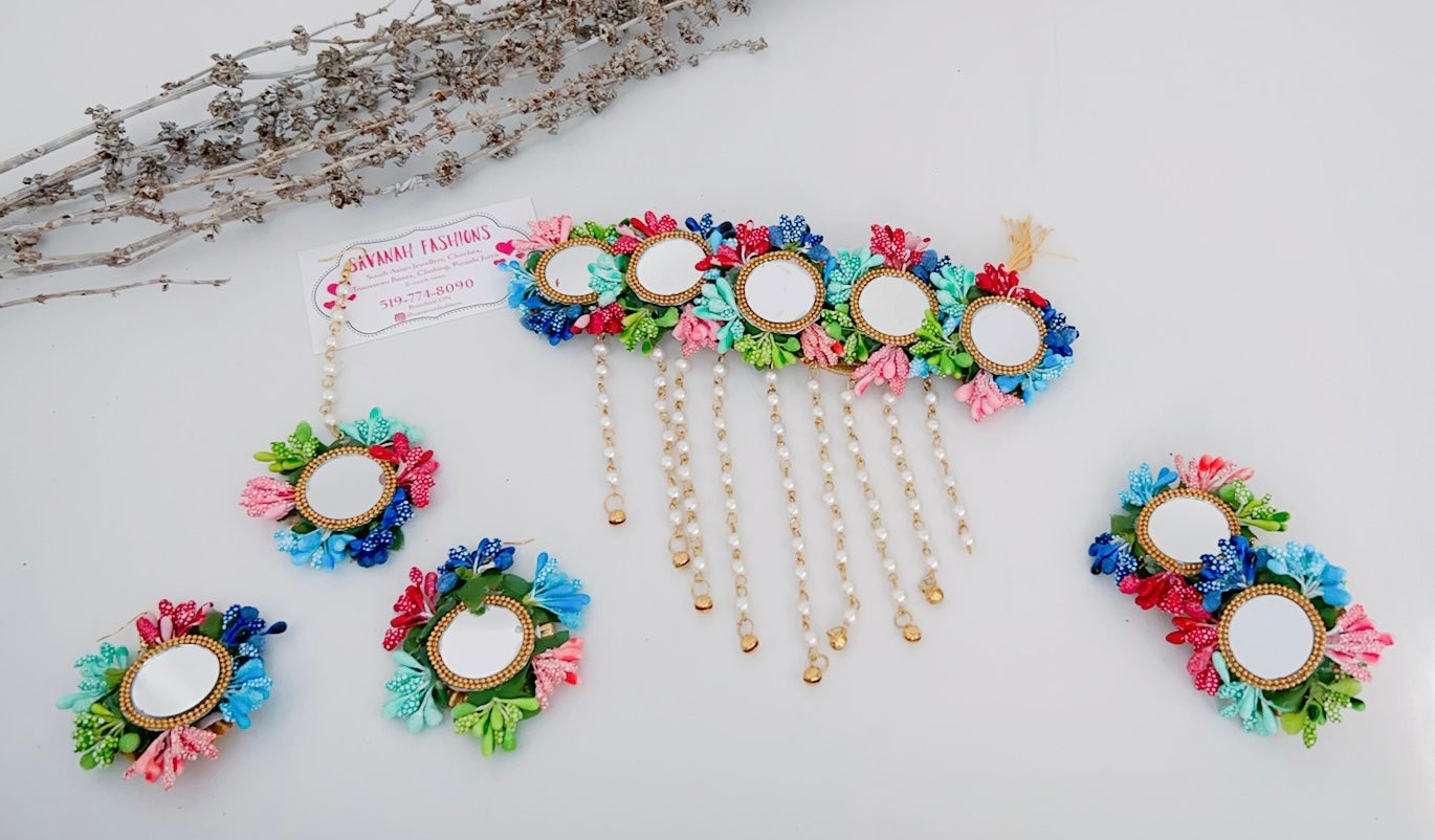 Beautifully put together flower jewellery for your maiyan/haldi event. Full set includes: necklace, tikka, earrings, hand accessories.