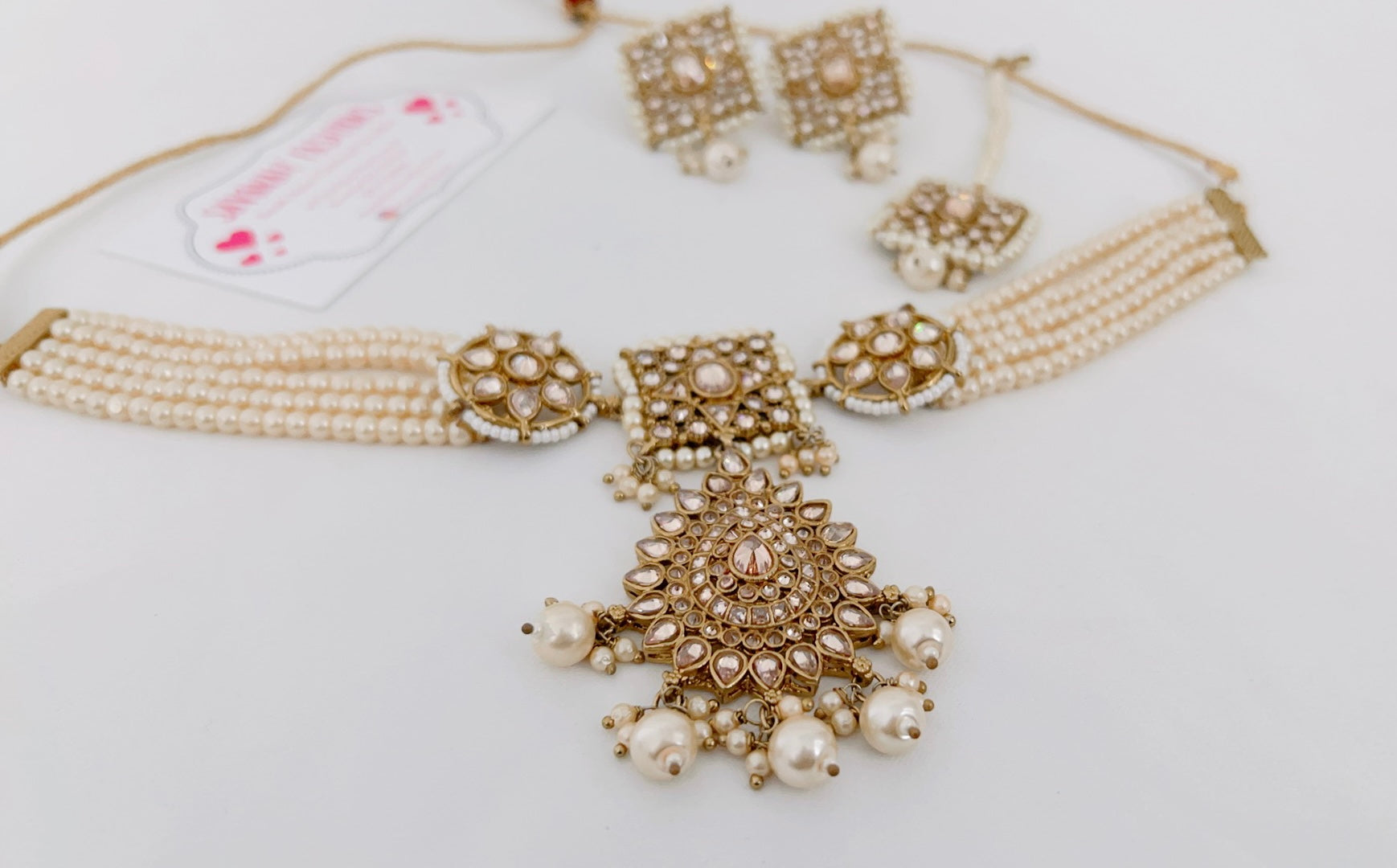 Our Clytie set has a gorgeous gold base with polki and royal pearls. This set includes a necklace that can be beautifully worn as a choker as well, earrings, and tikka. A perfect touch of royalty..