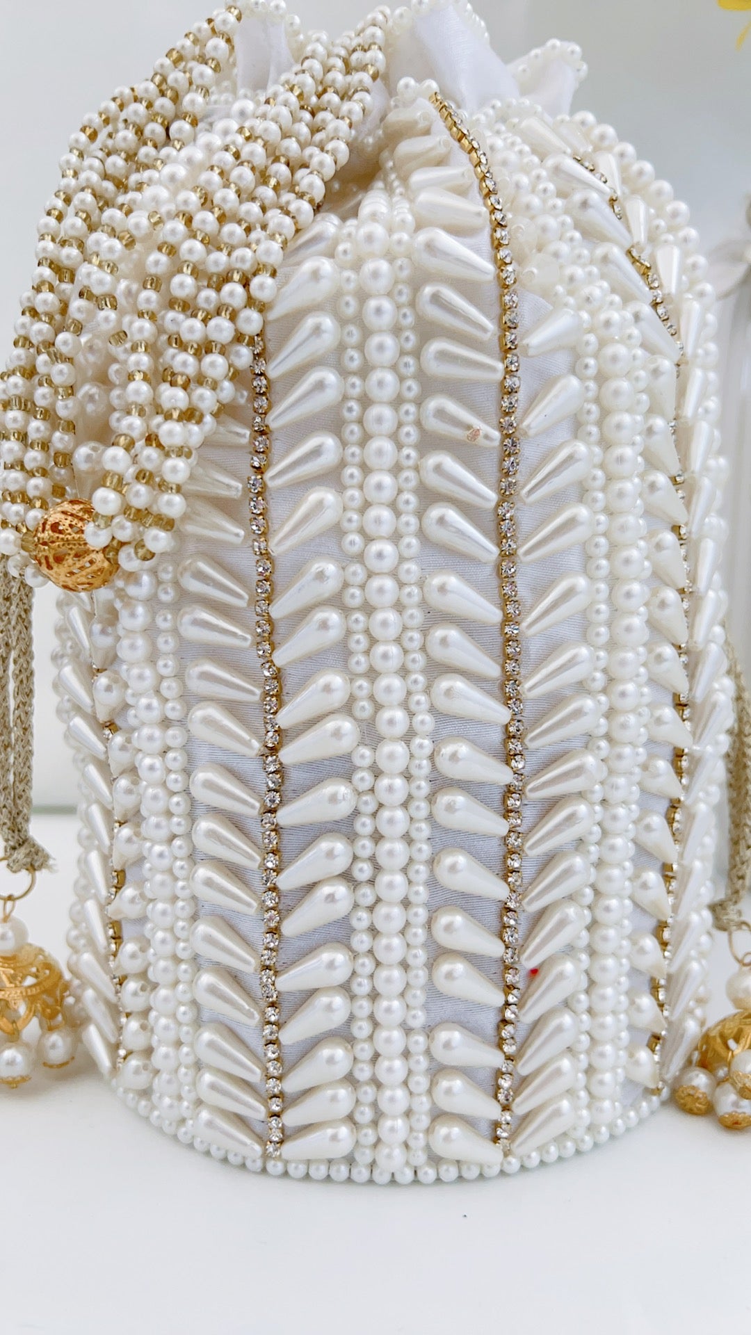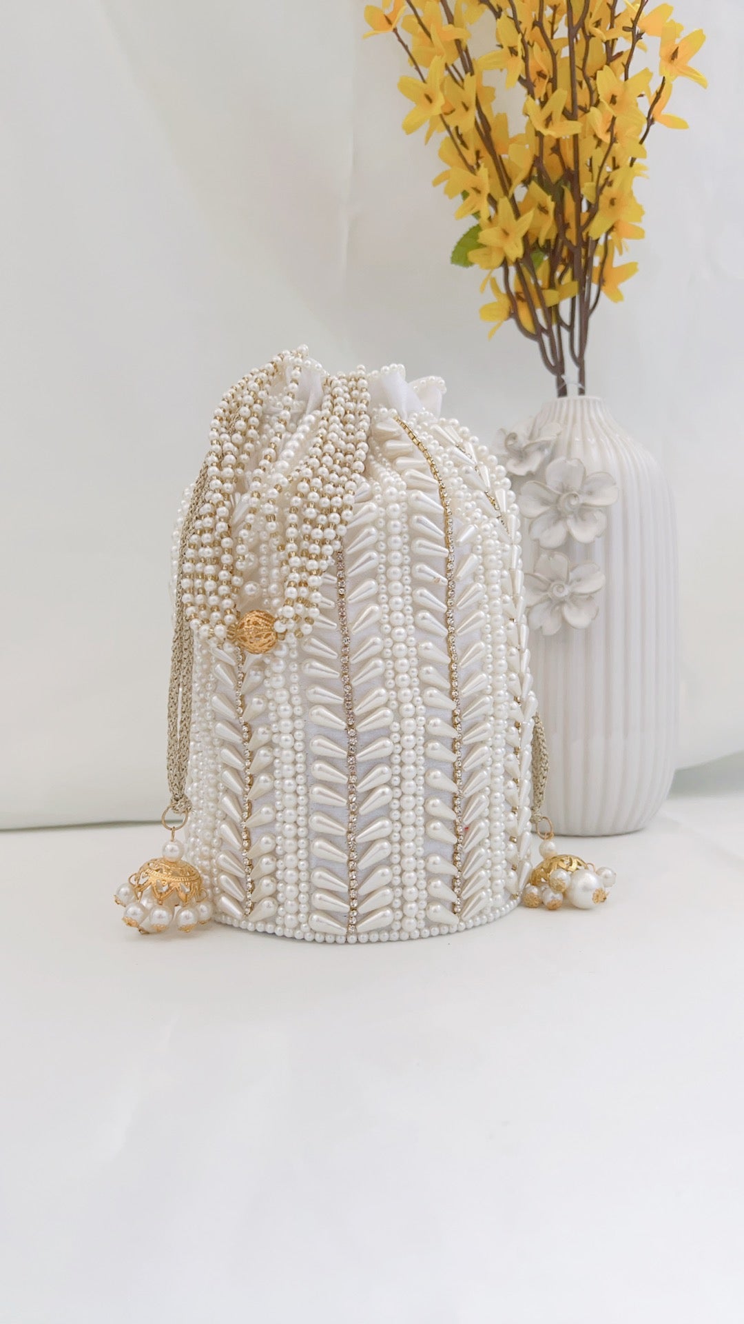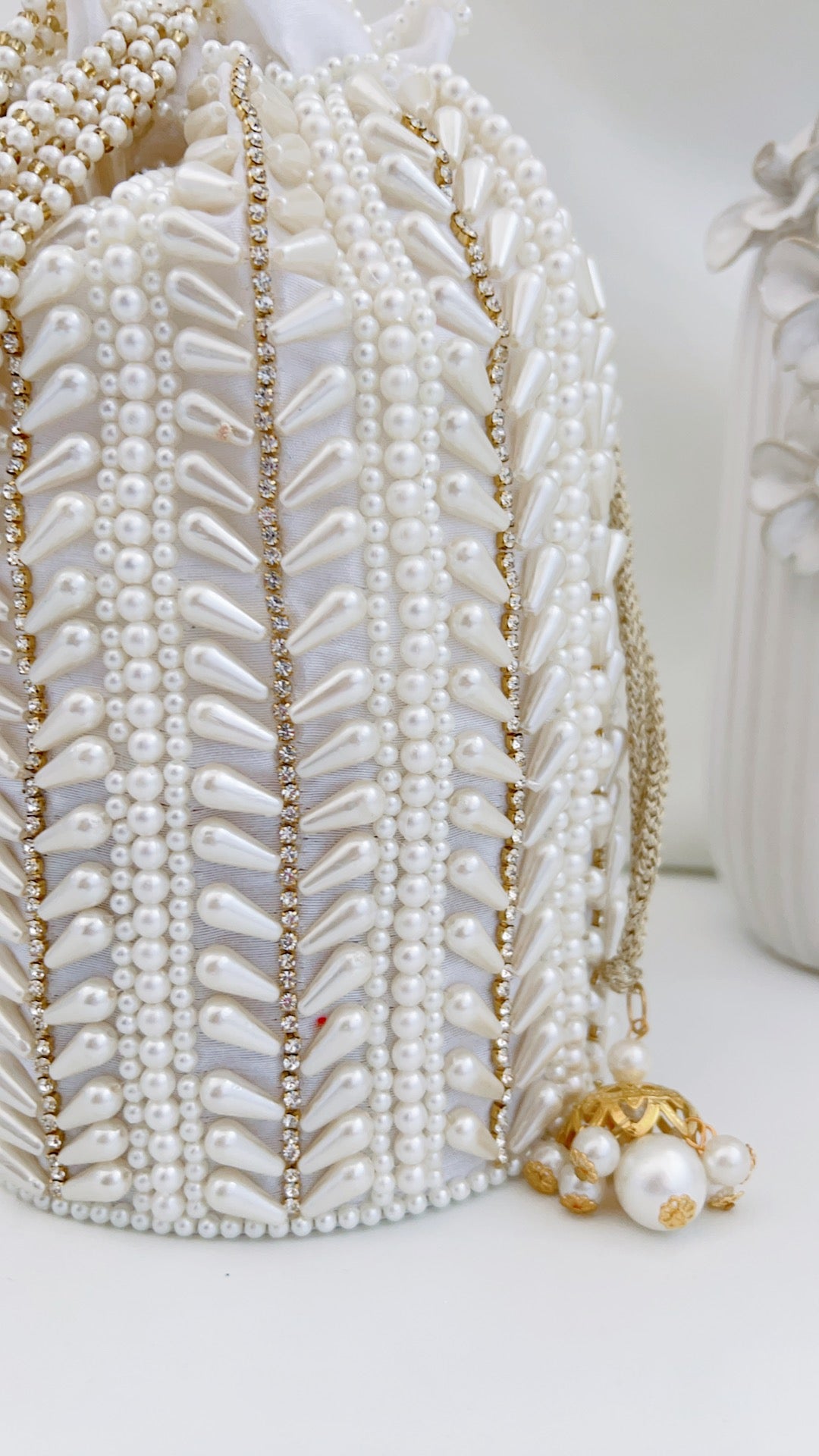 If only we could display the actual beauty of this product through photos! An absolute showstopper! This beautiful potli bag is made with raw silk fabric in a cylindrical shape and embellished with intricate hand embroidery pearl details all around. It has been finished with gorgeous latkans and pearl handle.