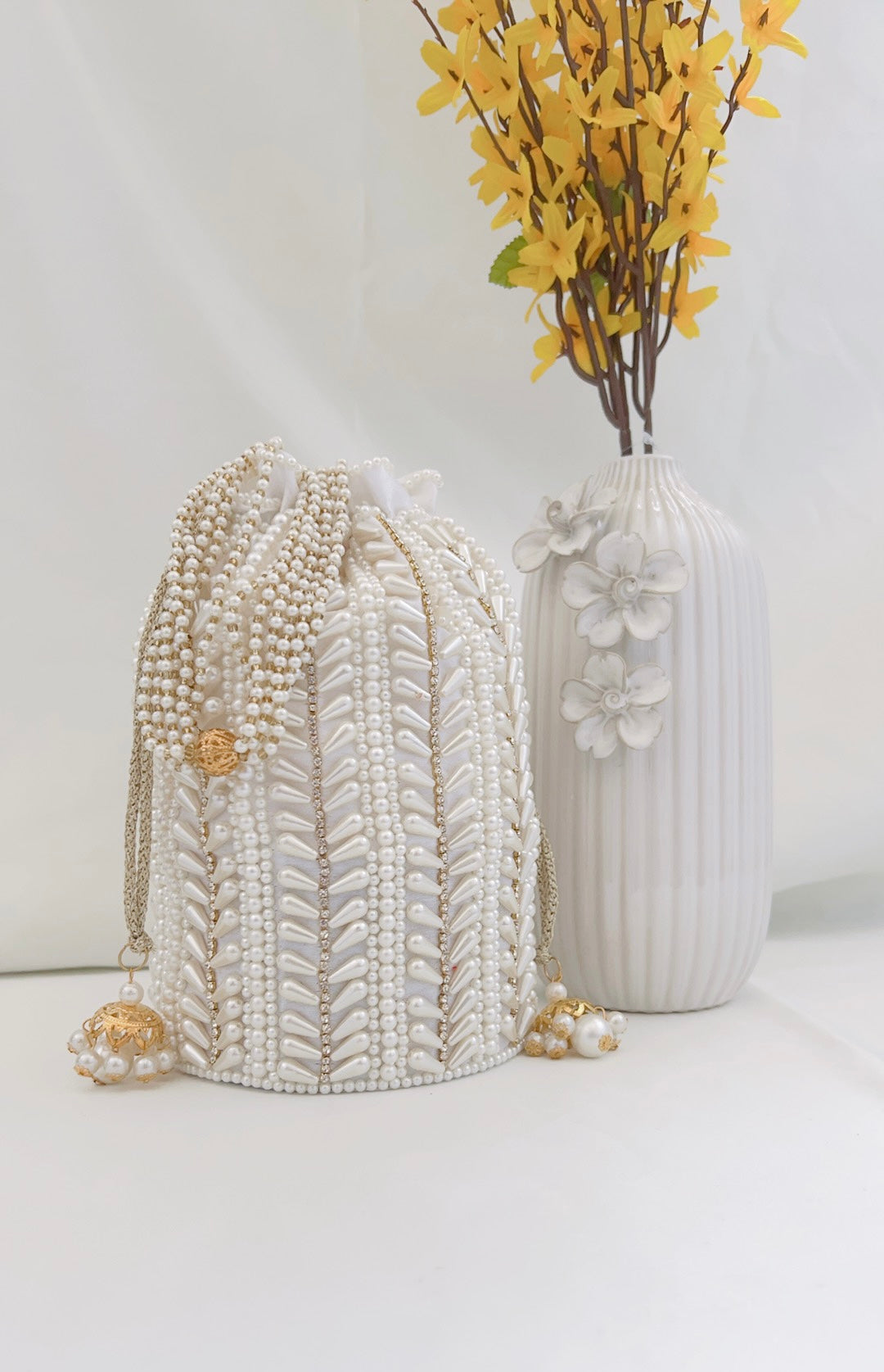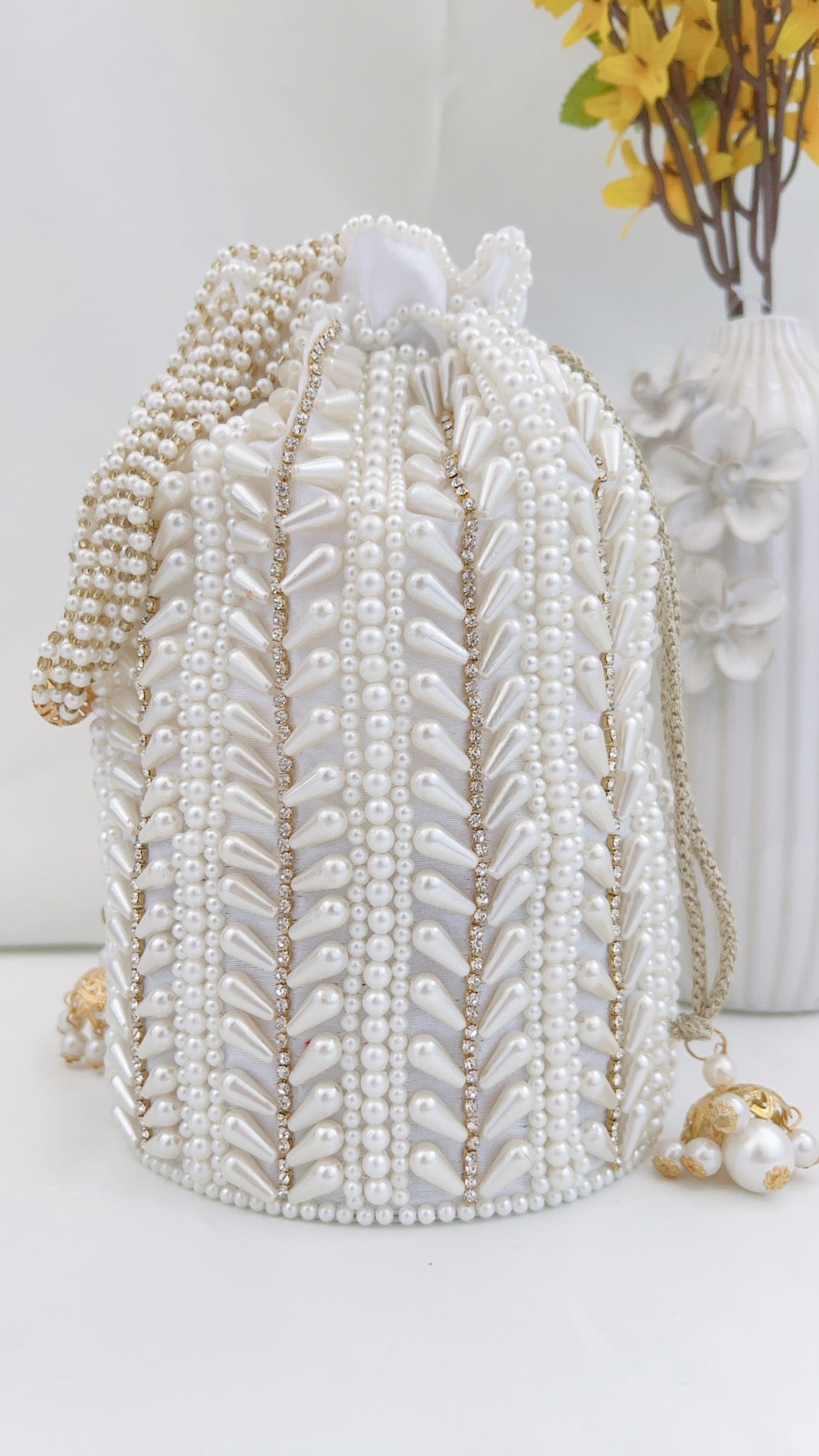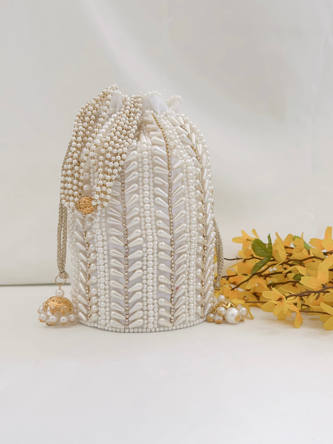 If only we could display the actual beauty of this product through photos! An absolute showstopper! This beautiful potli bag is made with raw silk fabric in a cylindrical shape and embellished with intricate hand embroidery pearl details all around. It has been finished with gorgeous latkans and pearl handle.