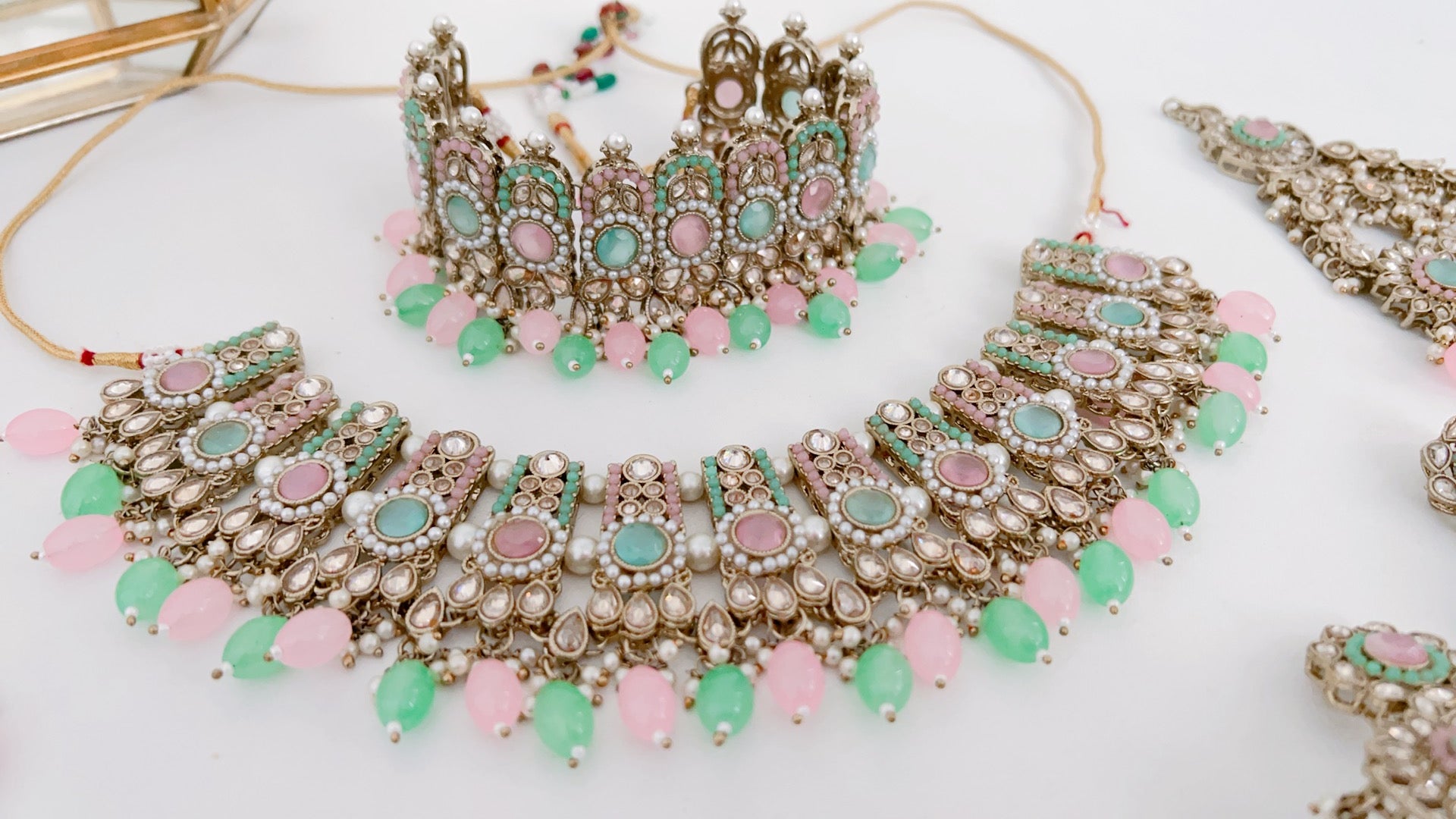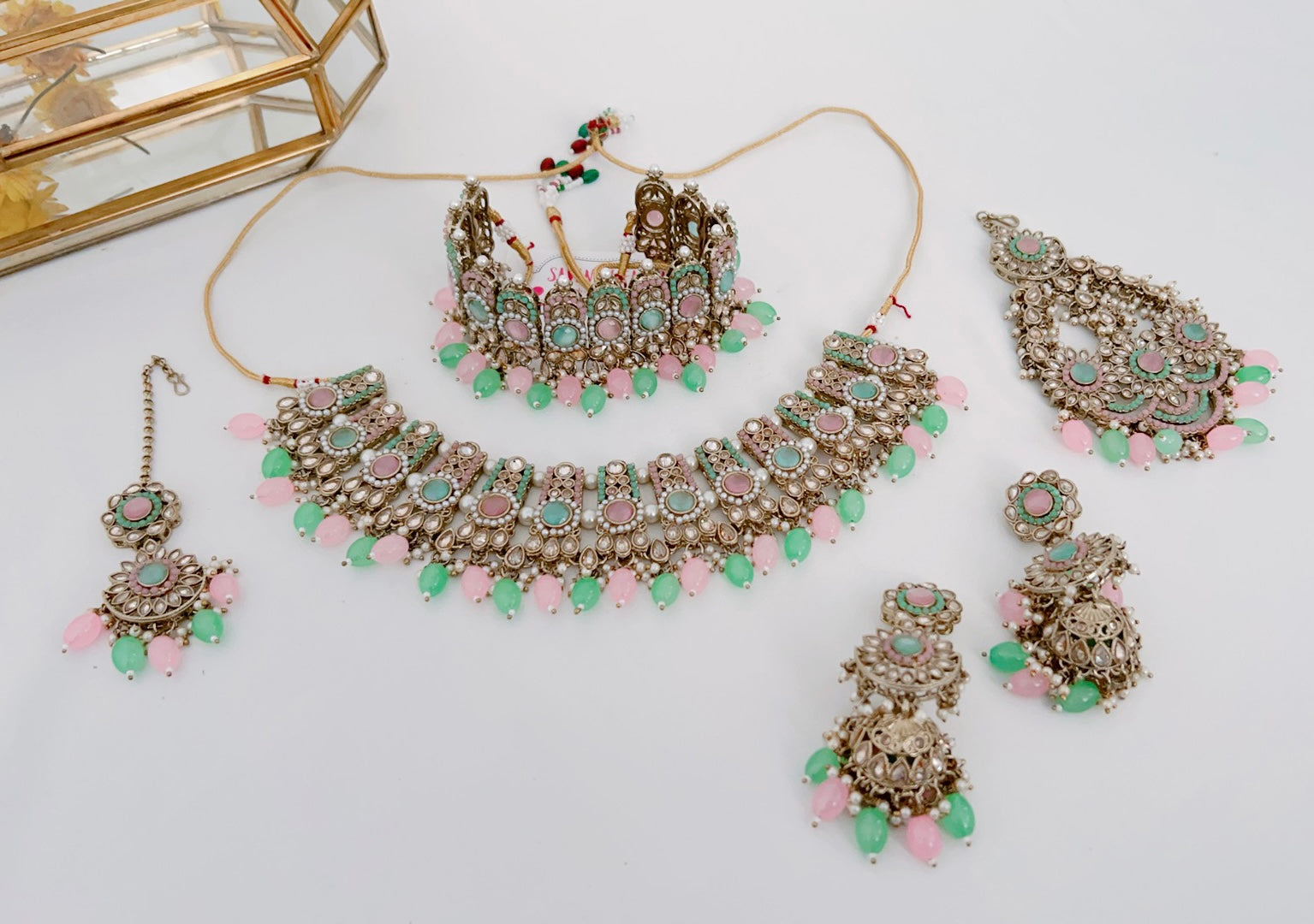Green and pink colour combination for this semi-bridal necklace set. This double necklace design features a choker and necklace which can be worn together or separately; along with earrings, passa/jhoomar, and tikka to get that full glam!