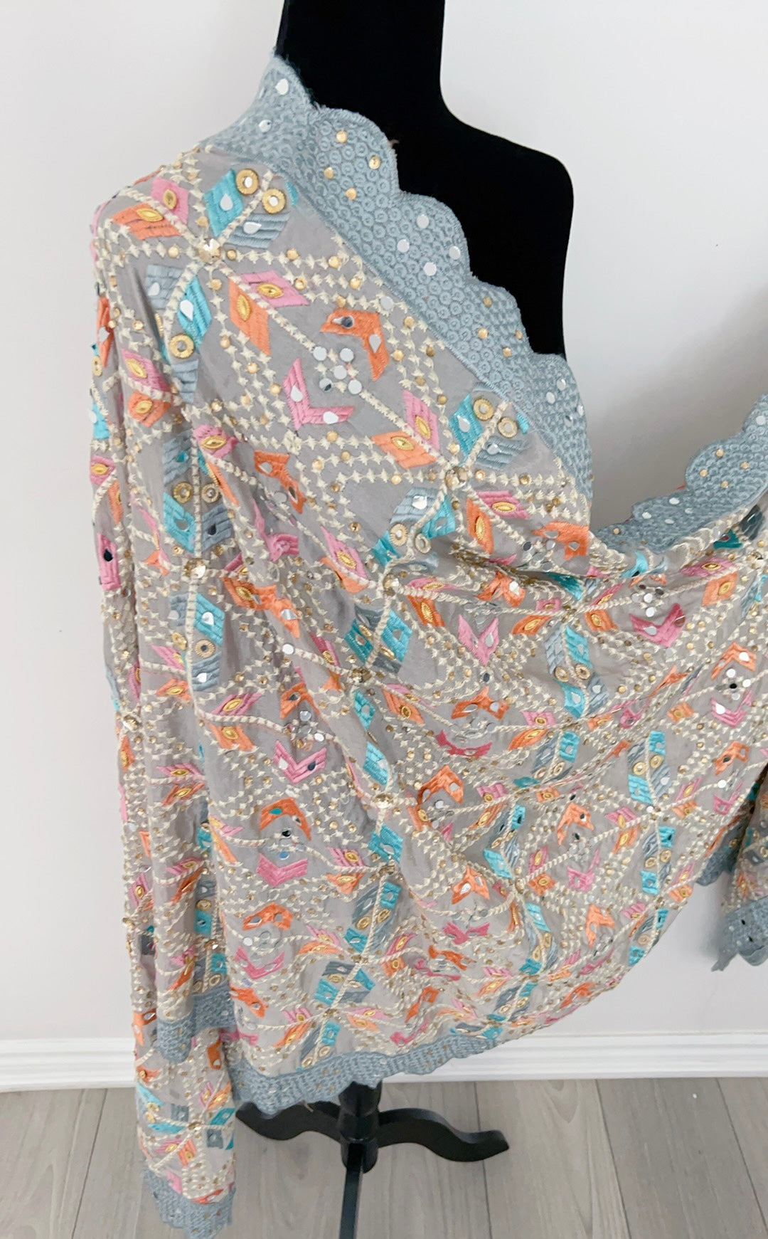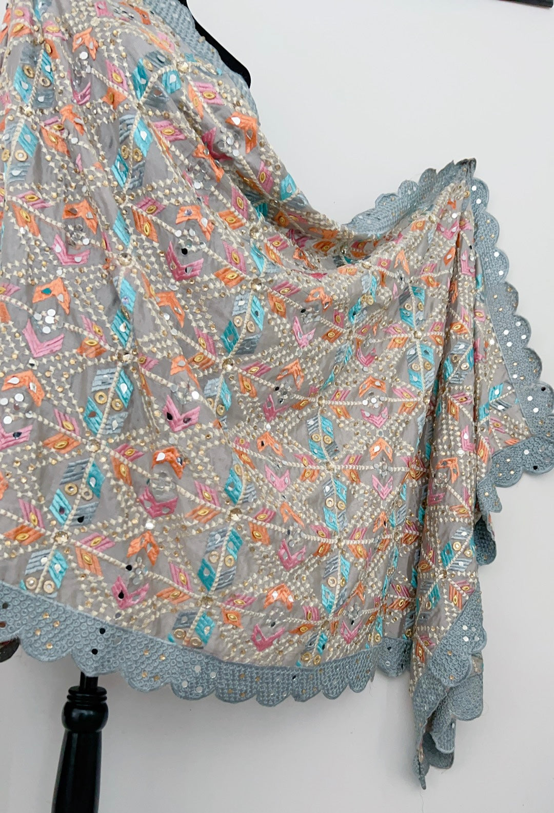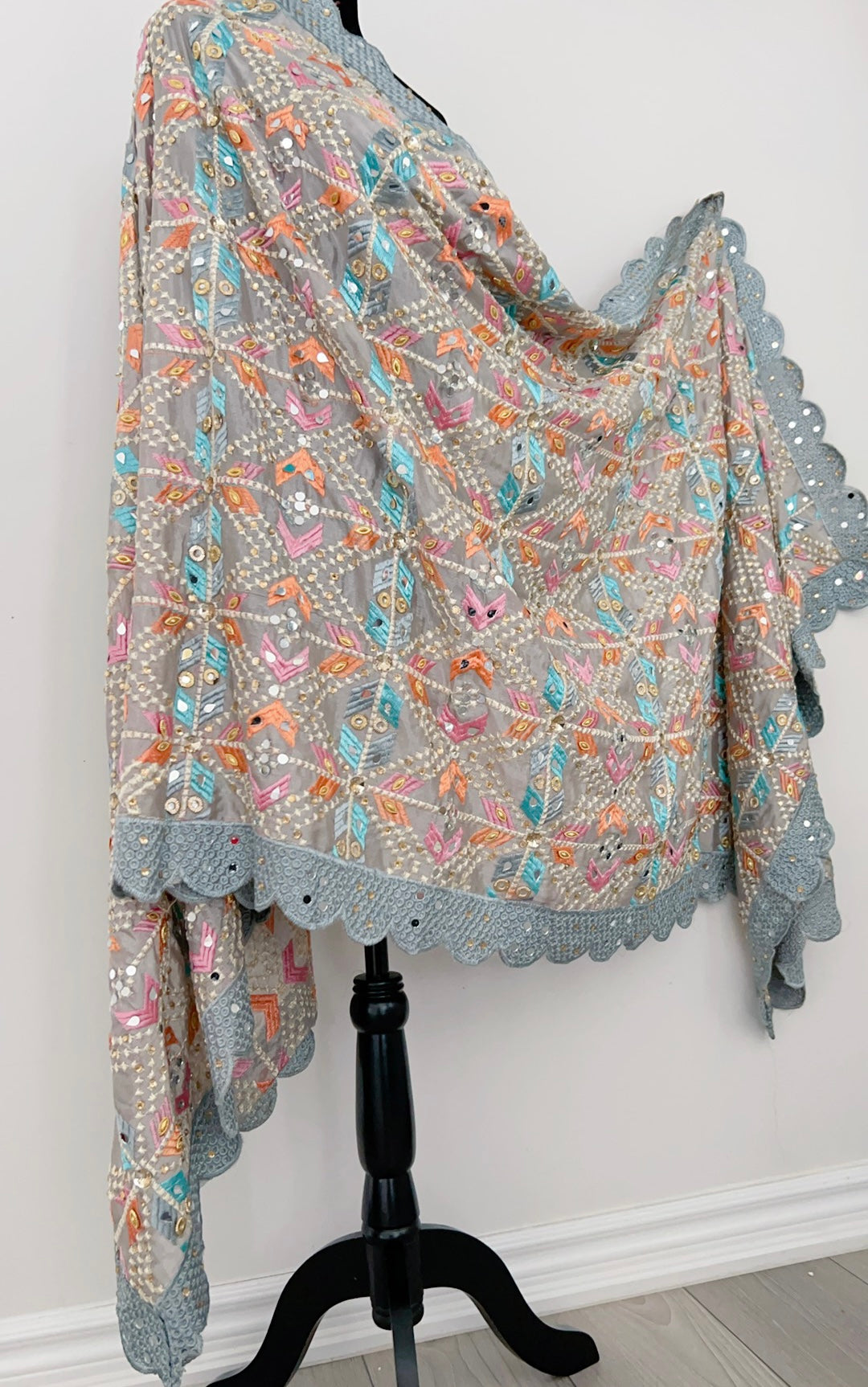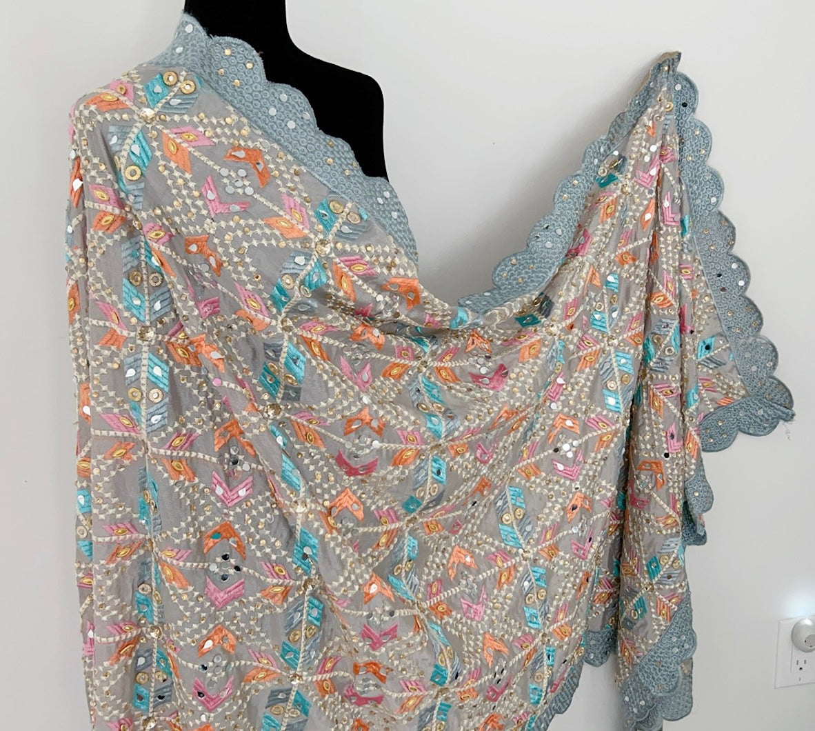 Heavily embroidered phulkari dupatta. This versatile dupatta can be matched with a plain suit for the ultra glam style; ideal for a party or bridal photoshoot; as a Maiyan chunni decor for the bride or groom.