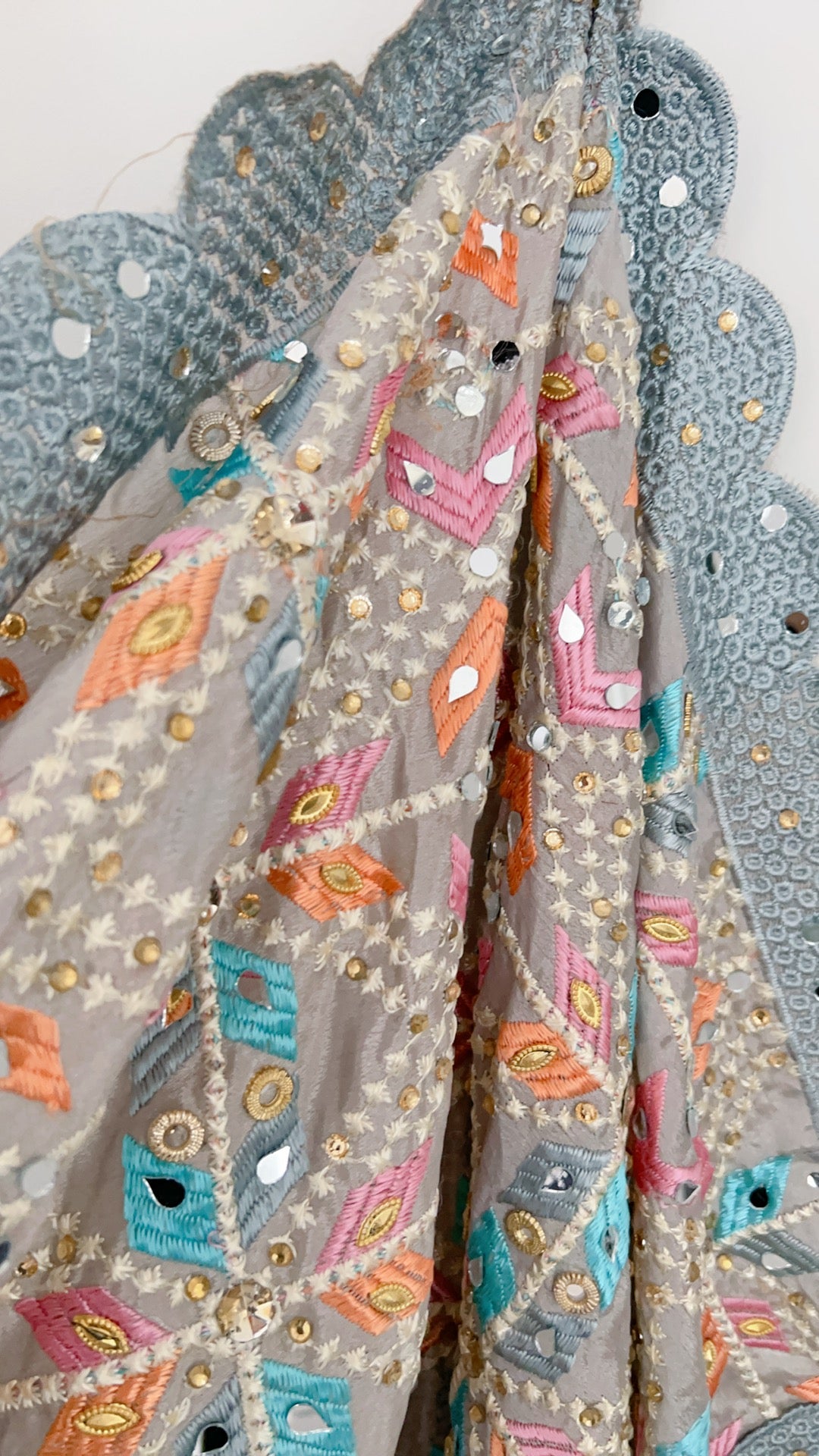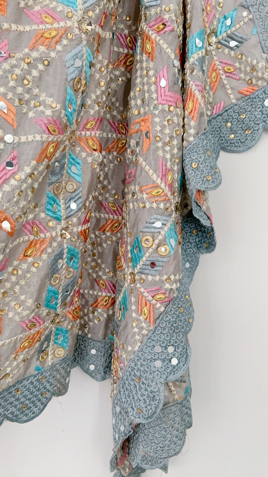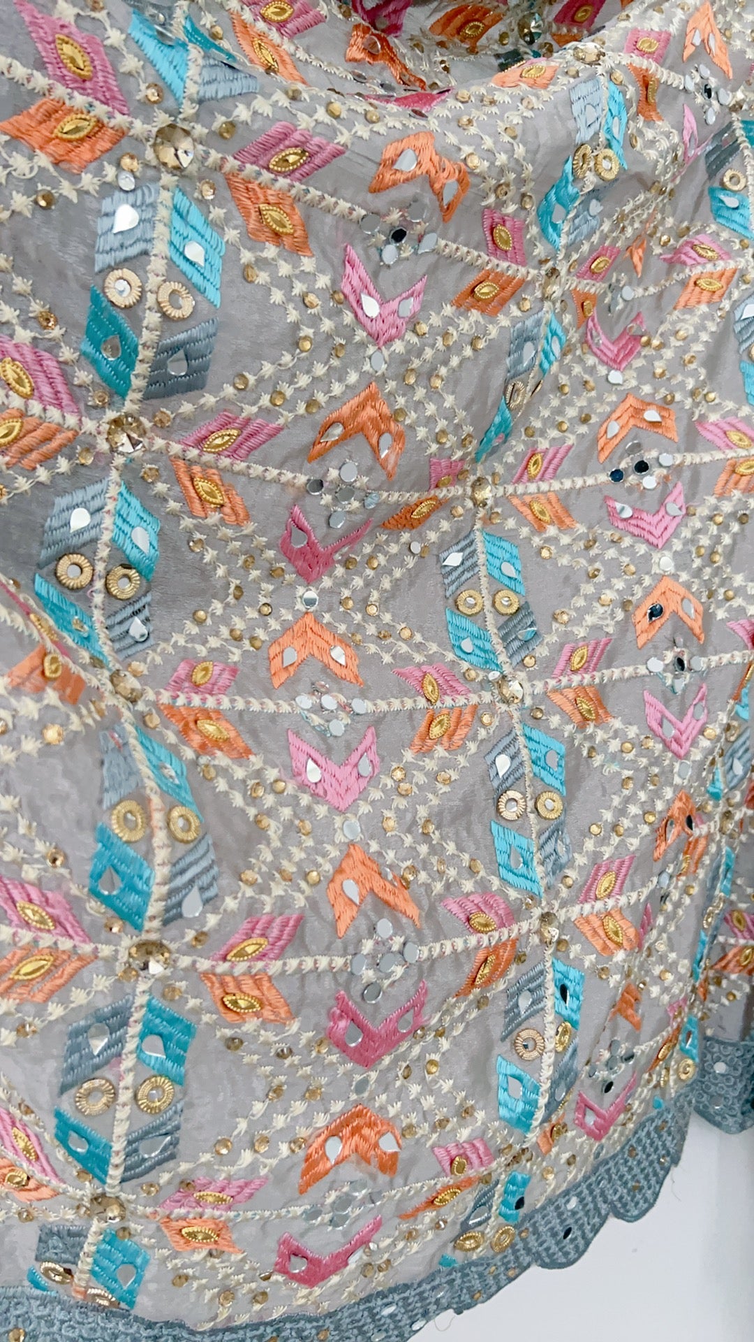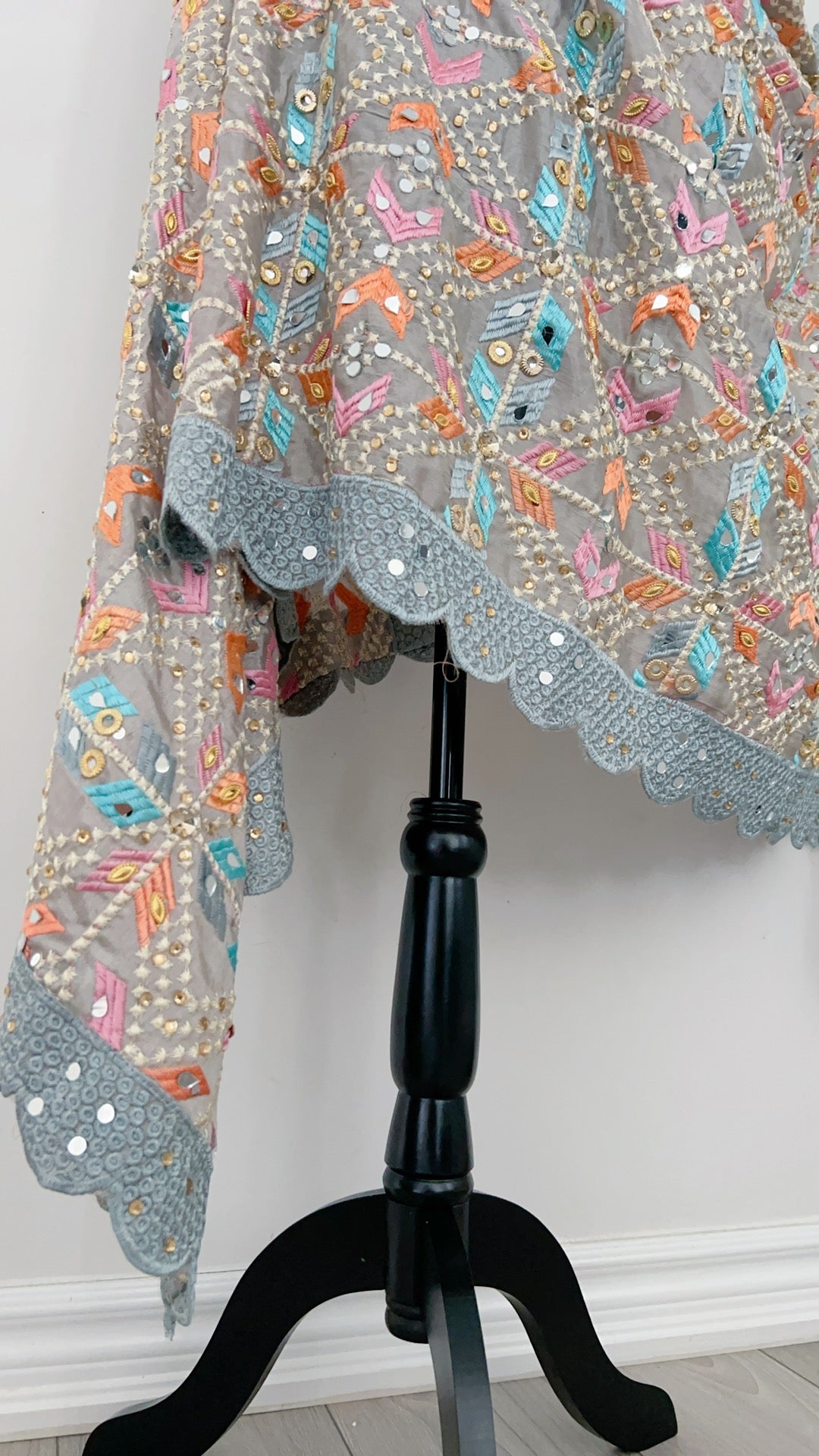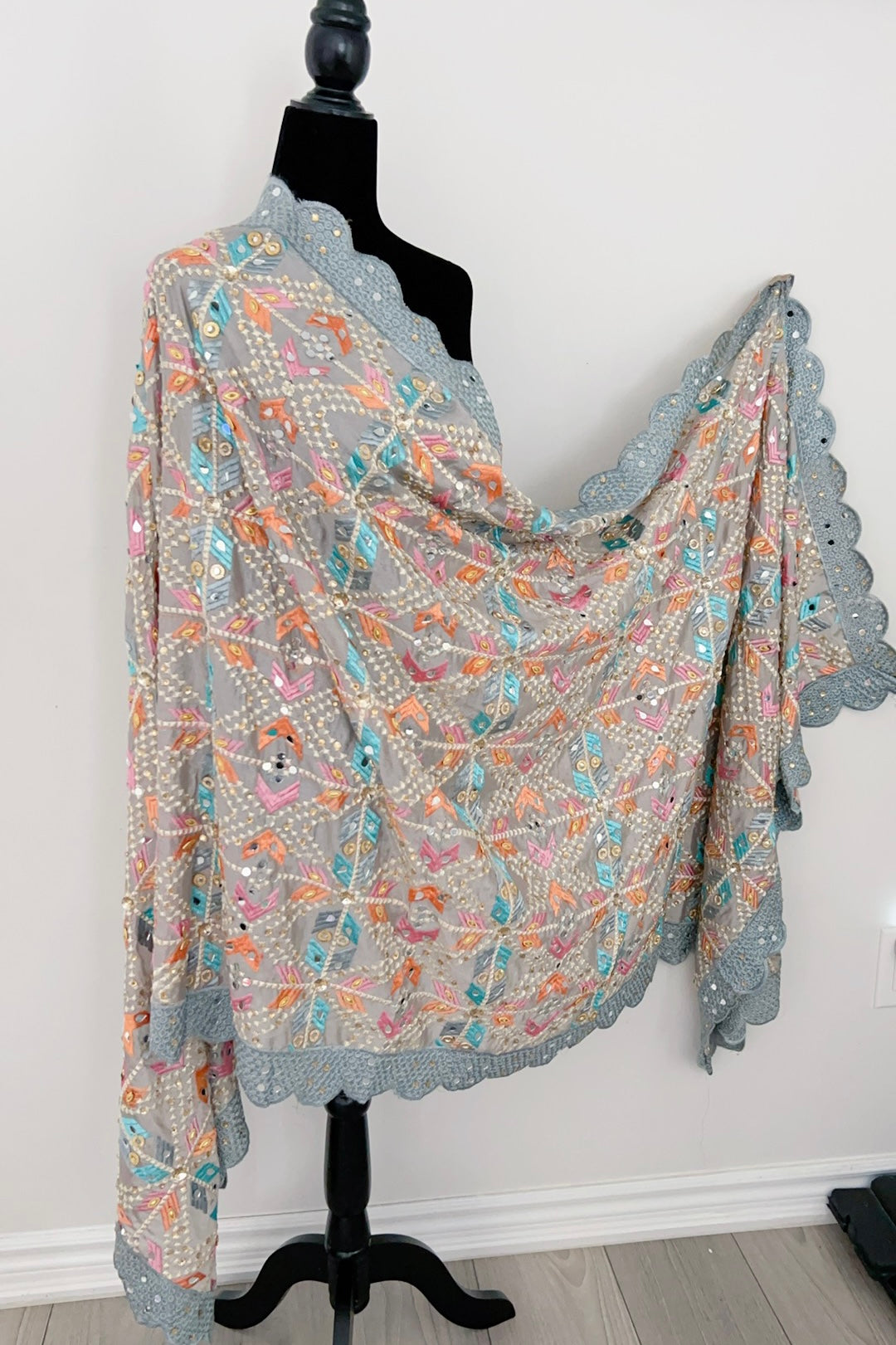 Heavily embroidered phulkari dupatta. This versatile dupatta can be matched with a plain suit for the ultra glam style; ideal for a party or bridal photoshoot; as a Maiyan chunni decor for the bride or groom.