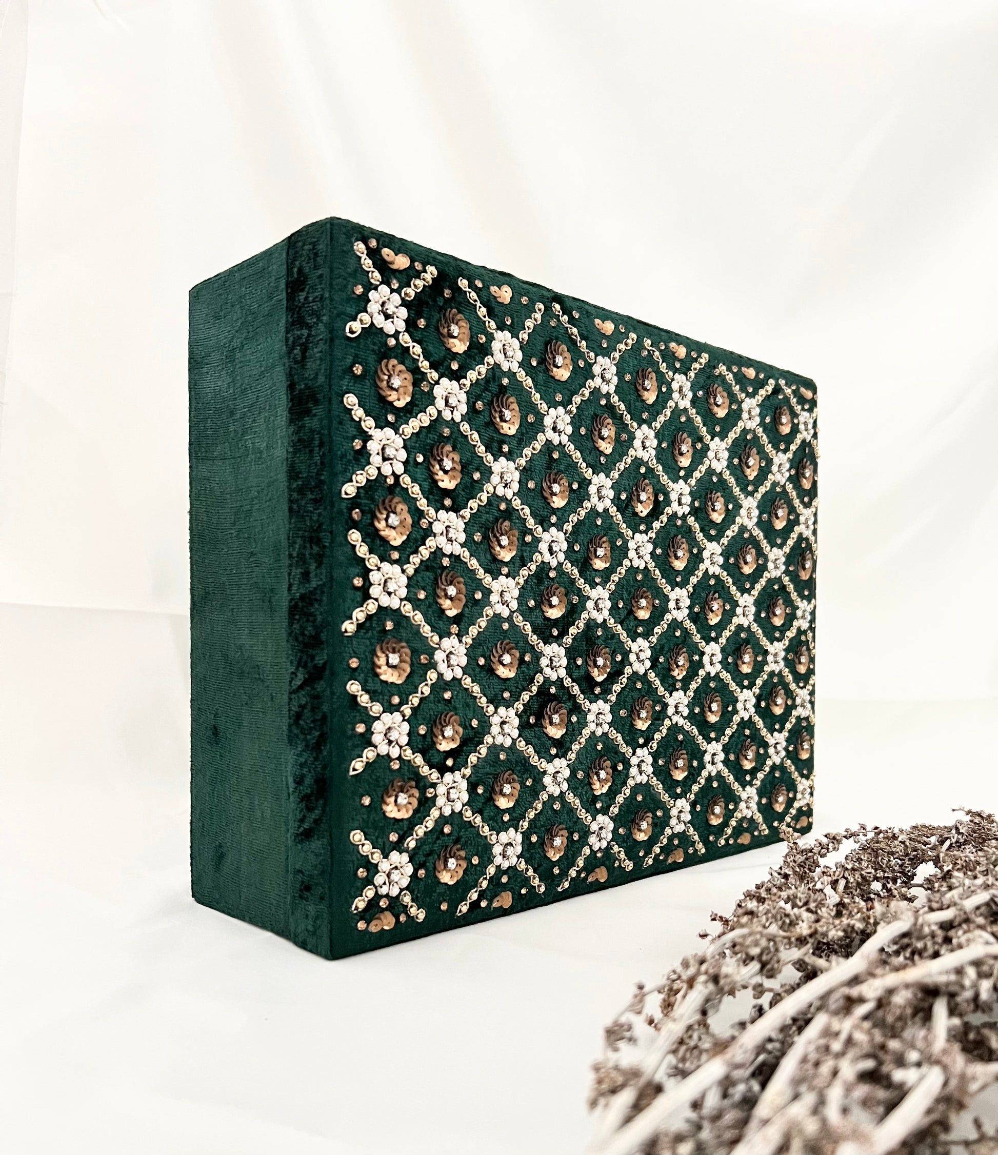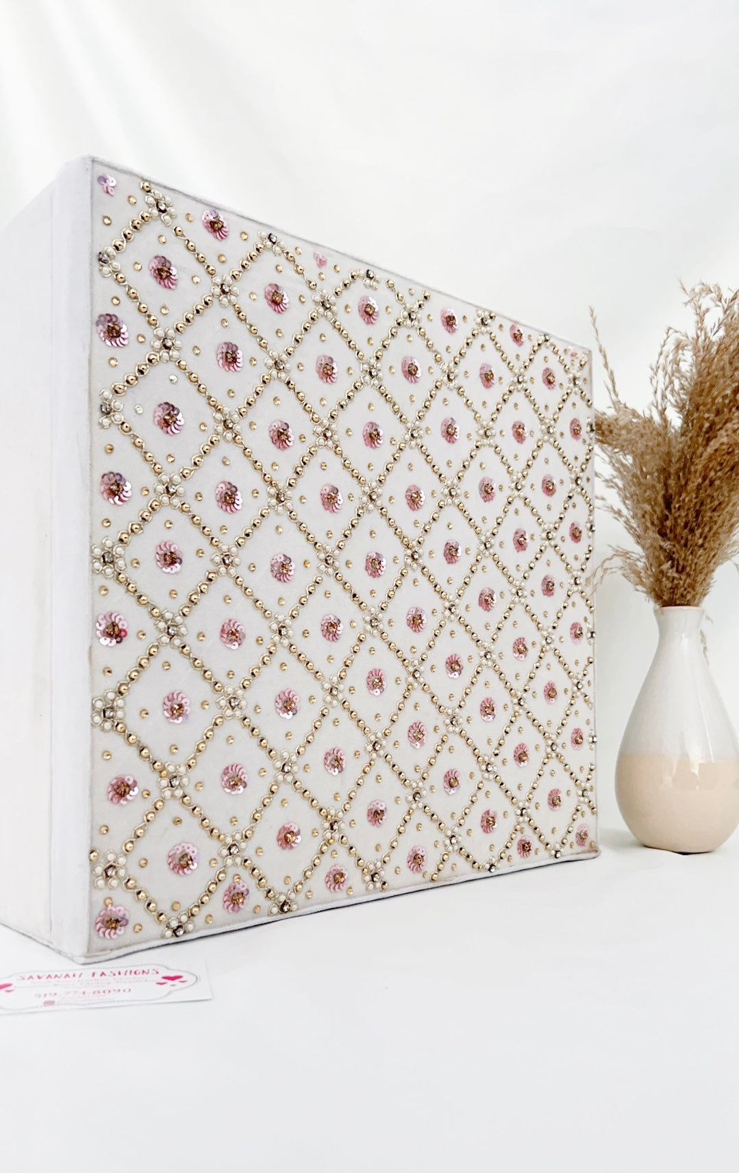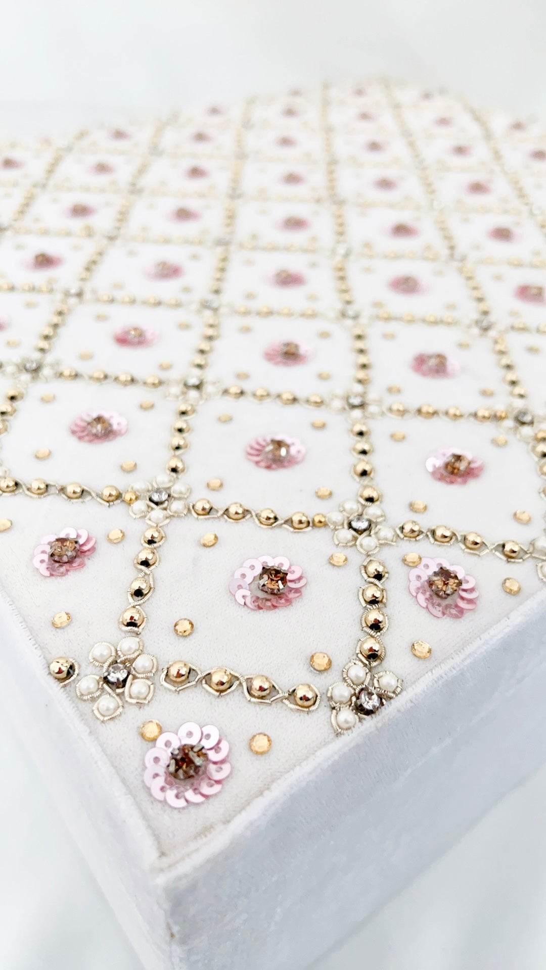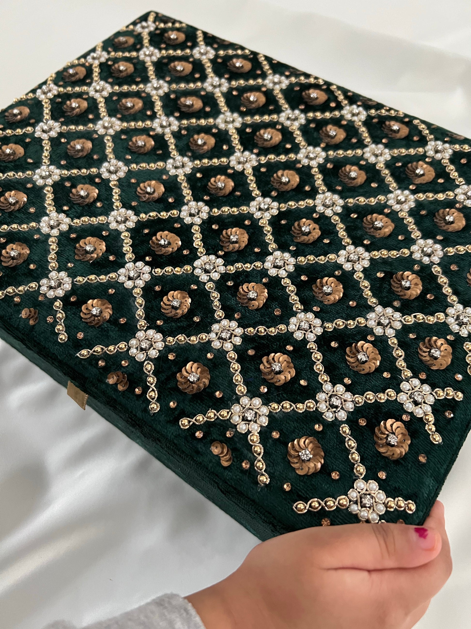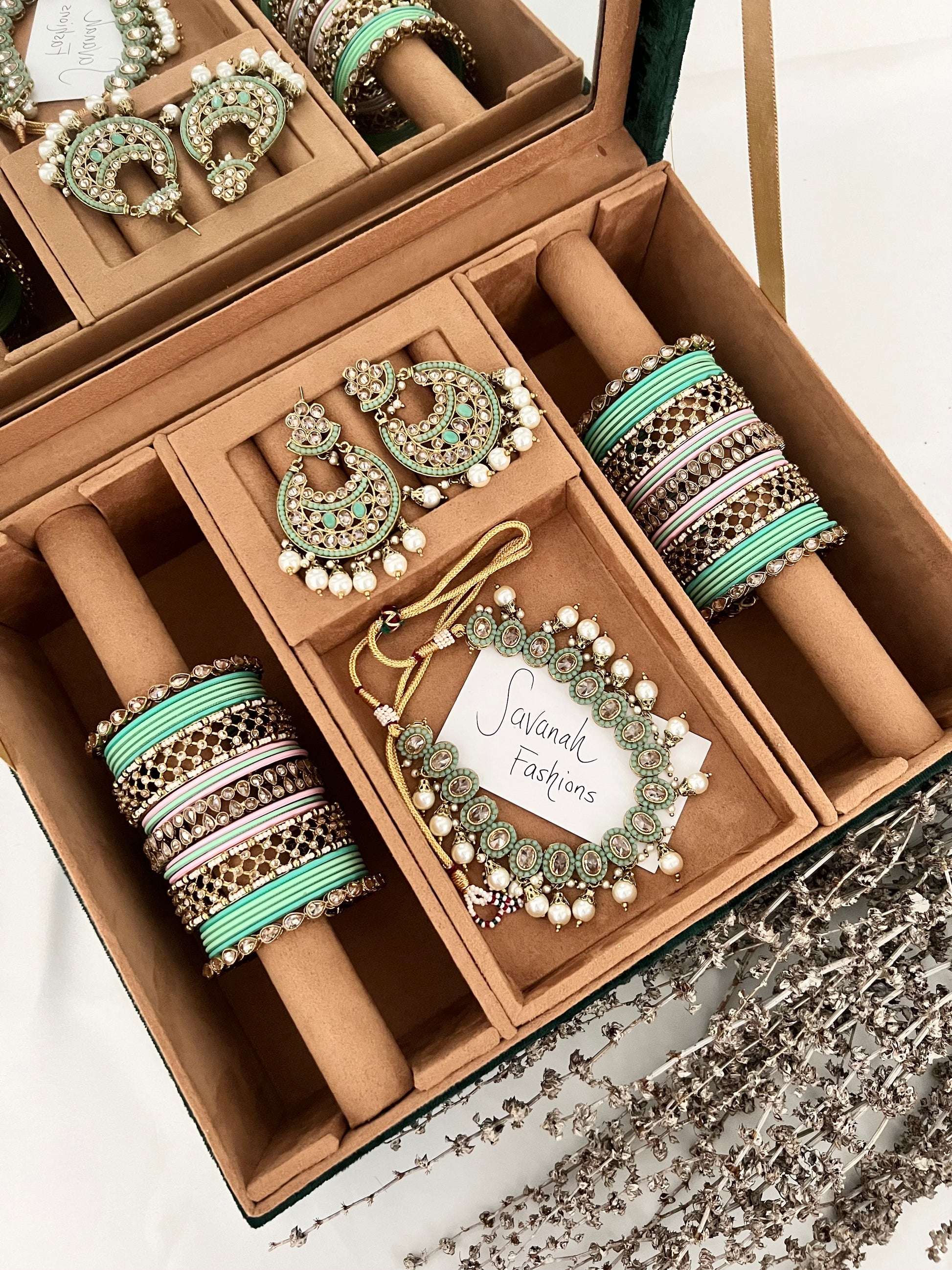 Made with high quality velvet fabric exterior and exquisite one of a kind embroidery, with luxury suede interior, all hand crafted to perfection. It has 3 compartments, 2 bangle sections on each side and middle consisting of a jewellery section. Easily store your jewellery, bangles, rings, and more. It's a versatile box with sections that are conveniently detachable.
