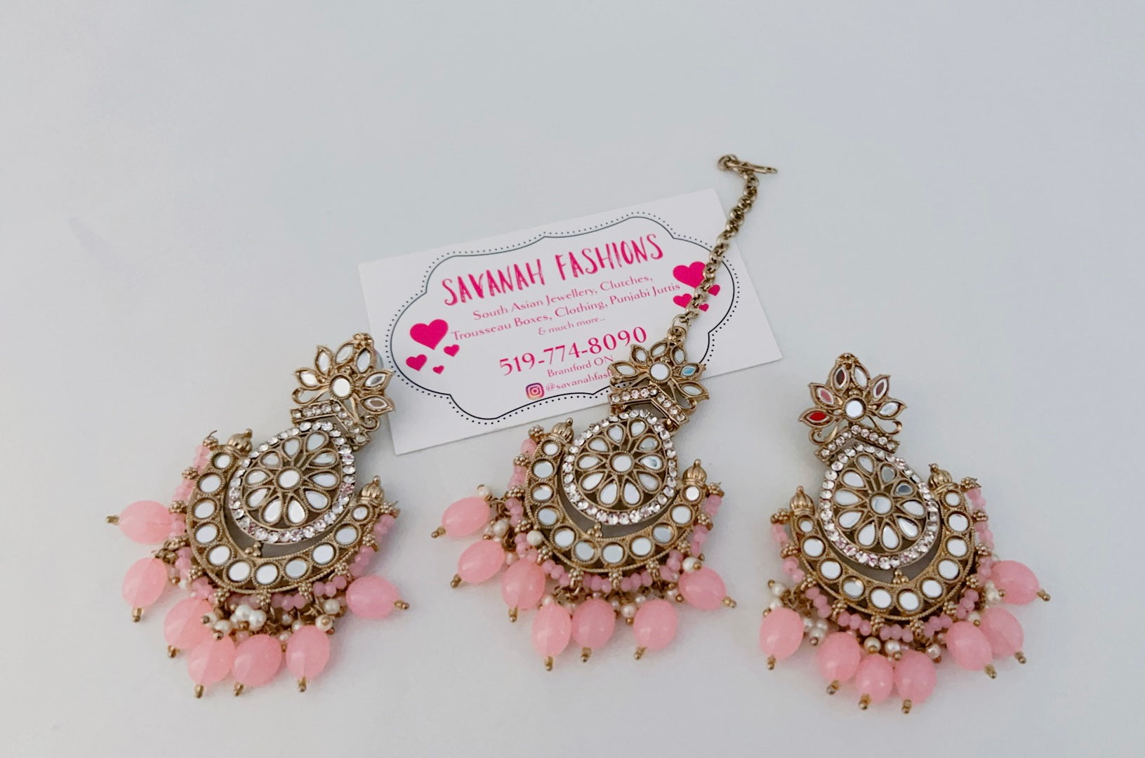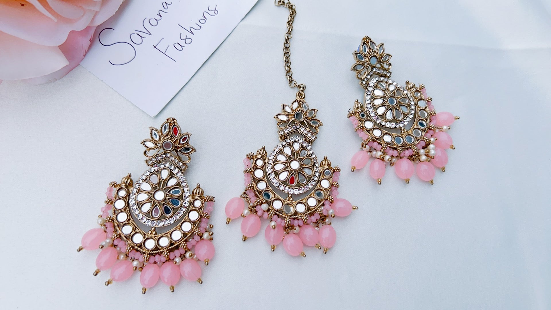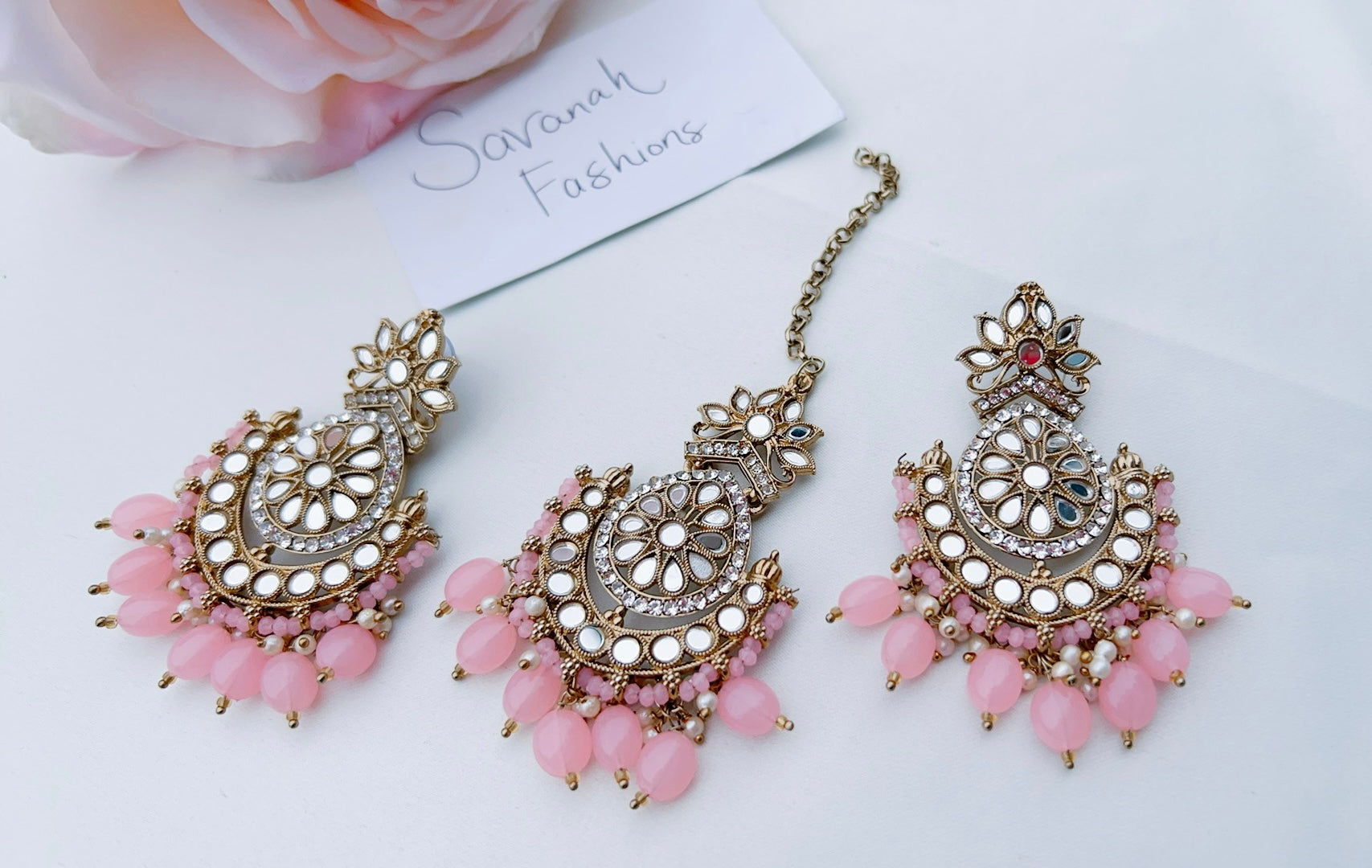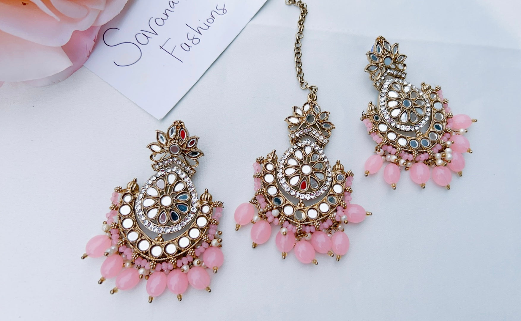 Mirrored tikka set with a hint of baby pink pearls. Lightweight design.