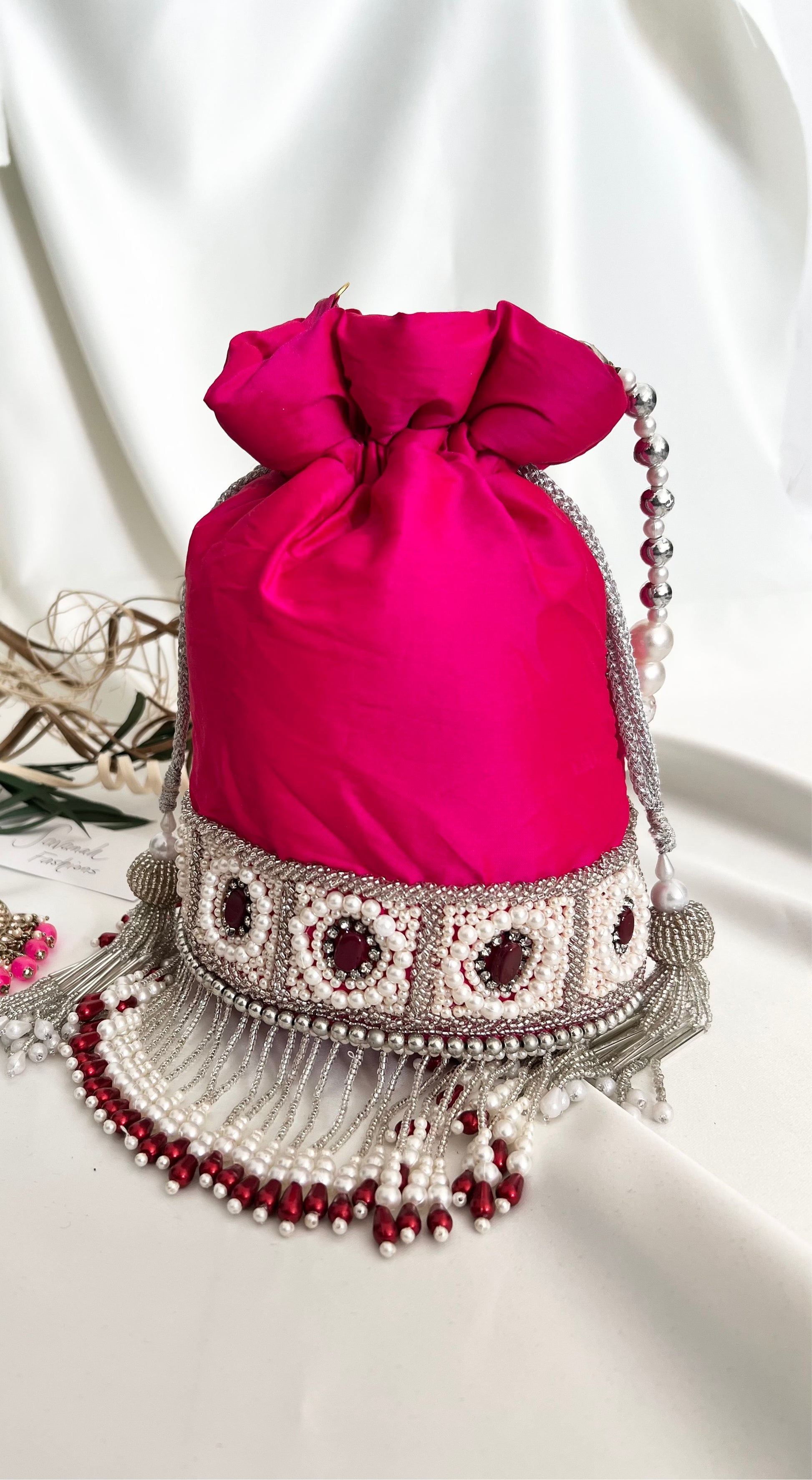 Magenta coloured Potli featured on silk fabric with red stones and pearls.