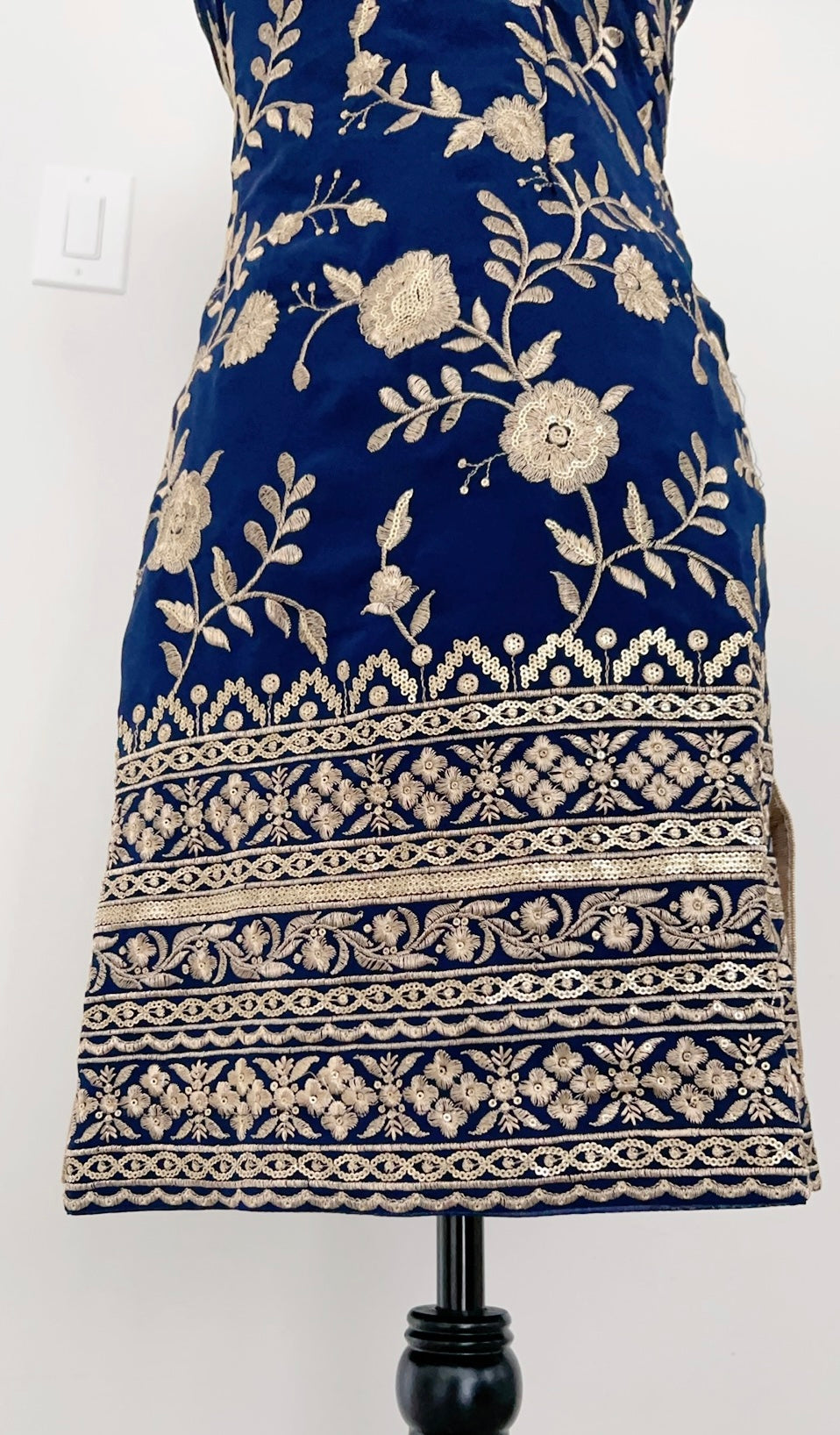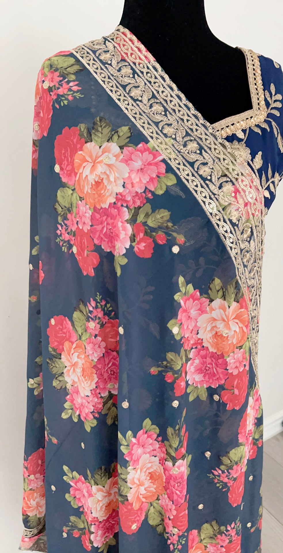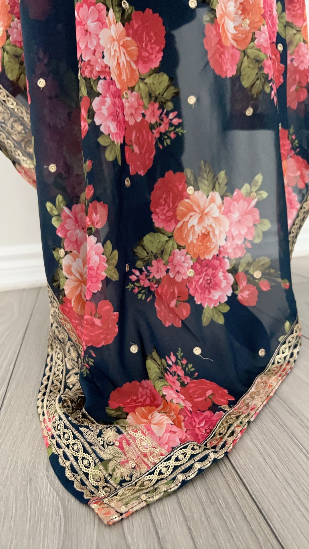 Gorgeous floral dupatta on a royal blue colour, full suit comes with sharara.