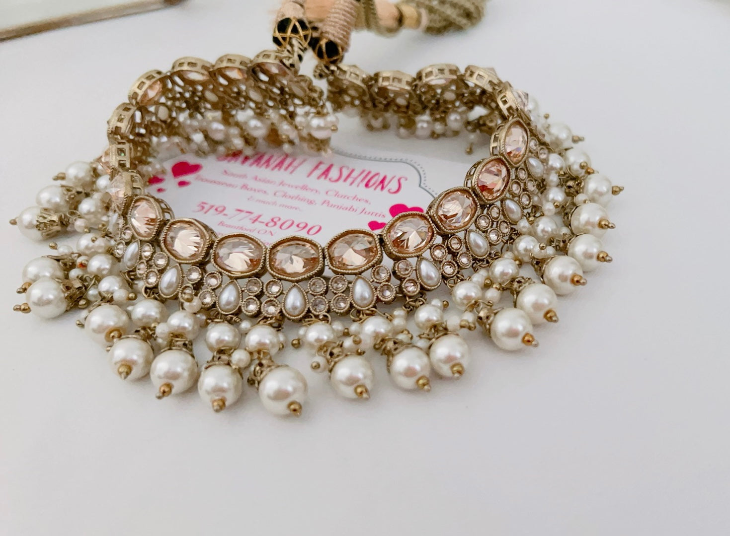 One of my favourite polki designs: this necklace hugs your neck as a choker or sits perfectly on the collar bone. Complete look includes stud earrings with dangly pearls and a round tikka.