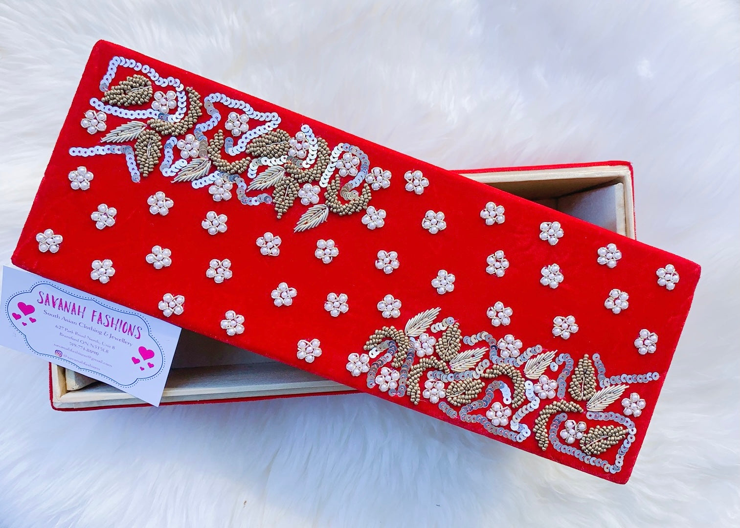 Hand crafted, dabka and pearl embroidery on velvet fabric with raw silk interior.