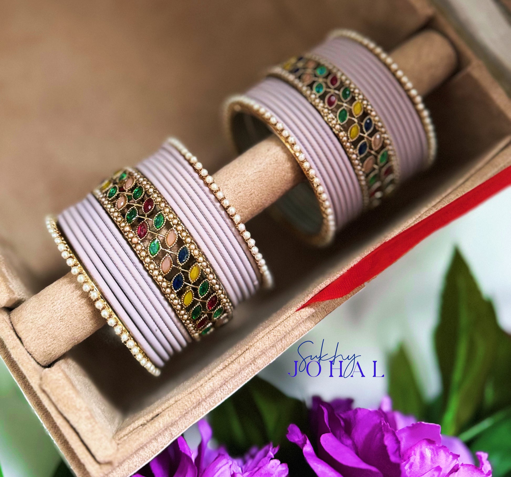 To showcase for you, I used our multicoloured kadey bangles with soft pastel lilac shade plain bangles.