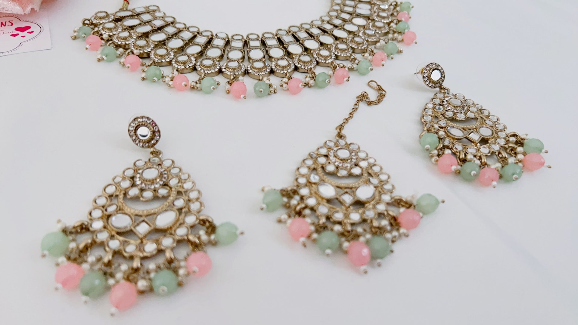 The famous sage green baby pink combination for this mirror necklace set. Full set includes: necklace, earrings, and tikka. Lightweight design for comfort.