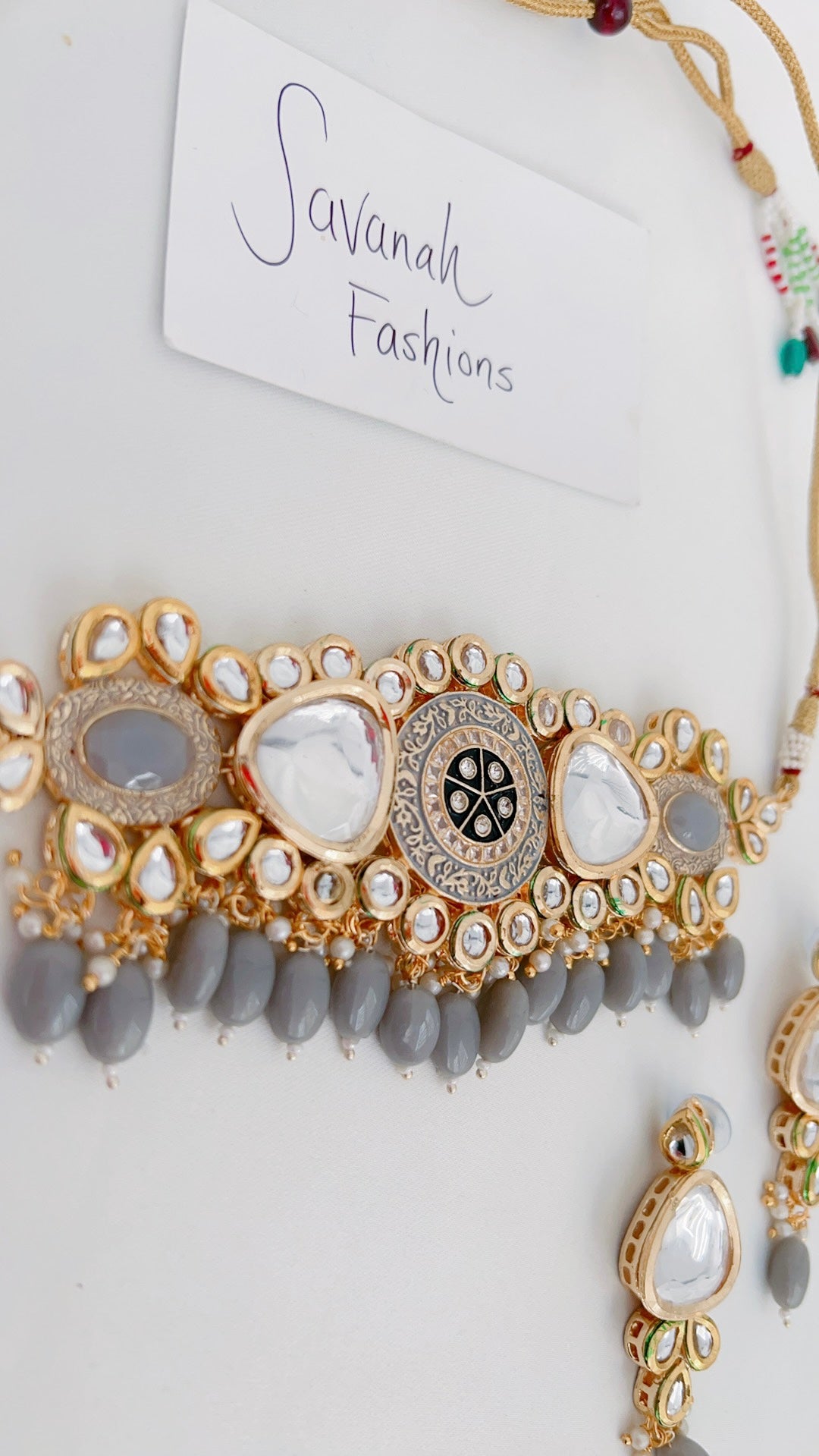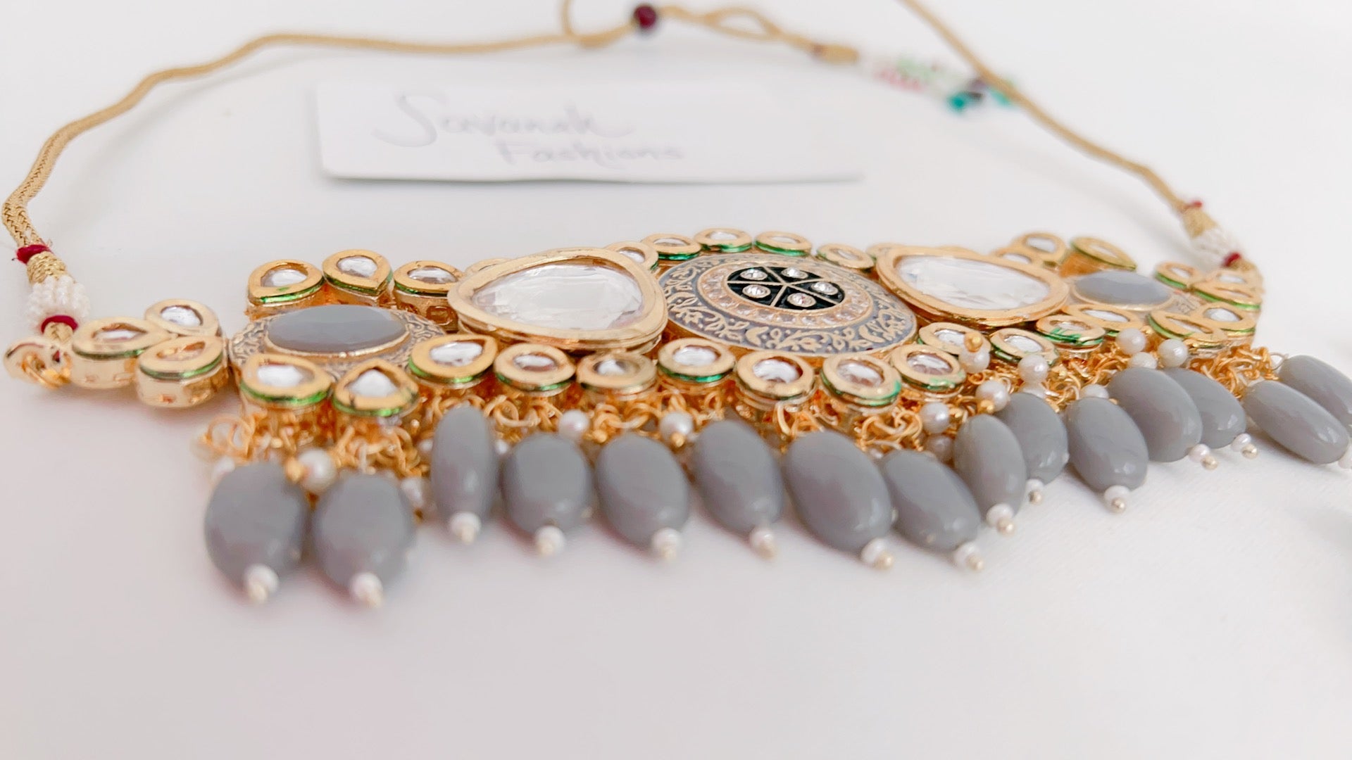 Necklace set designed with kundan and a grey accent. Set consists of necklace and earrings.