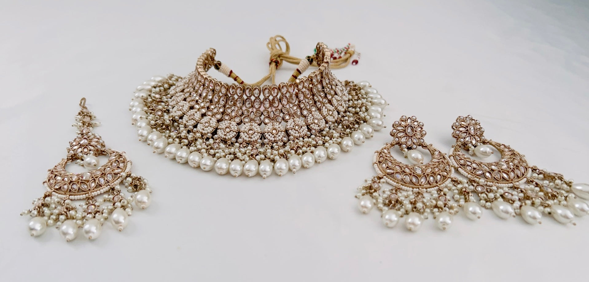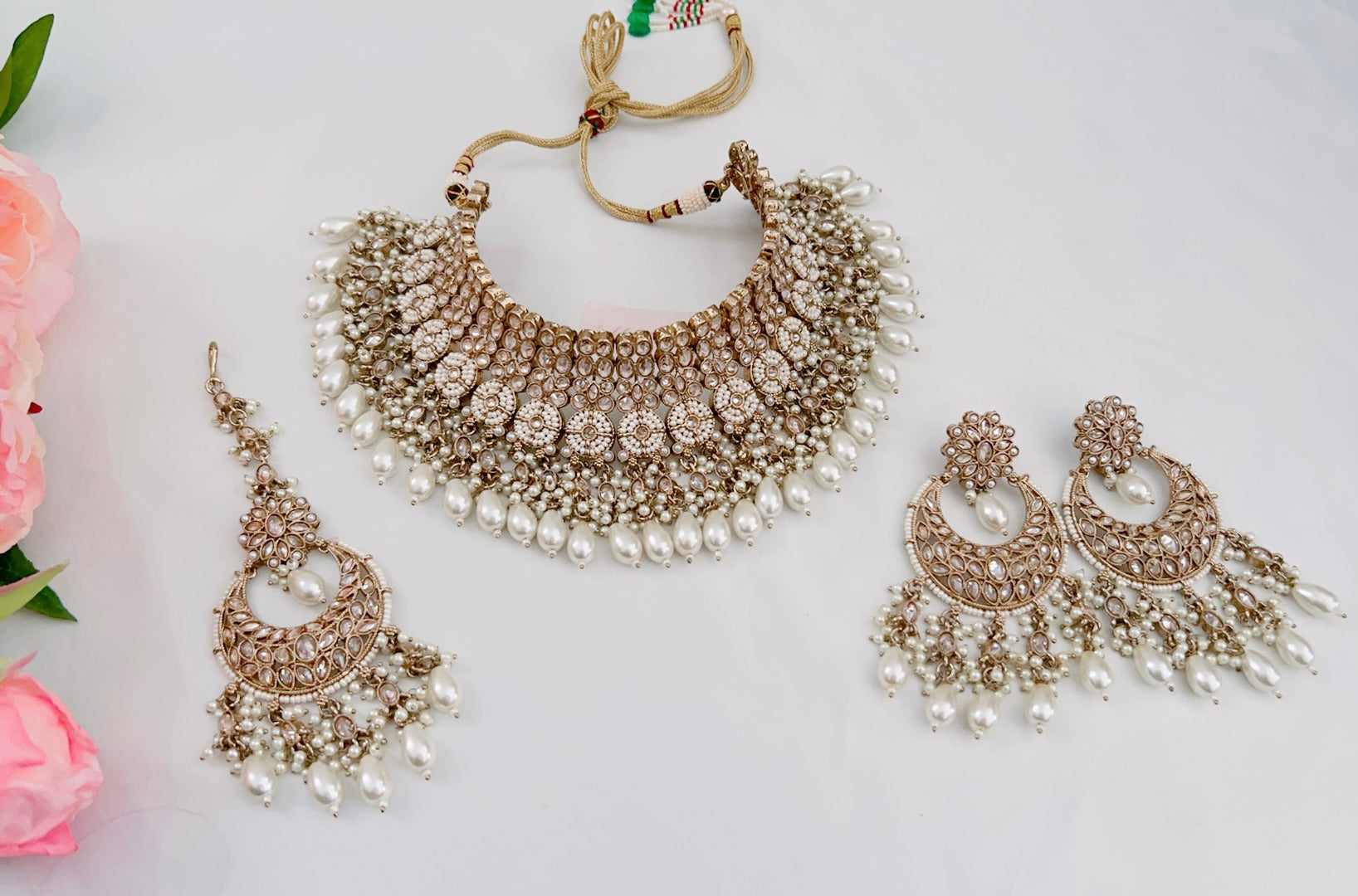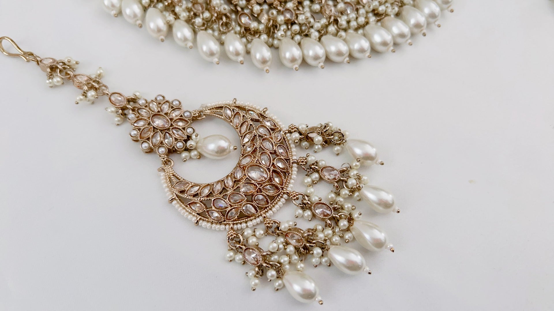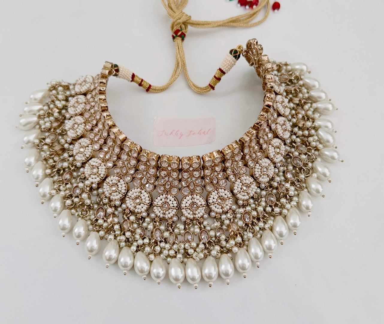 A superior quality gracious necklace set that comes with earrings and a tikka. We have used high quality polki material and with pearls - that will not loose their colour or peel away over time. Delicately hand crafted to perfection.