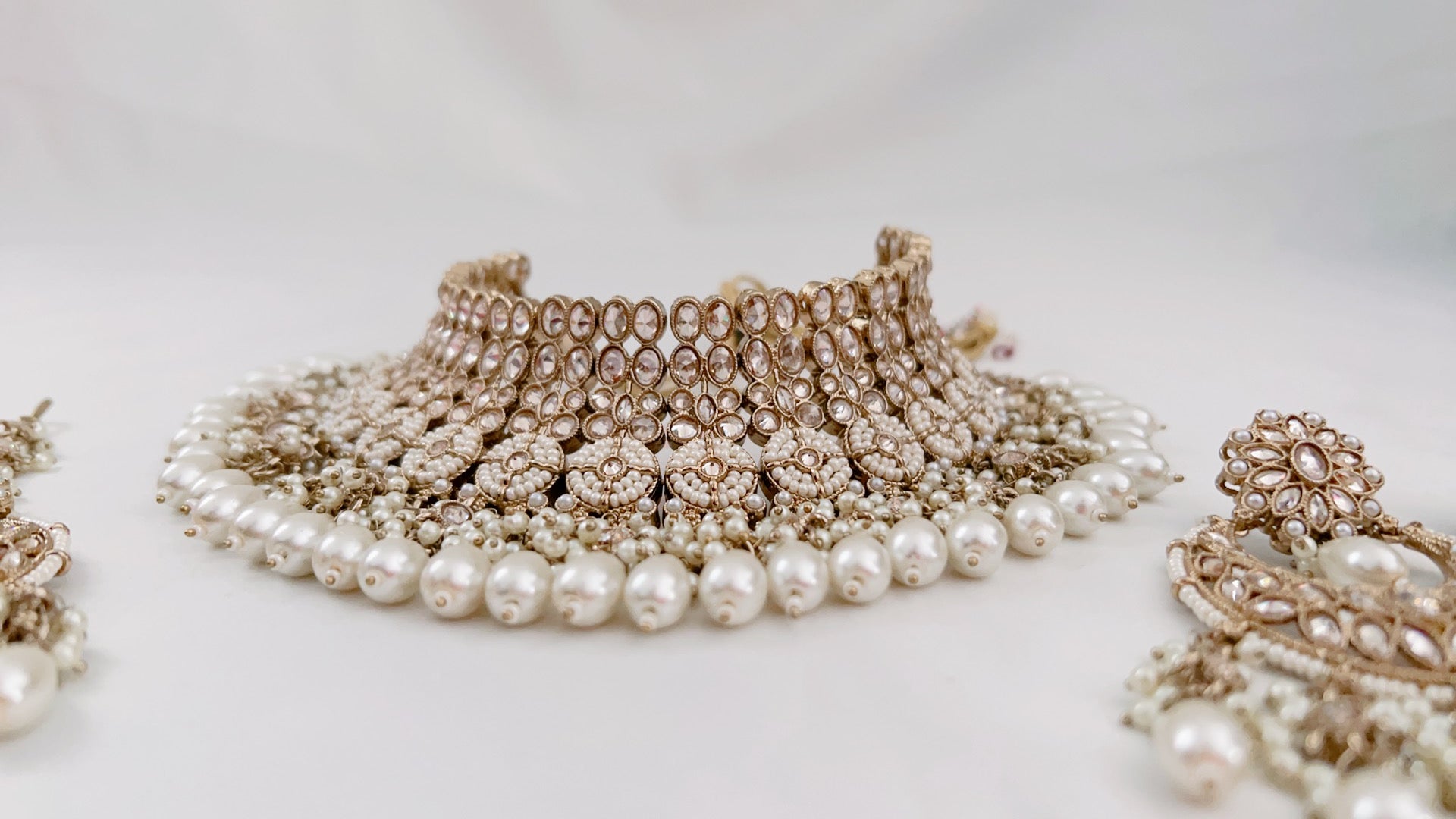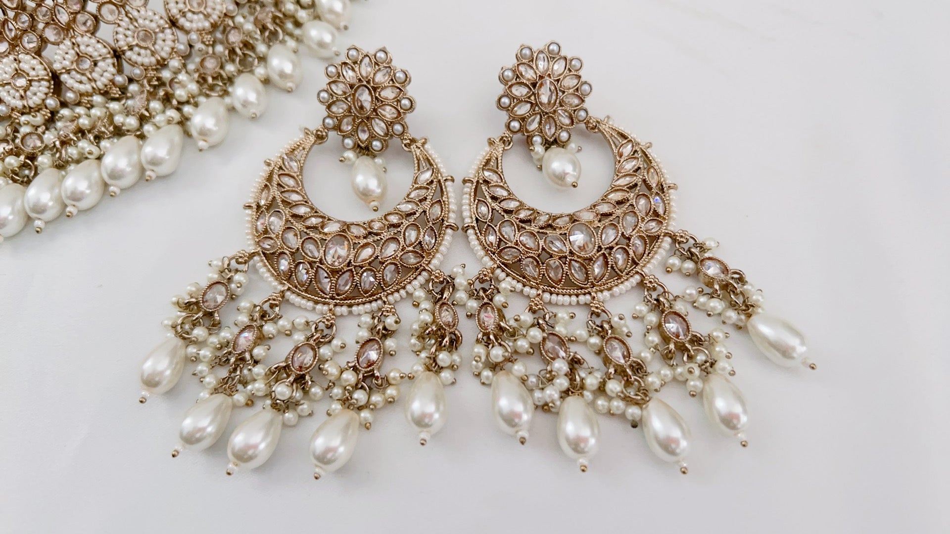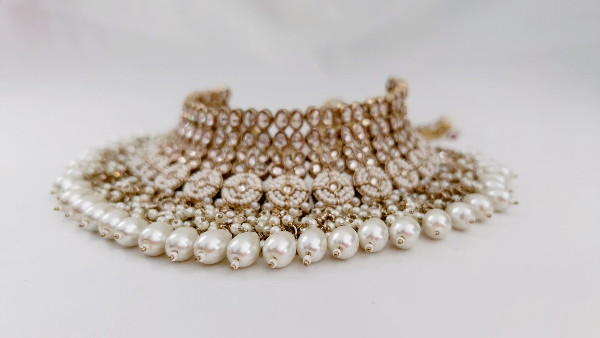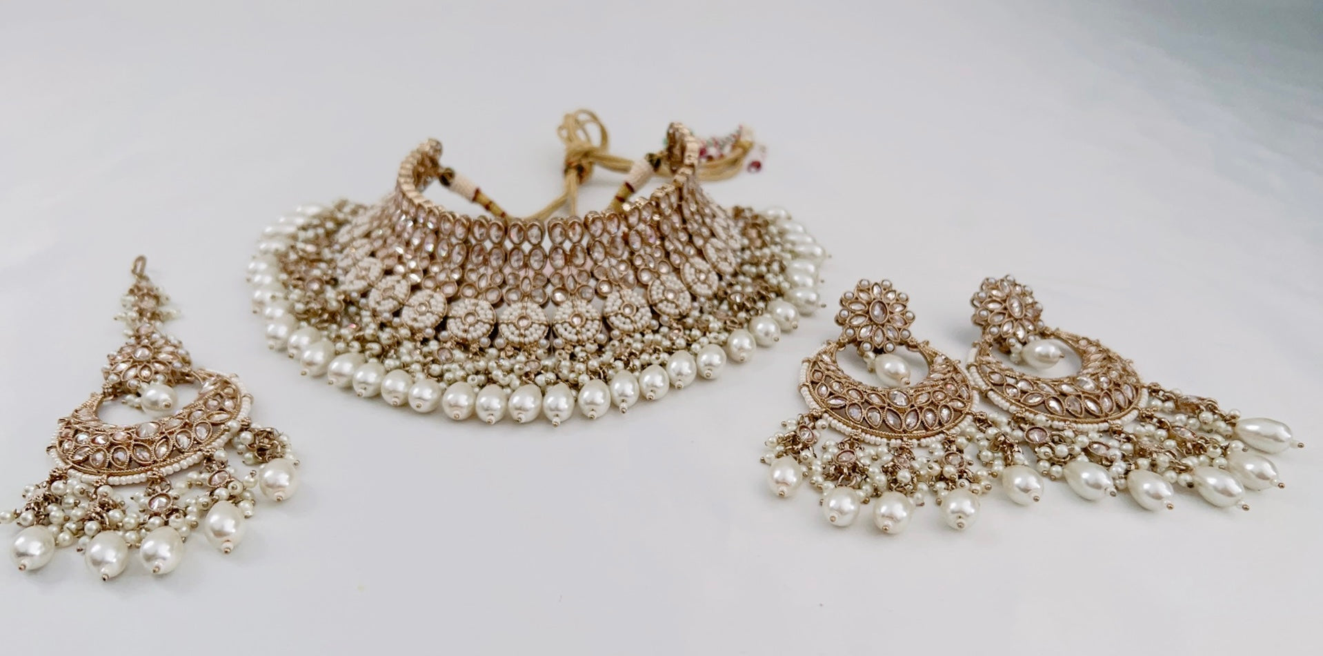 A superior quality gracious necklace set that comes with earrings and a tikka. We have used high quality polki material and with pearls - that will not loose their colour or peel away over time. Delicately hand crafted to perfection.