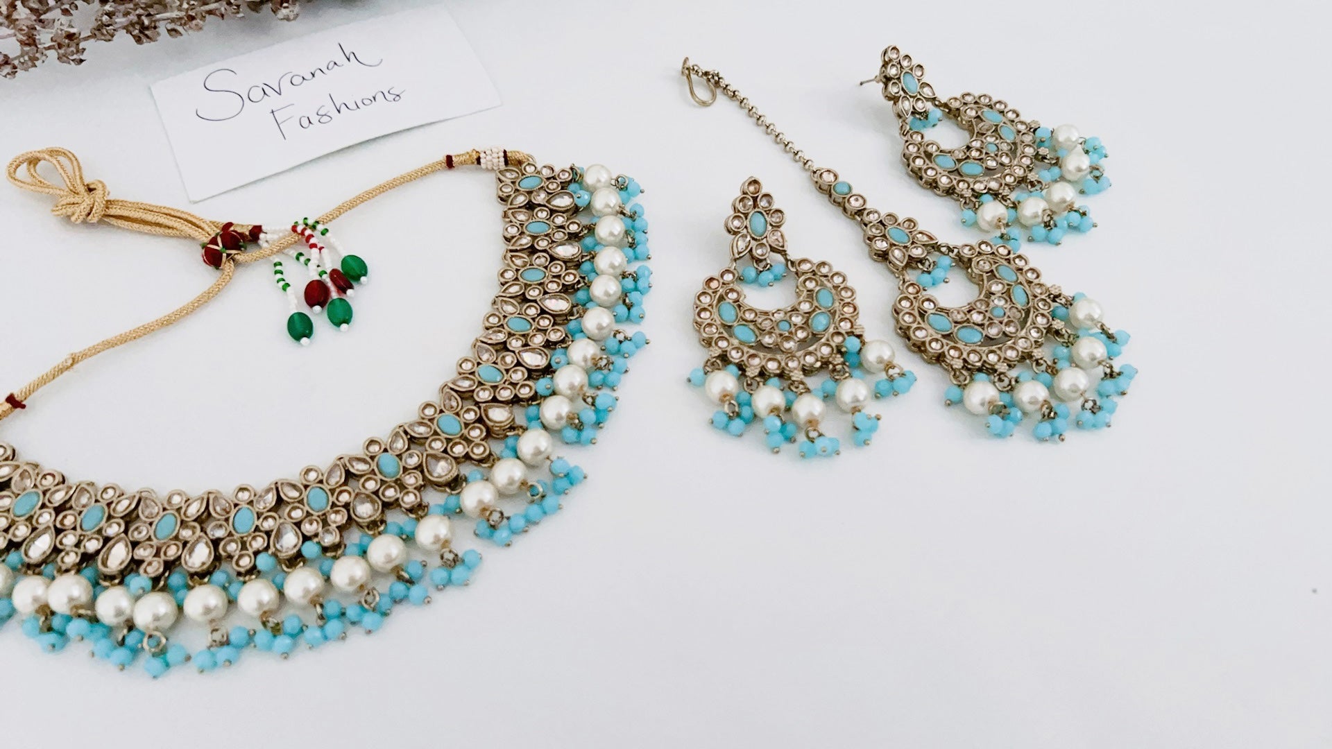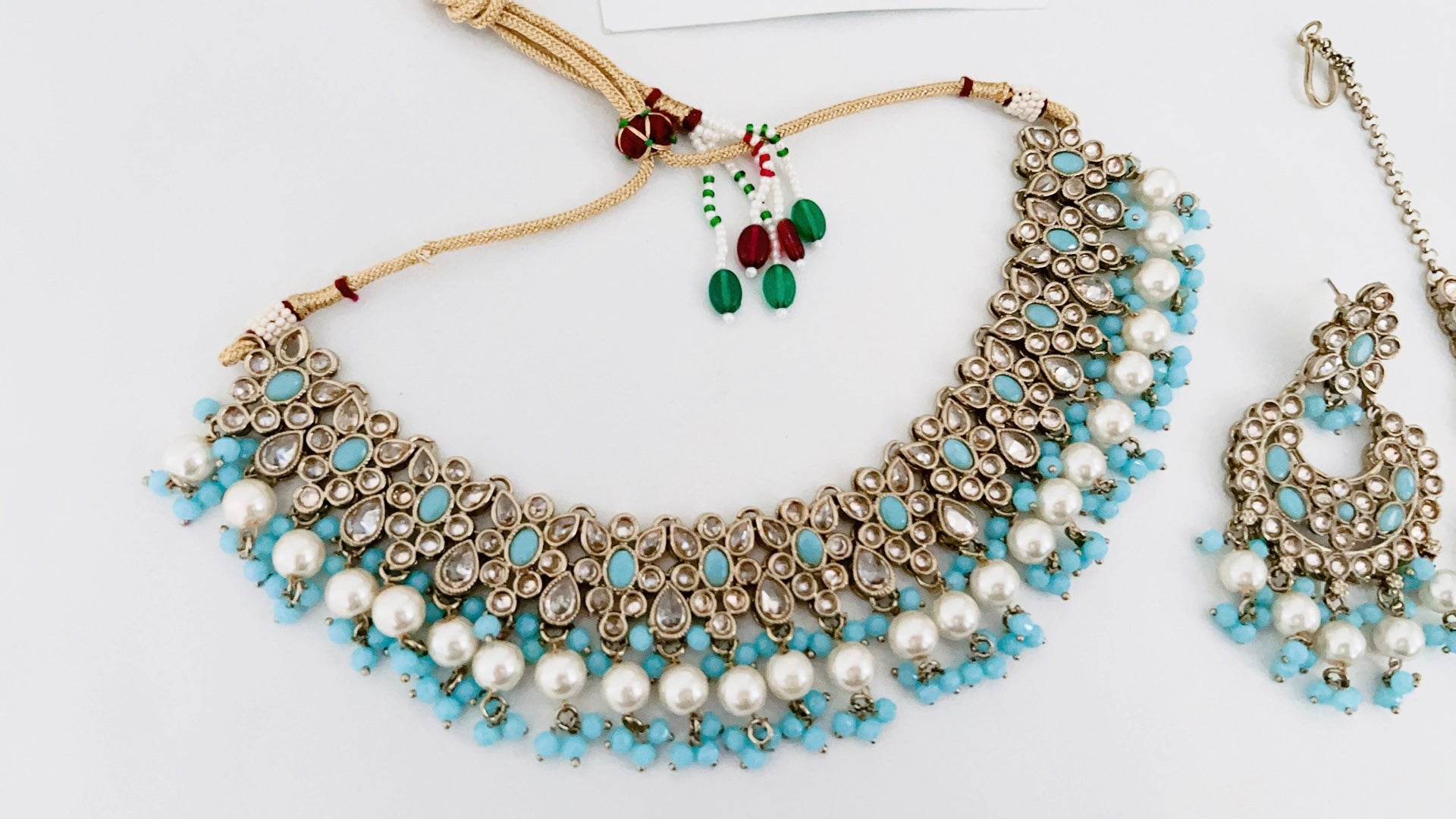 Beautiful pearl and blue combination. Full set includes: Necklace (that can be worn as a choker), earrings, and tikka.
