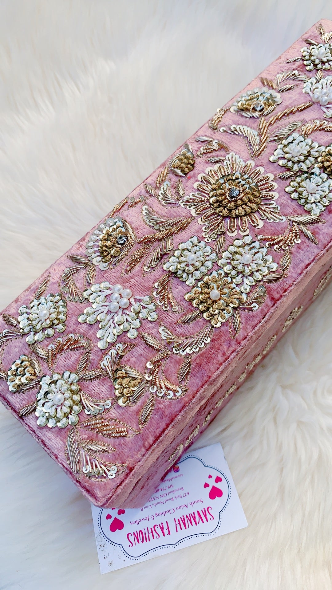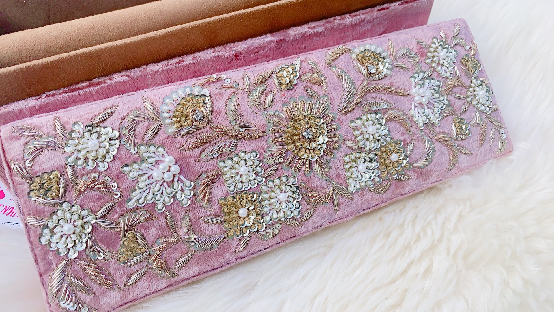 Hand embroidery on high quality velvet fabric with suede interior.