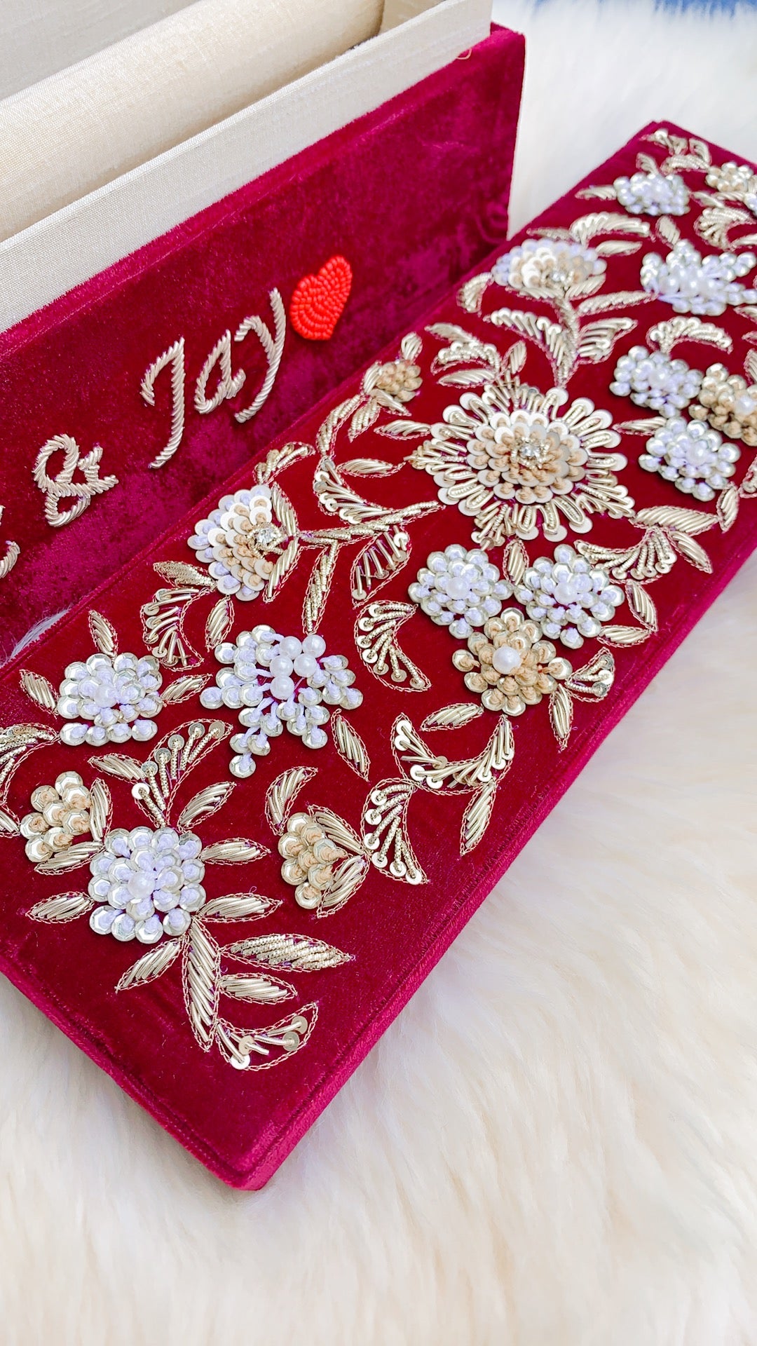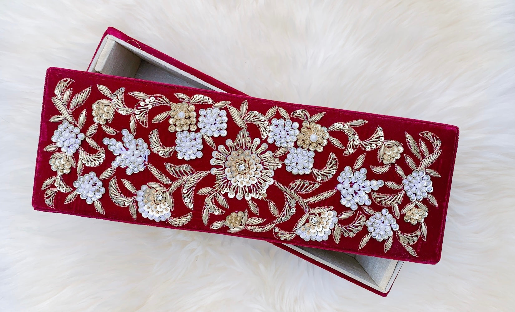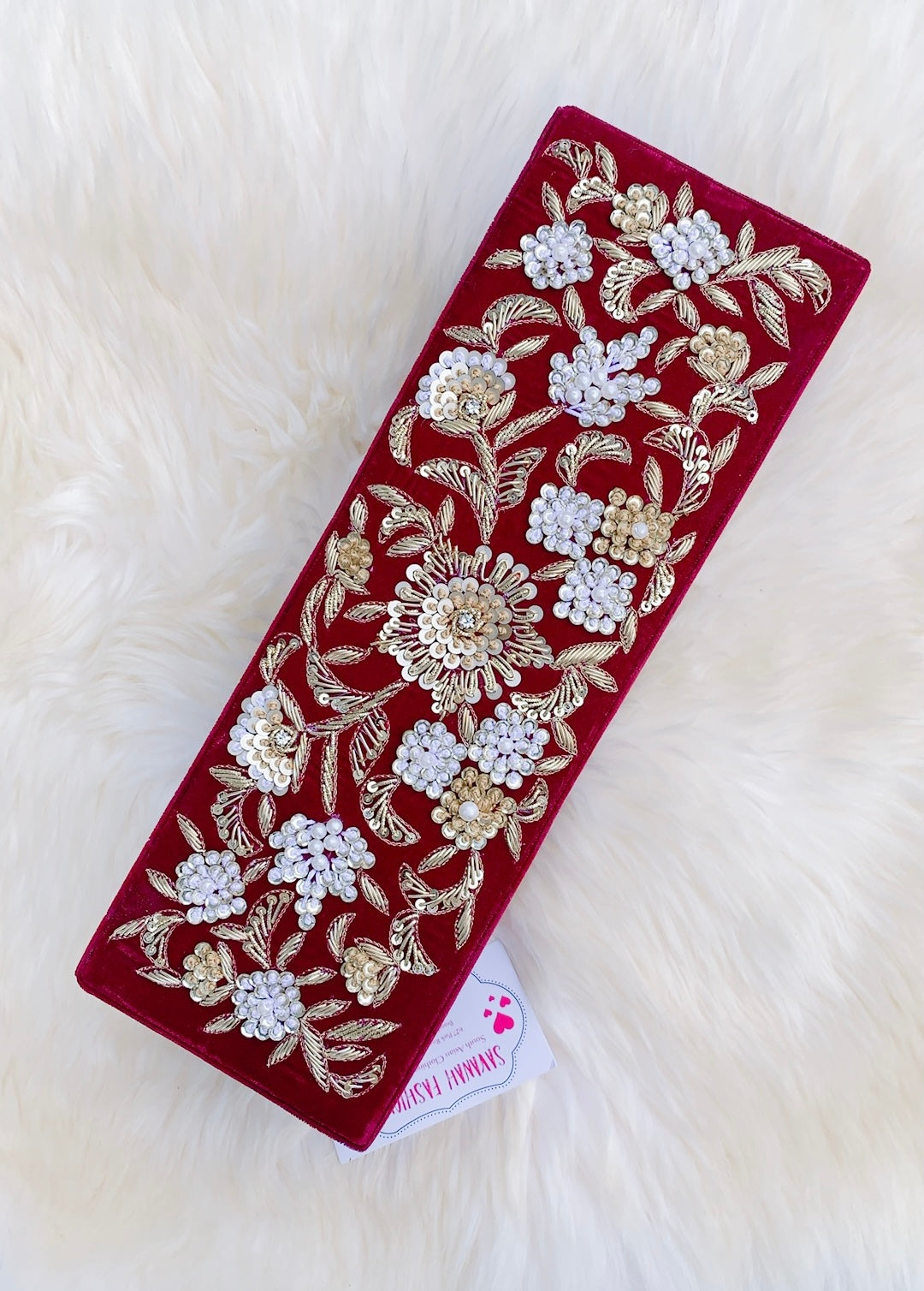 Hand embroidery on high quality smooth velvet fabric with suede interior.