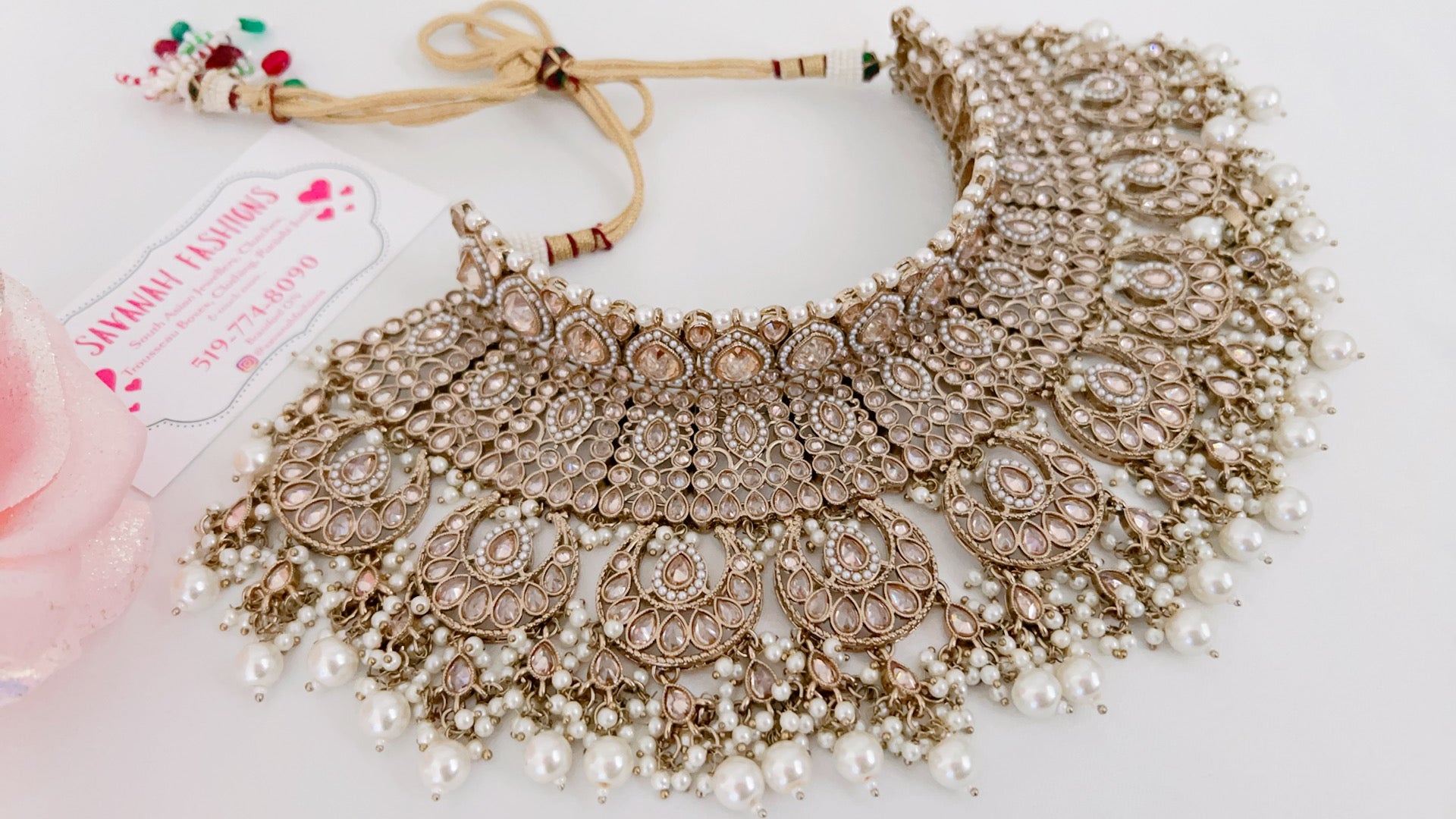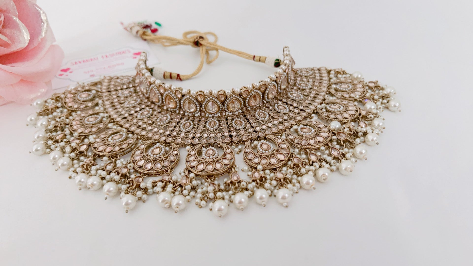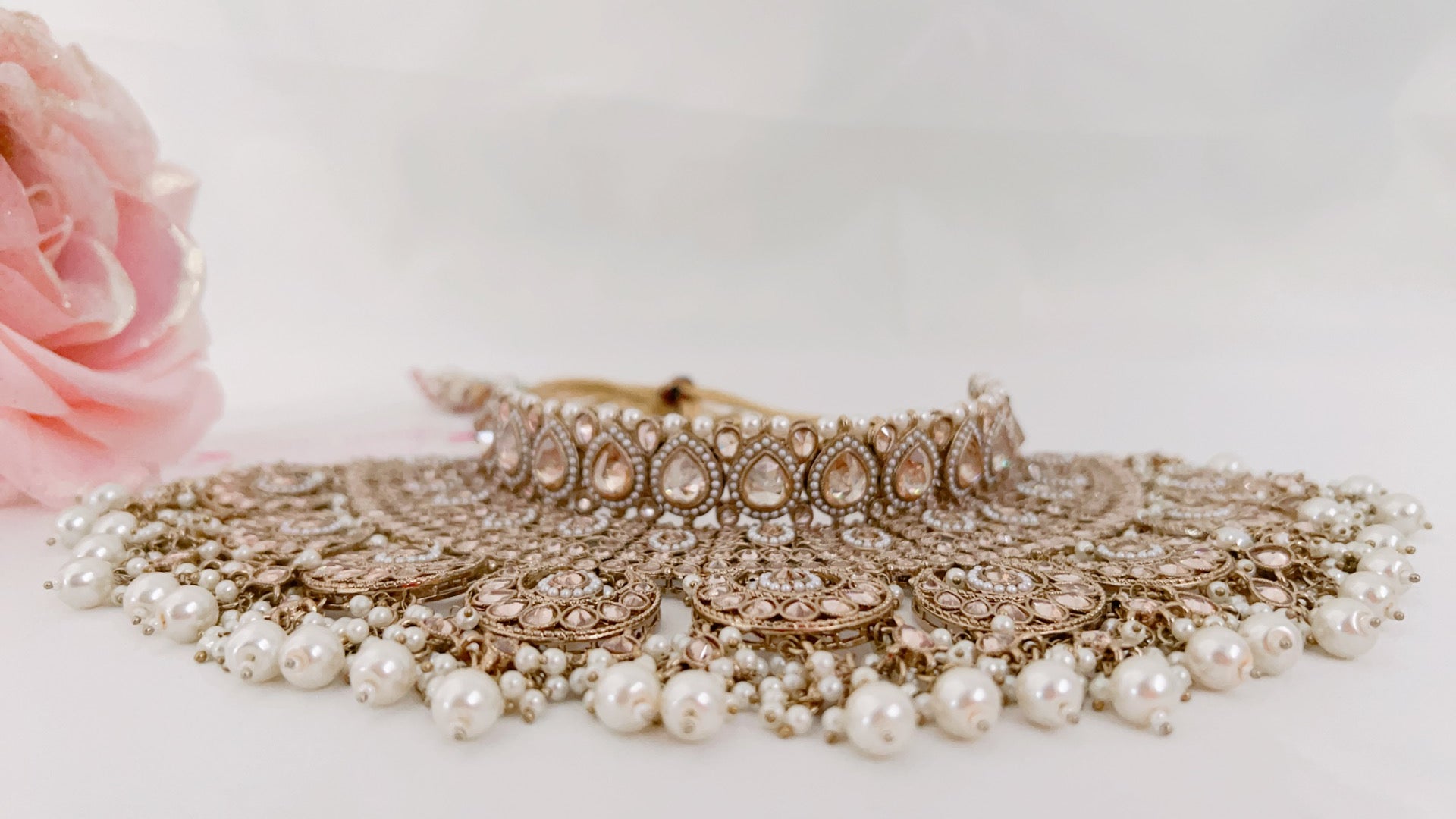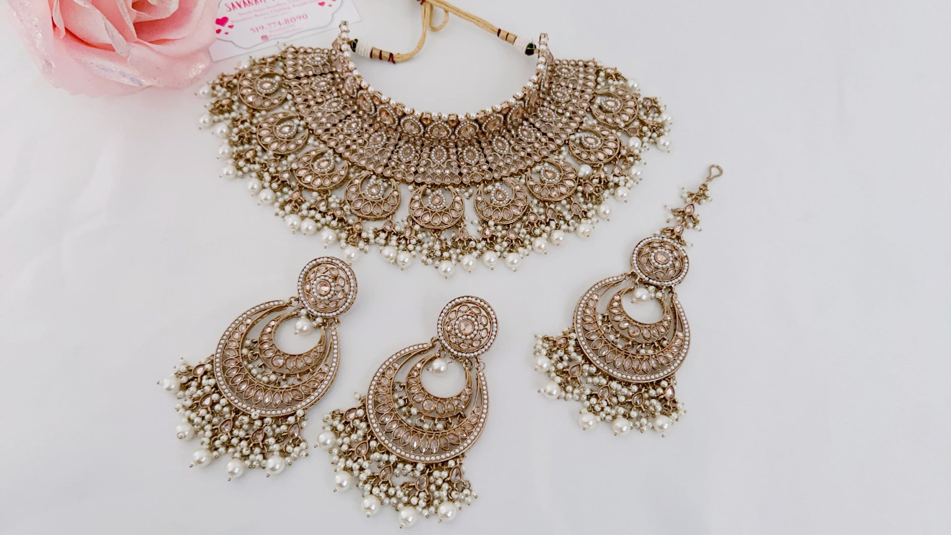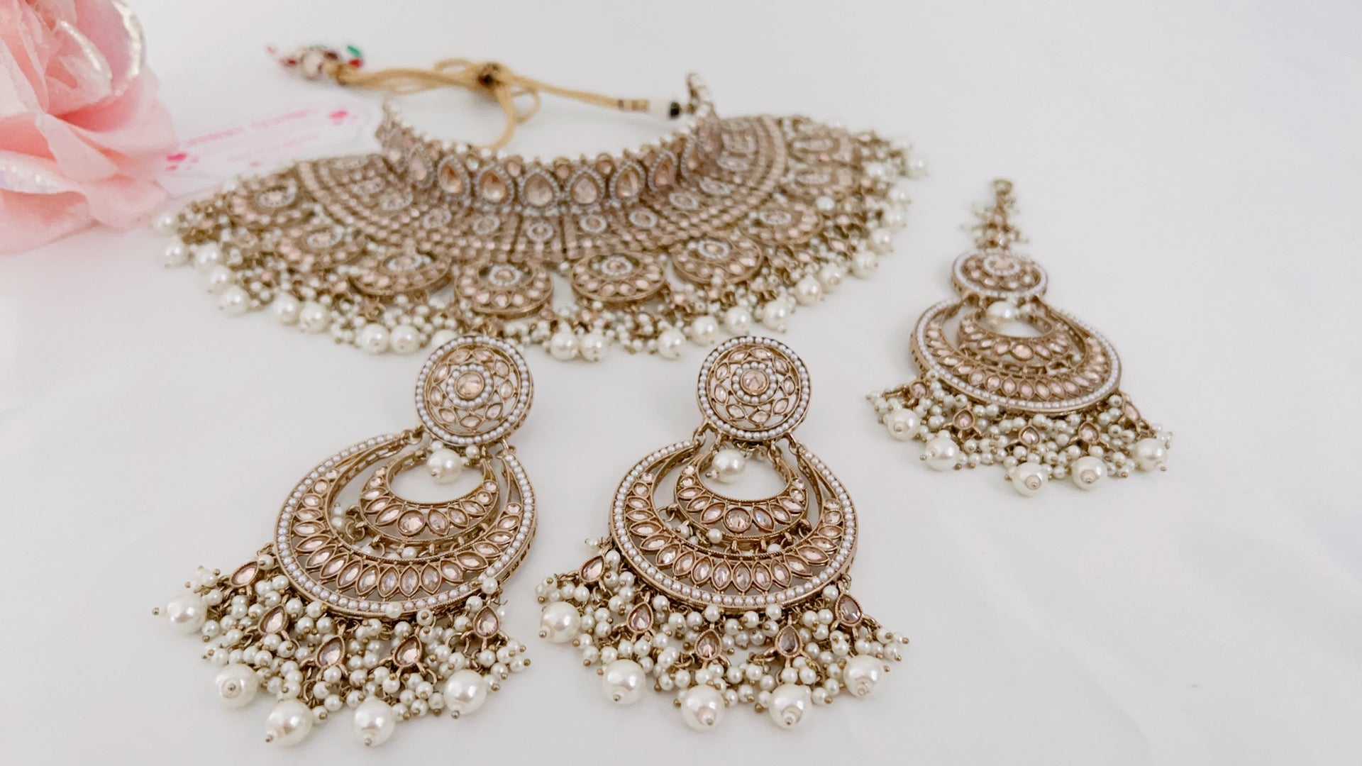Semi-Bridal polki set consisting of a heavy choker, earrings, and Tikka. The perfect glam for the minimalist bride.