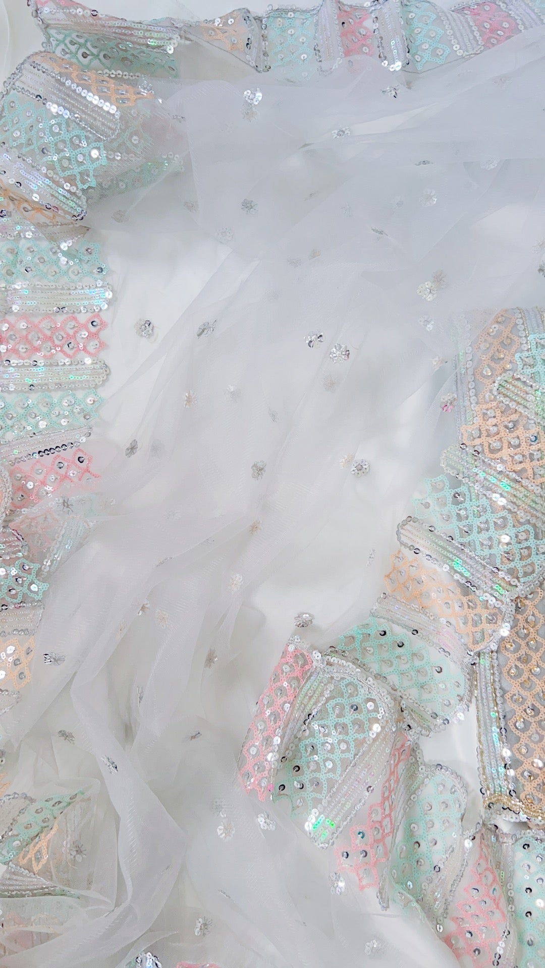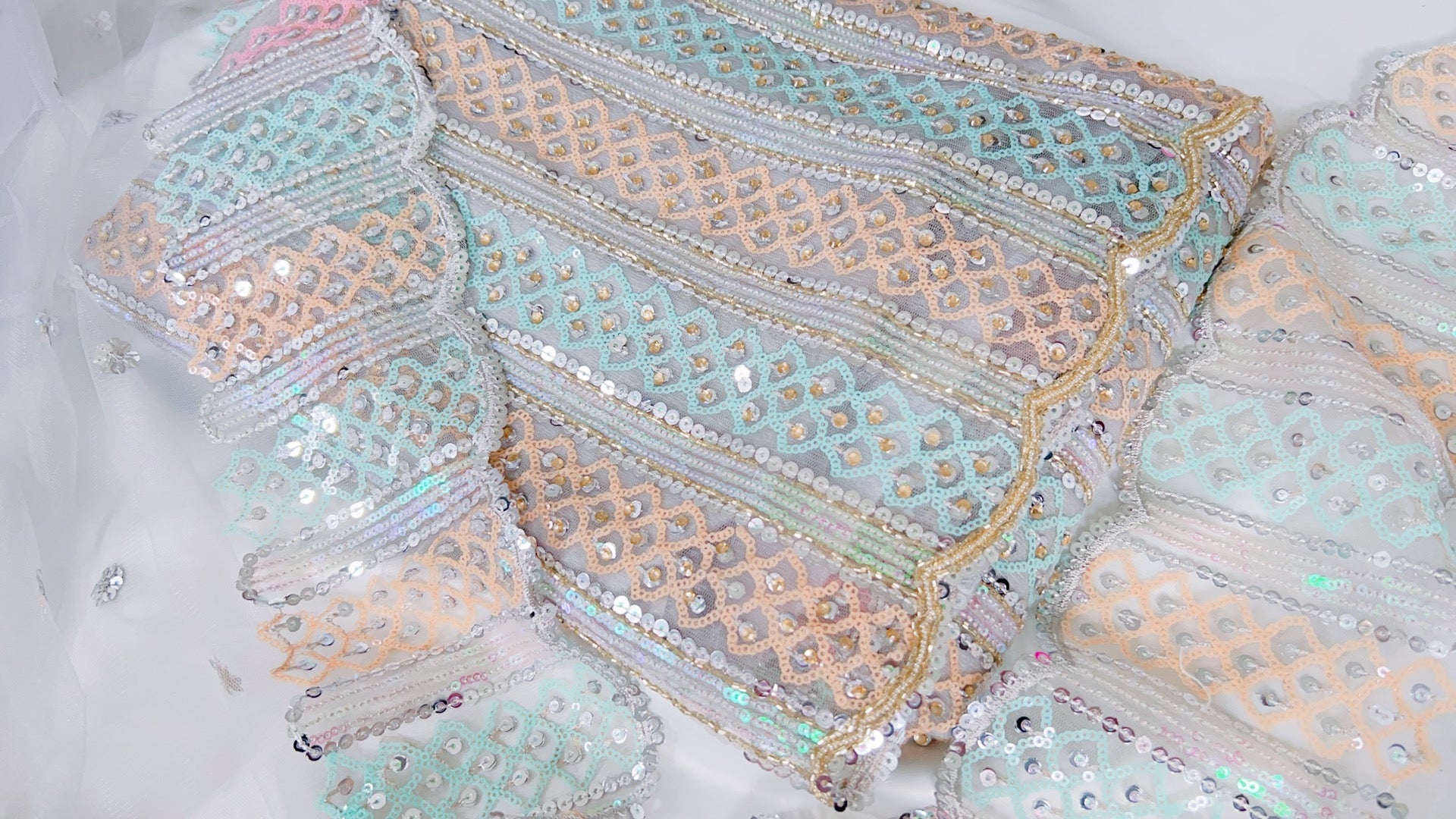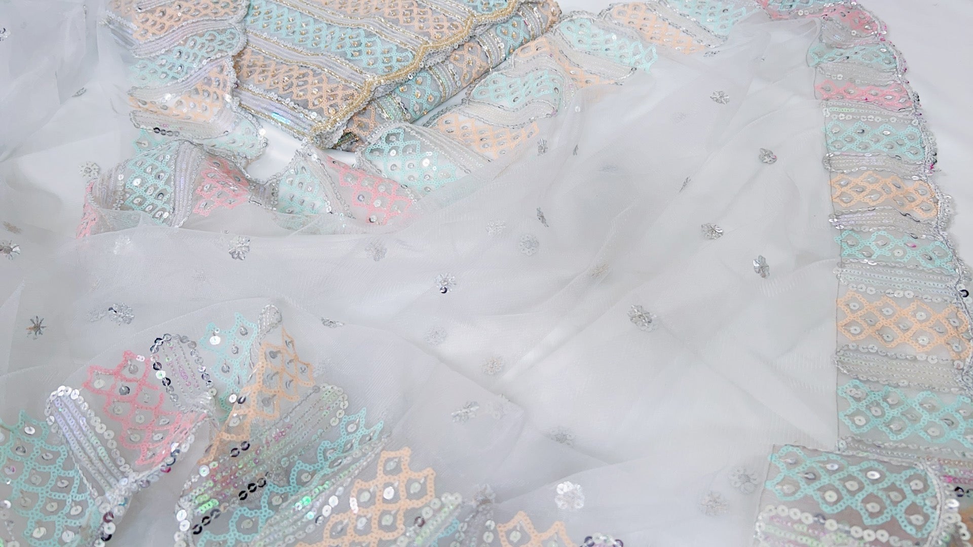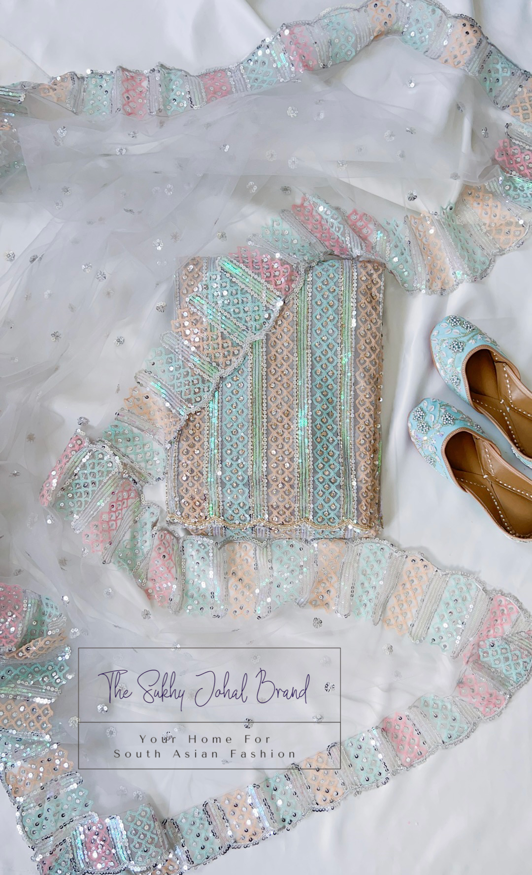 Our Karena suit is embellished with bead and sippi work all over the kameez giving you all the shimmer feels, with a very light shade of grey bottoms and net dupatta. A pastel colour combination that will take your breath away.